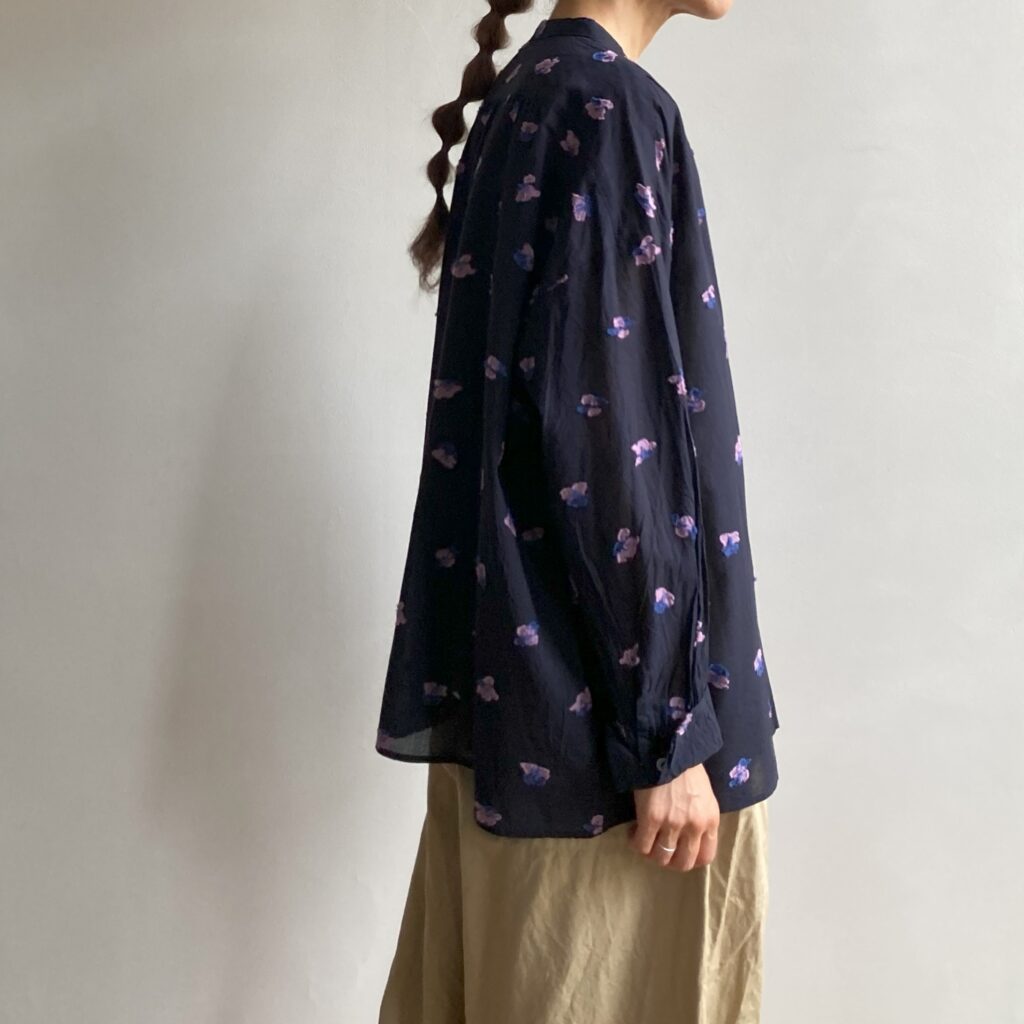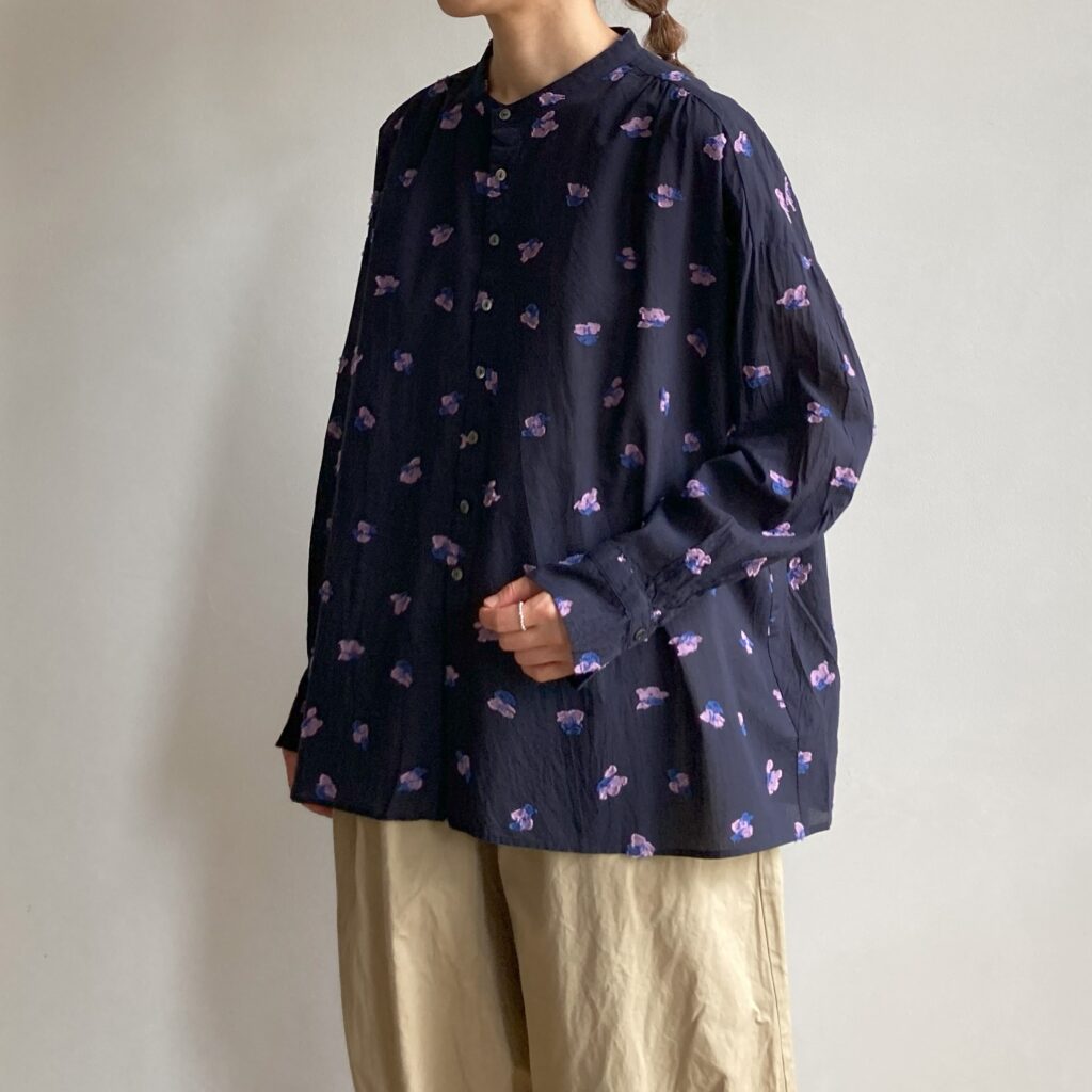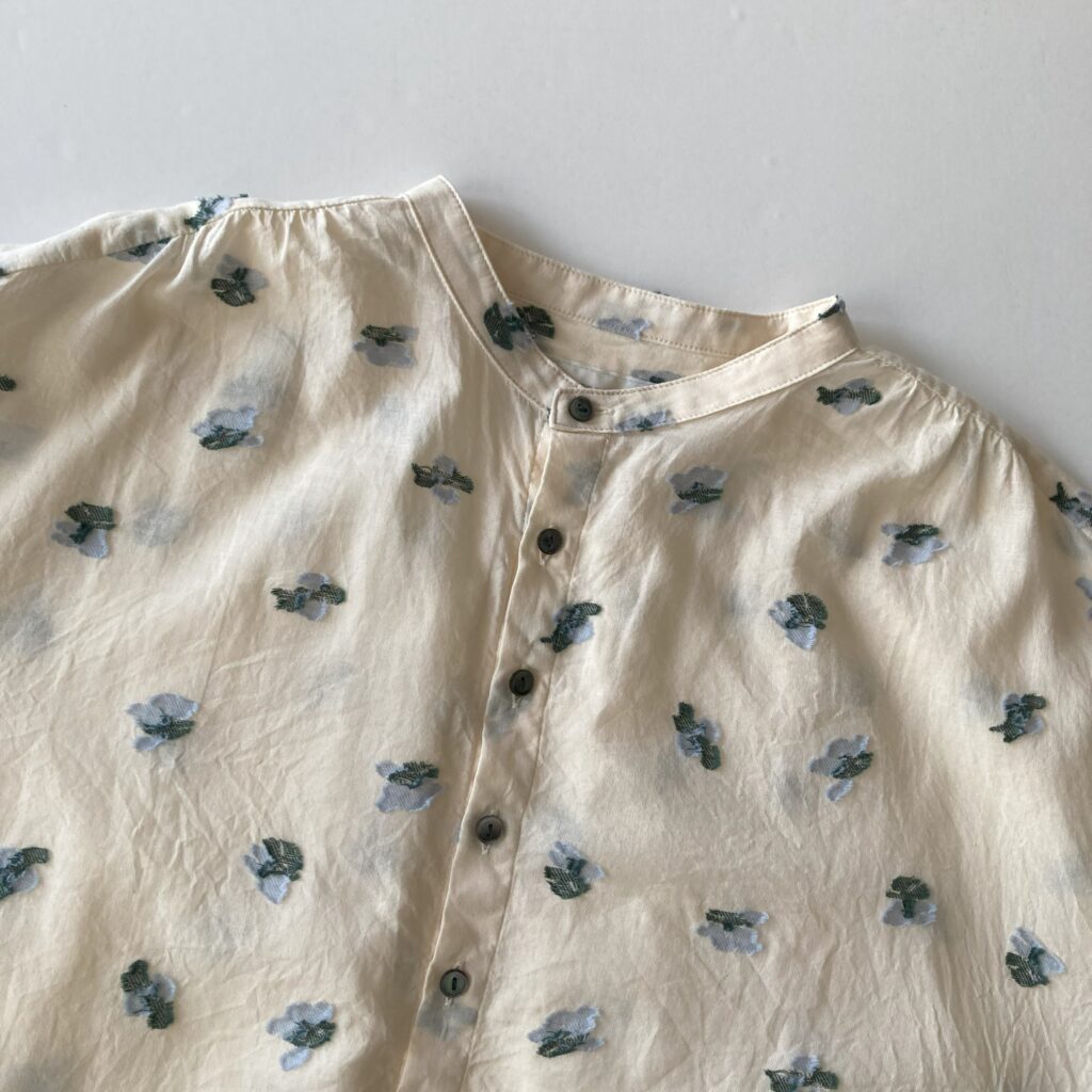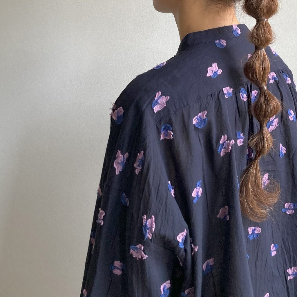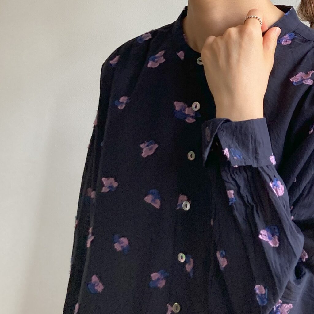 首元をすっきり見せてくれるスタンドカラーのブラウス。ドットのような花をモチーフにしたカットジャガード生地を使用し、軽やかさの中に繊細な陰影をまとわせました。ベースカラーはシックにまとめつつ、花の部分にだけ色をのせたことで、さりげない華やかさを添えています。きちんとした場面でも、普段の装いにも、幅広いシーンでアレンジを楽しんでいただける一枚です。