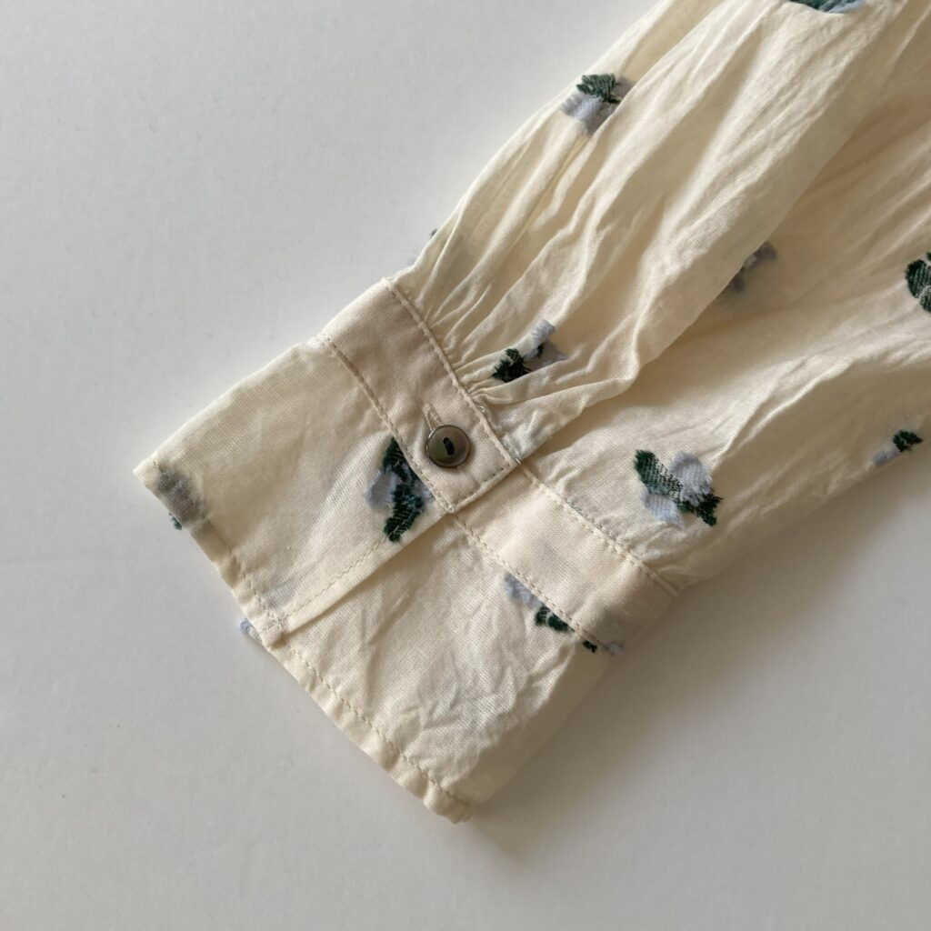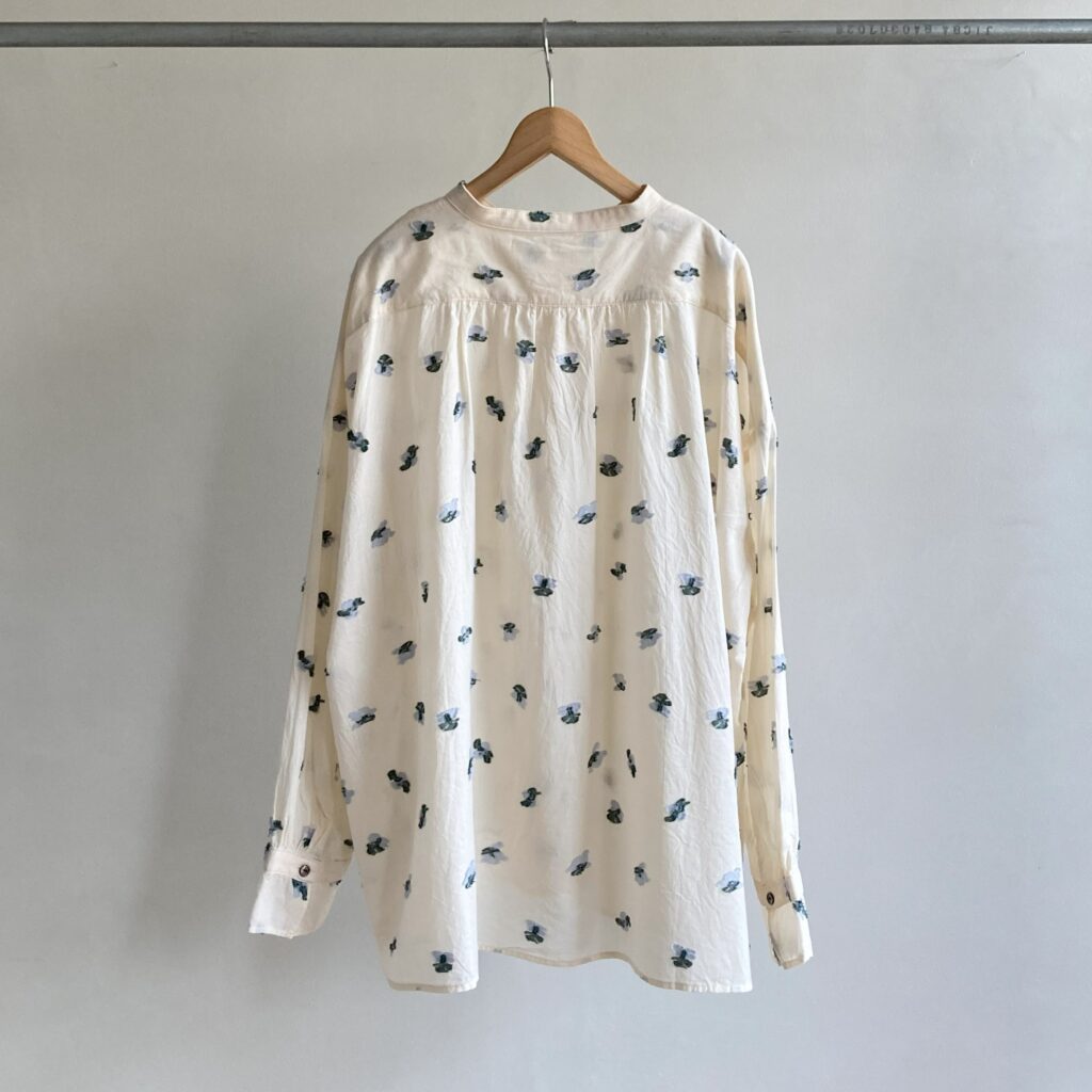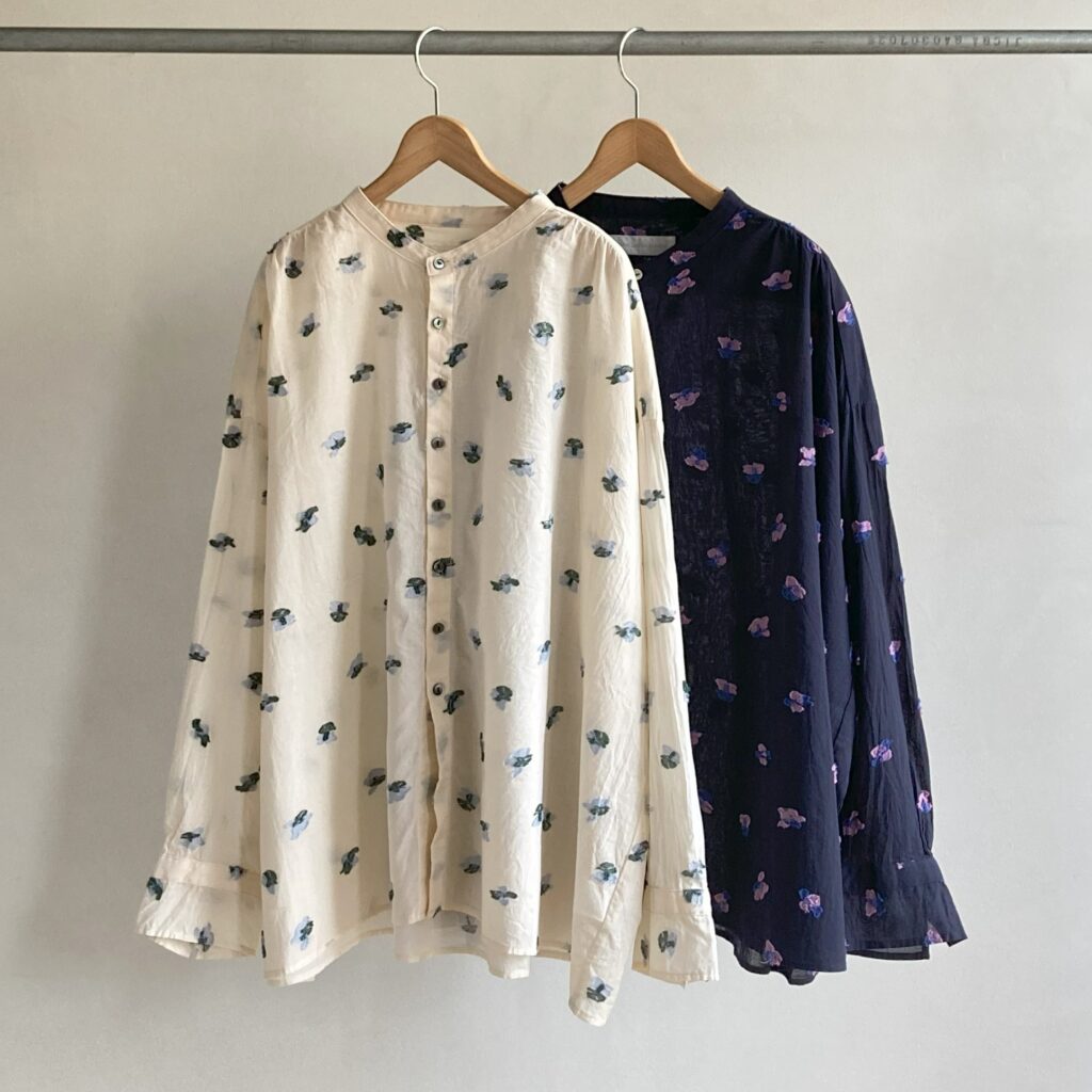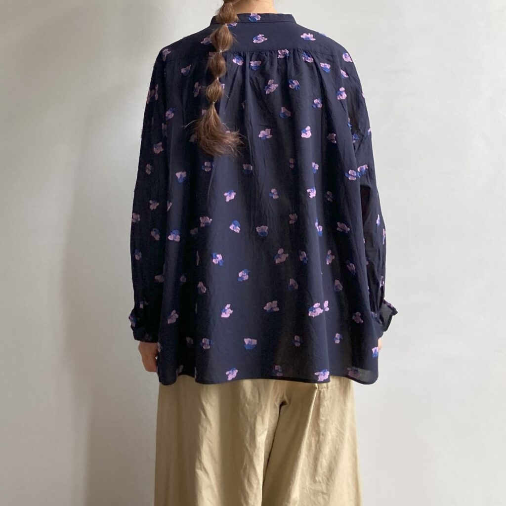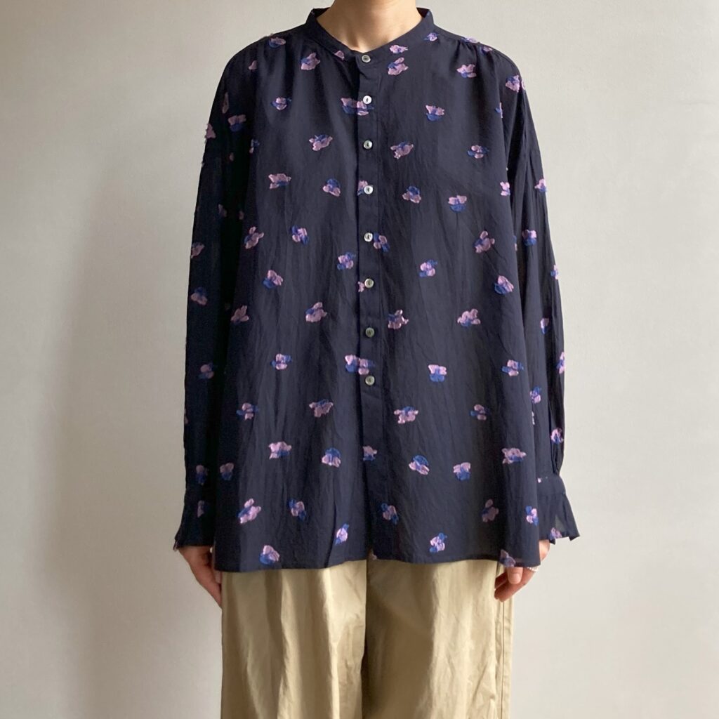 首元をすっきり見せてくれるスタンドカラーのブラウス。ドットのような花をモチーフにしたカットジャガード生地を使用し、軽やかさの中に繊細な陰影をまとわせました。ベースカラーはシックにまとめつつ、花の部分にだけ色をのせたことで、さりげない華やかさを添えています。きちんとした場面でも、普段の装いにも、幅広いシーンでアレンジを楽しんでいただける一枚です。