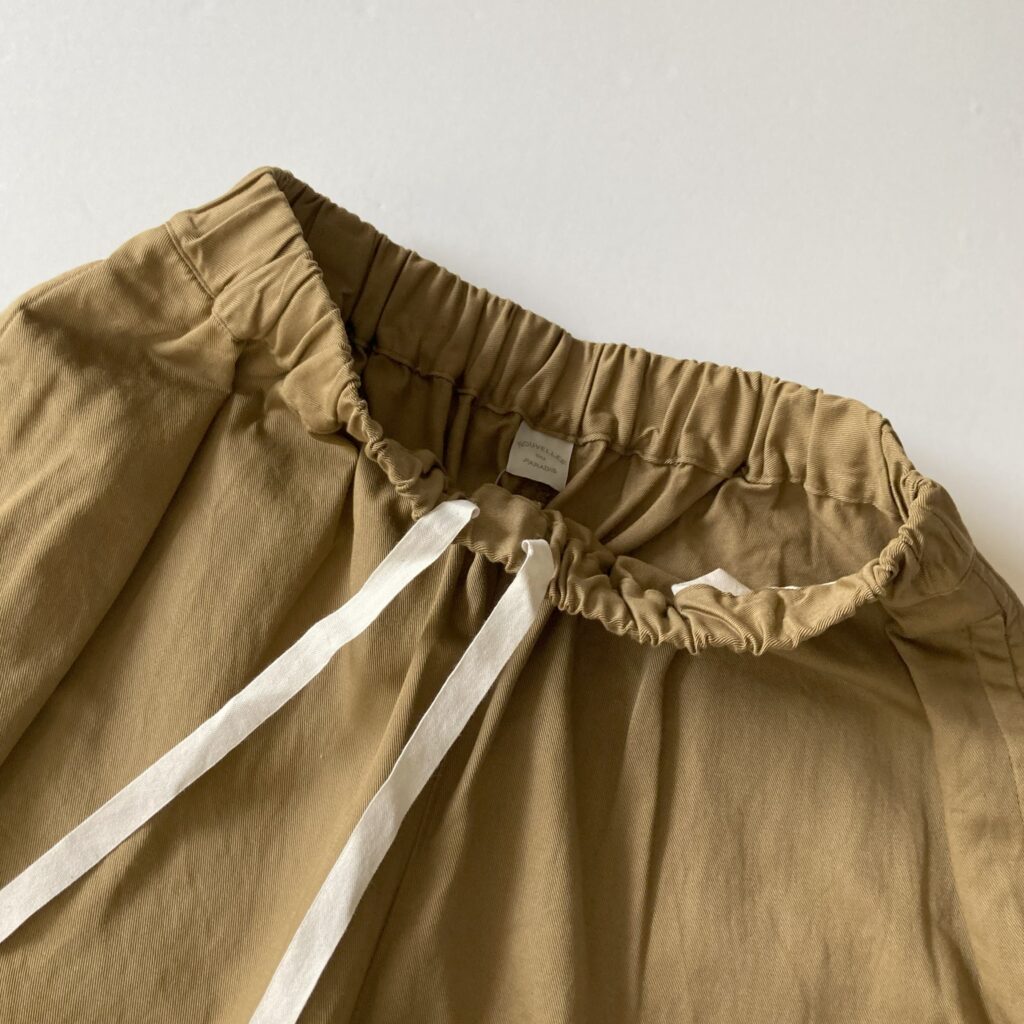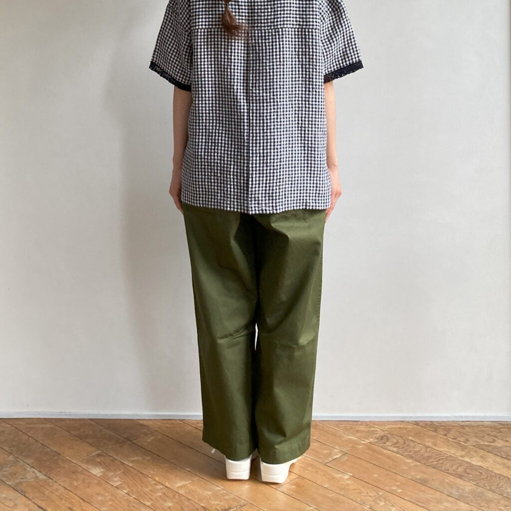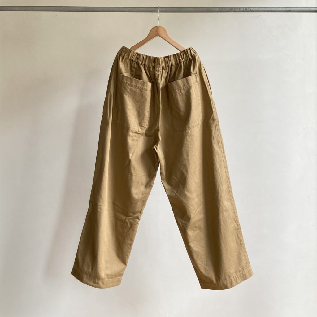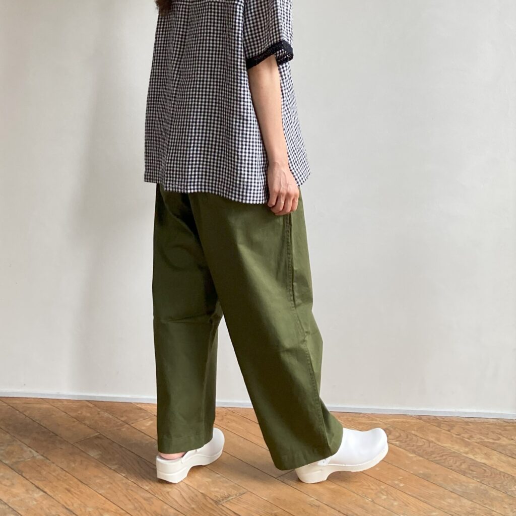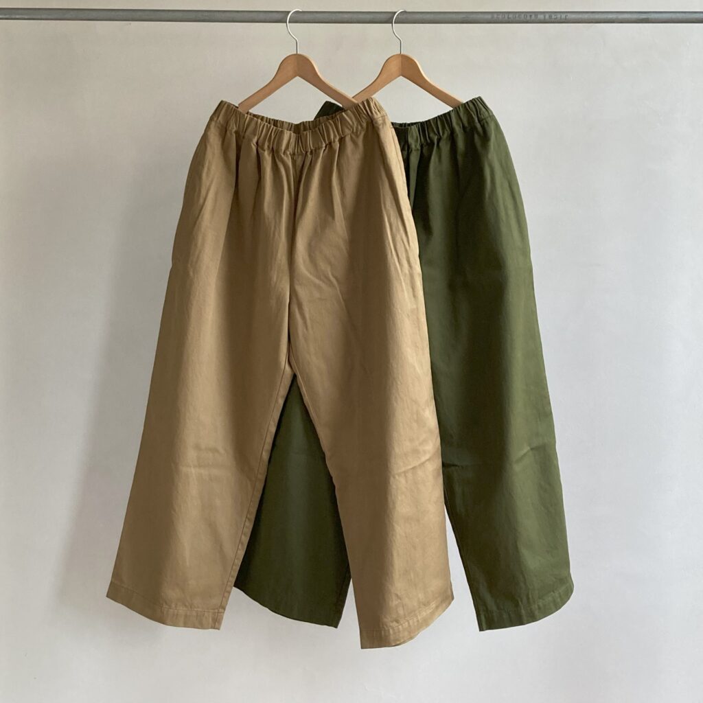 定番素材のグロスバーバリーよりも少し肉厚で、上品な光沢をもつツイル生地を使用したパンツ。ほどよい厚みと軽やかさをあわせ持ち、季節を問わずオールシーズン活躍してくれます。ウエストは総ゴム仕様でストレスのない穿き心地です。どちらの色もコーディネートに取り入れやすく、日常の定番として頼れるアイテムになってくれそうです。