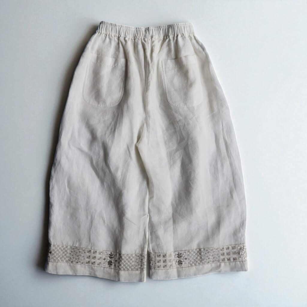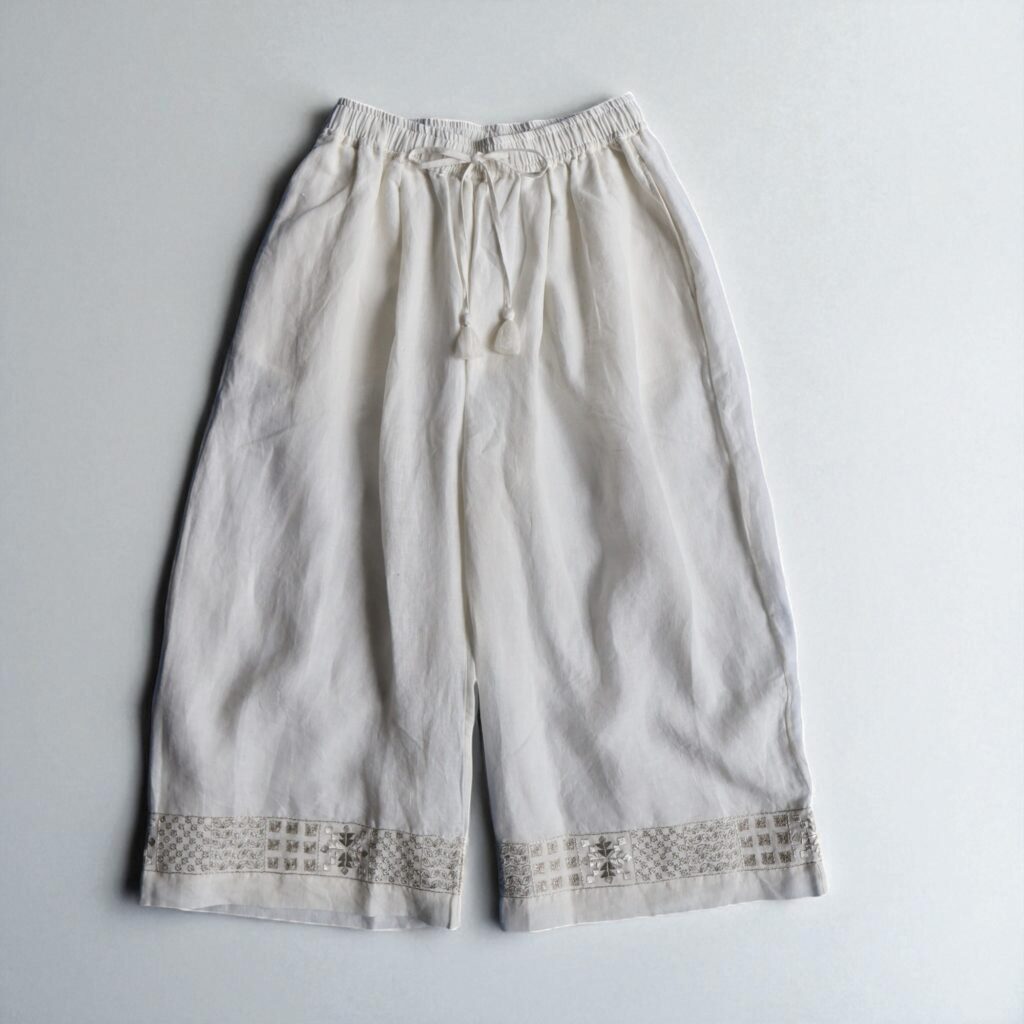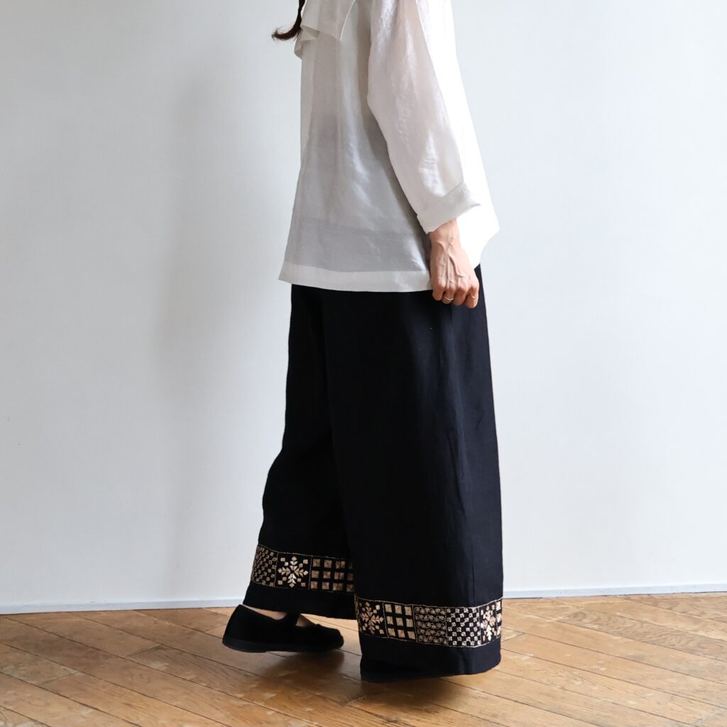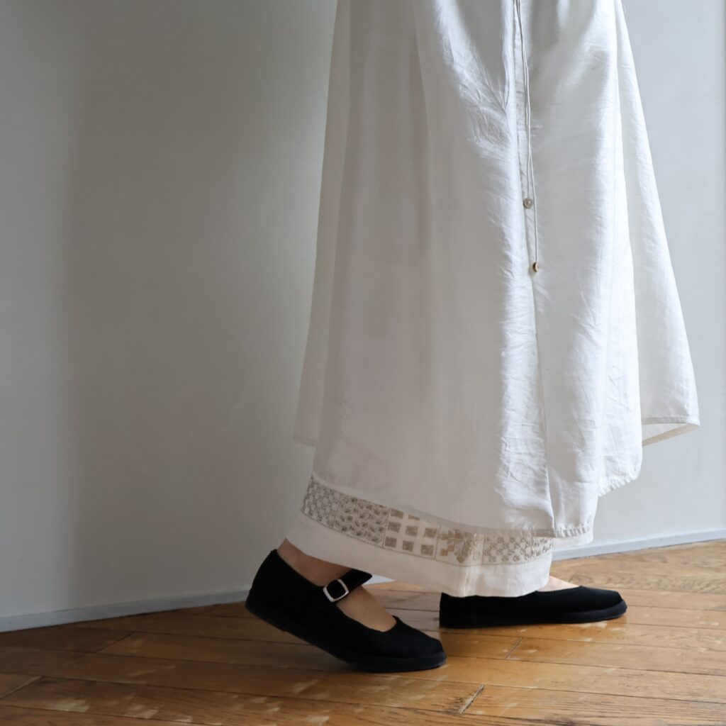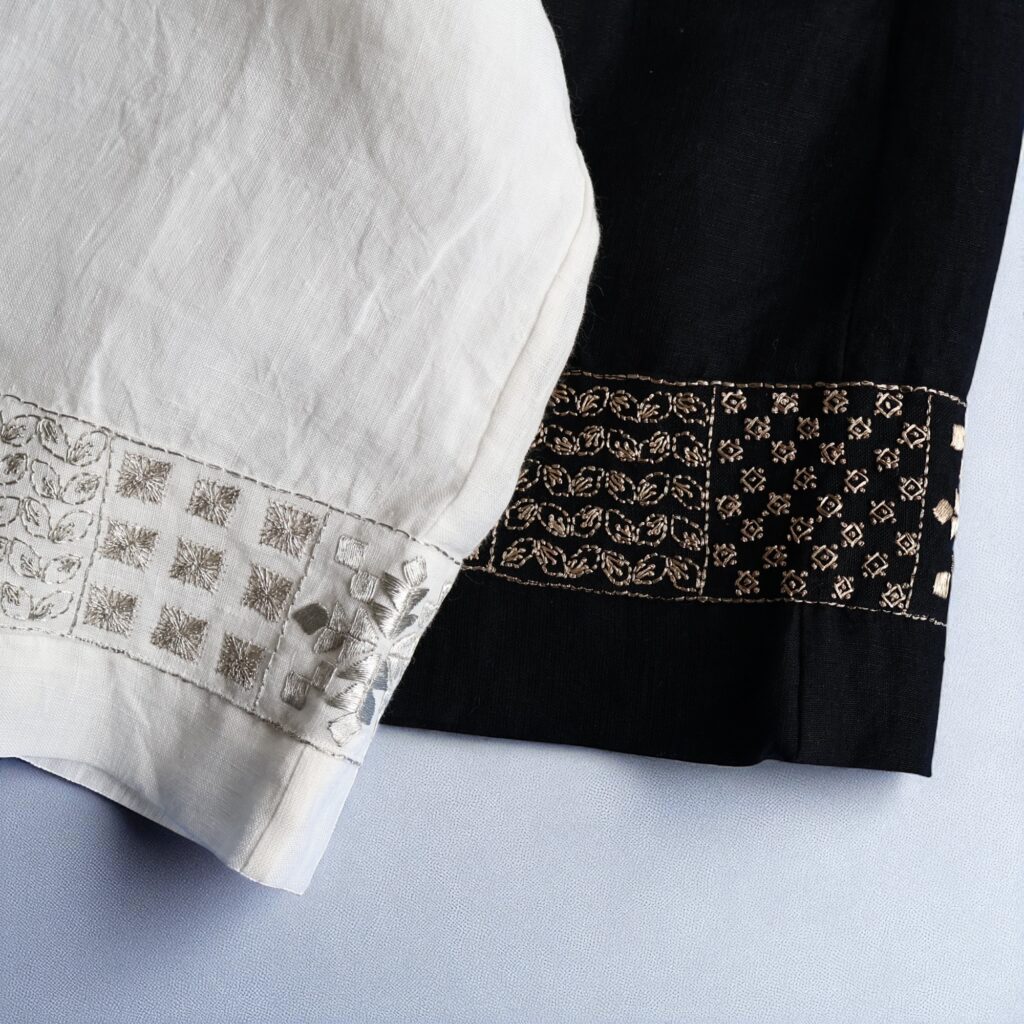 裾には幾何学模様や植物を思わせる刺繍を贅沢にあしらい、シンプルな中に洗練されたアクセントをプラス。手仕事の温かみを感じながらも、日常の着こなしにはもちろん、特別なシーンにも映えるデザインです。ブラックはシックに、オフホワイトは軽やかに。カラーによって異なる表情を楽しめます。