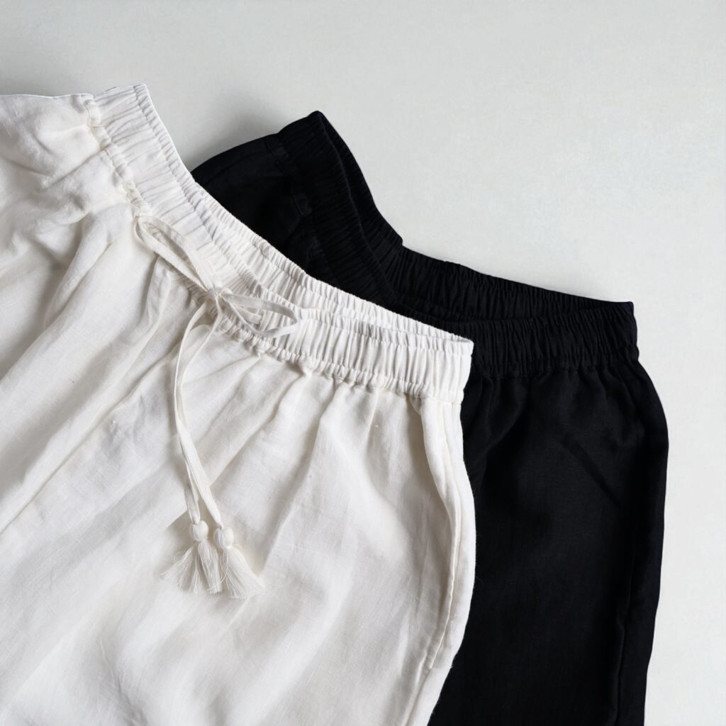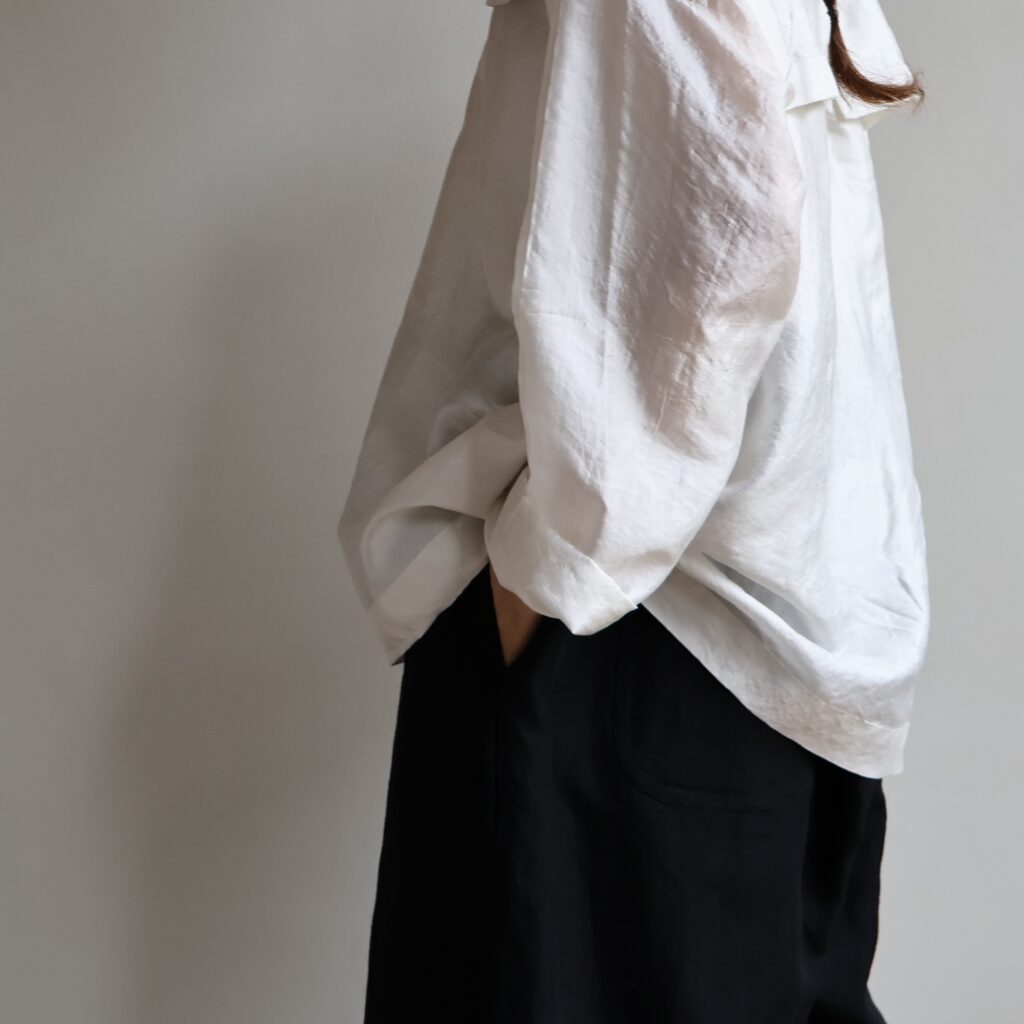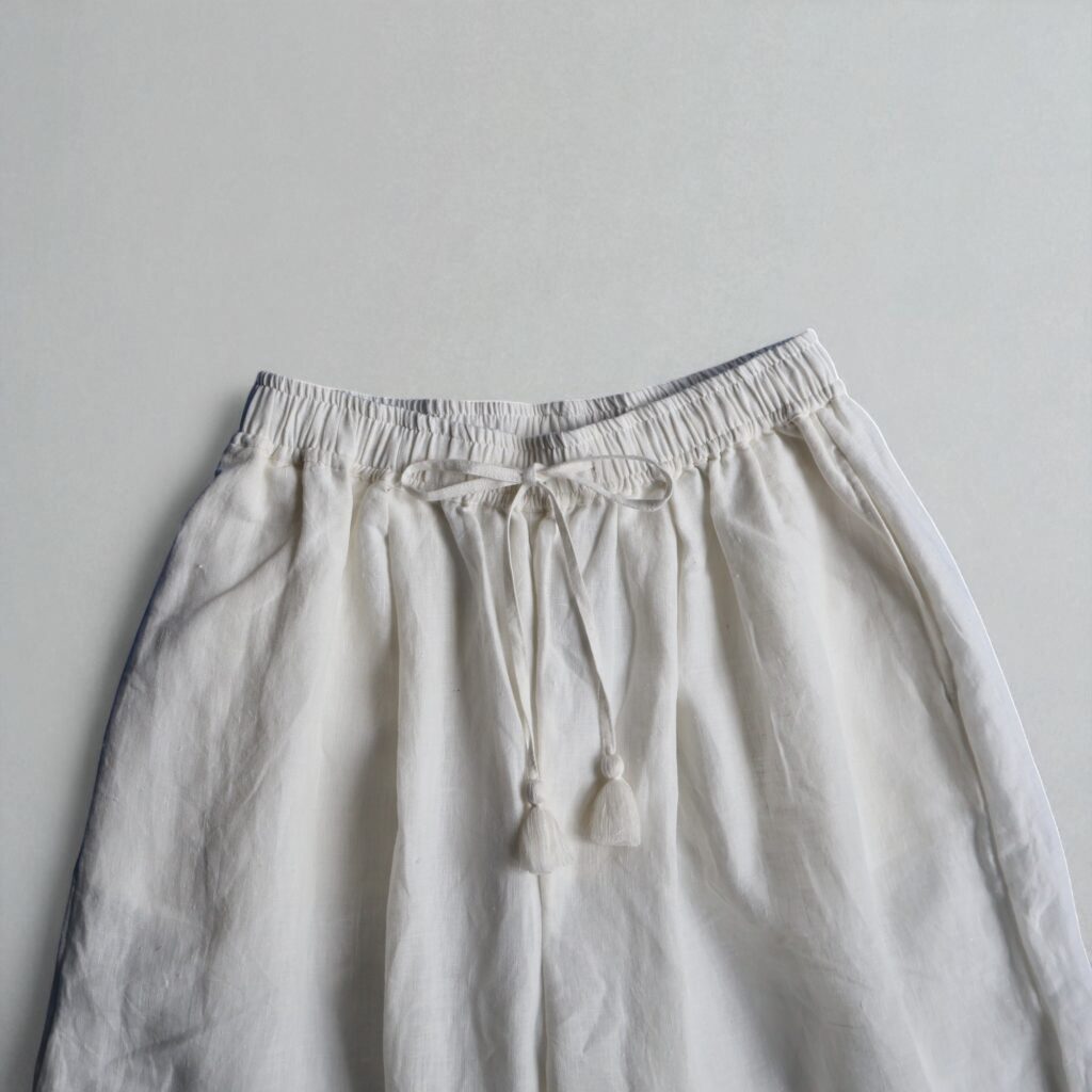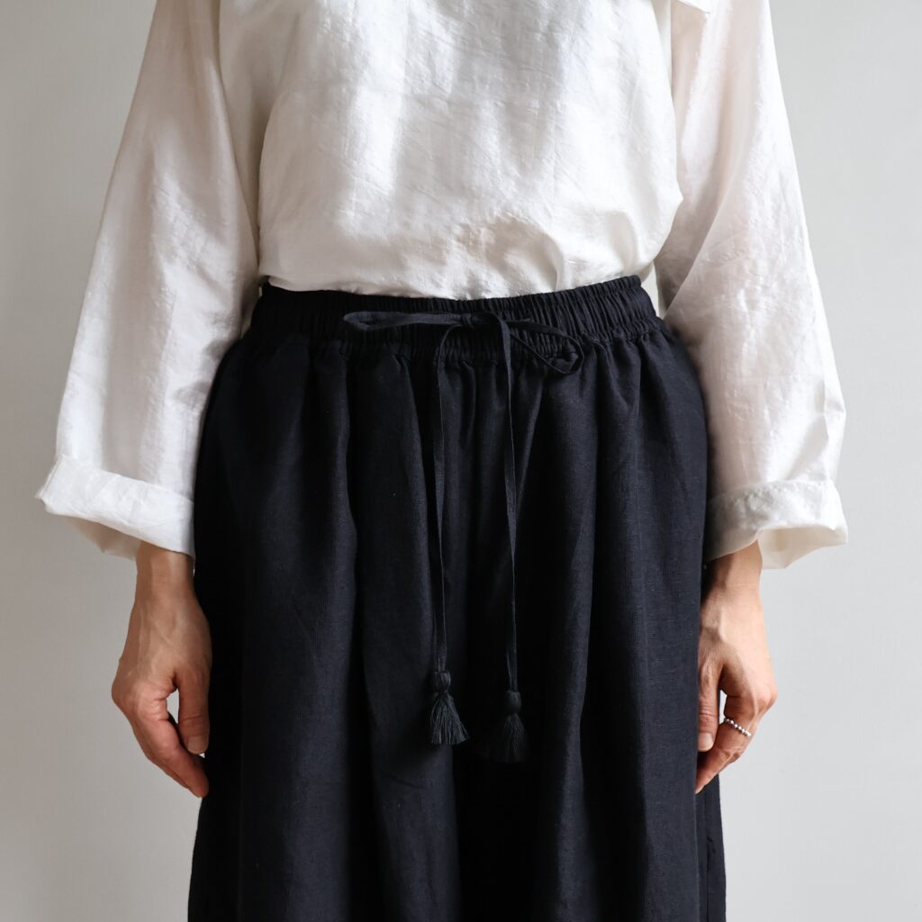手紡ぎ・手織りによるカディリネンを使ったタックパンツ。素朴な風合いと通気性のよさを持ちながら、リネン特有の落ち感があり、軽やかに穿ける一本です。ウエストにはタックを入れ、体のラインを拾わないゆとりあるシルエットに。総ゴム仕様で紐による調整も可能なので、快適さと扱いやすさを兼ね備えています。
