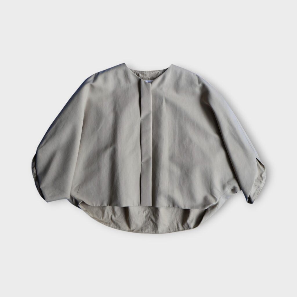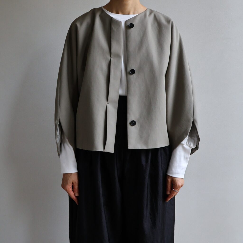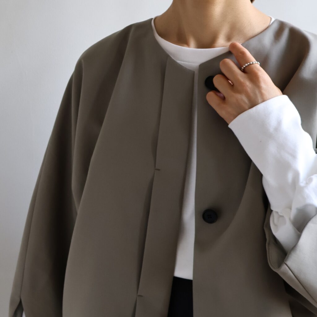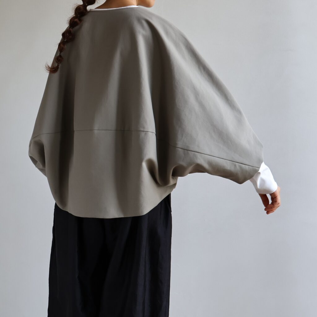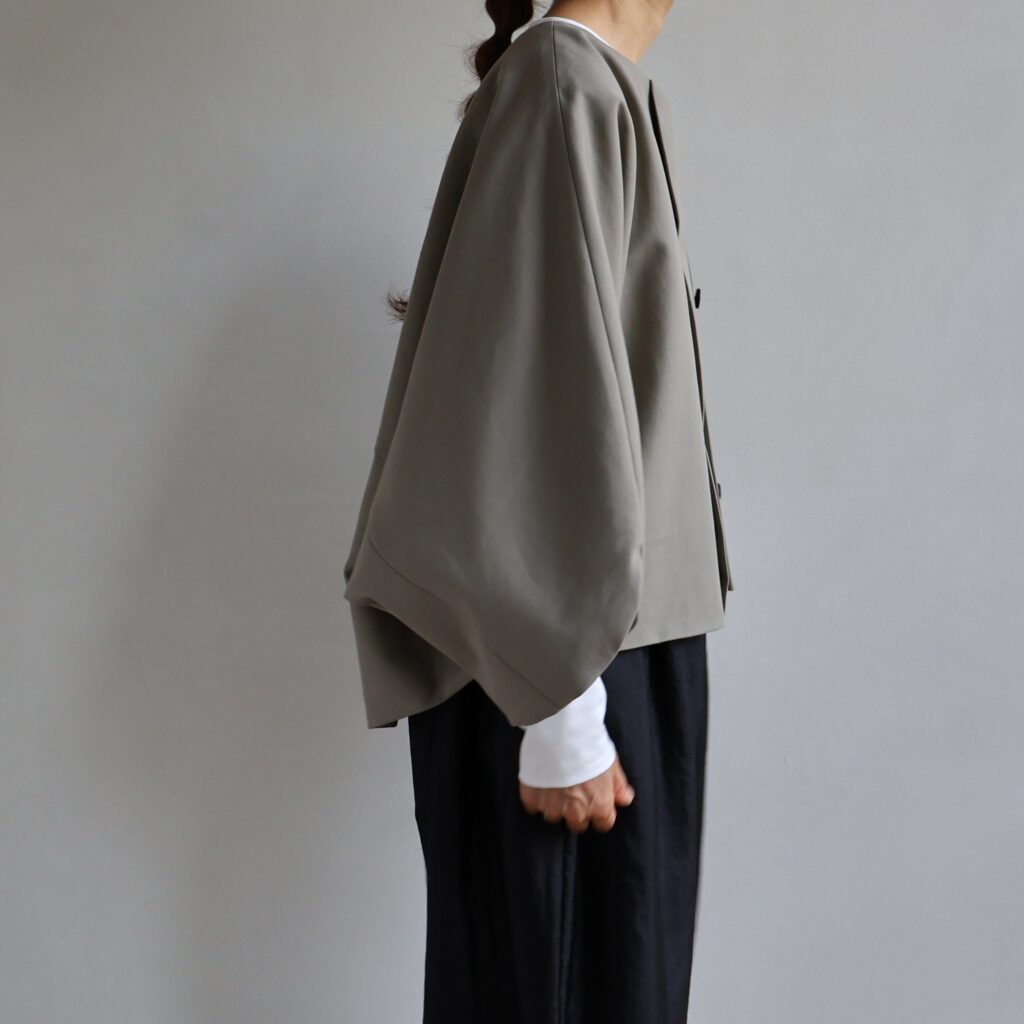 ゆったりとしたドルマンスリーブと短めの着丈が特徴のショートコート。リラックス感のあるシルエットながら、軽やかに羽織れるバランス感が魅力です。ボリュームのあるパンツやスカートとも合わせやすく、秋から冬にかけて幅広く活躍します。