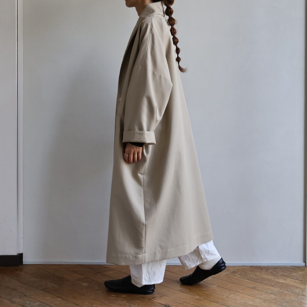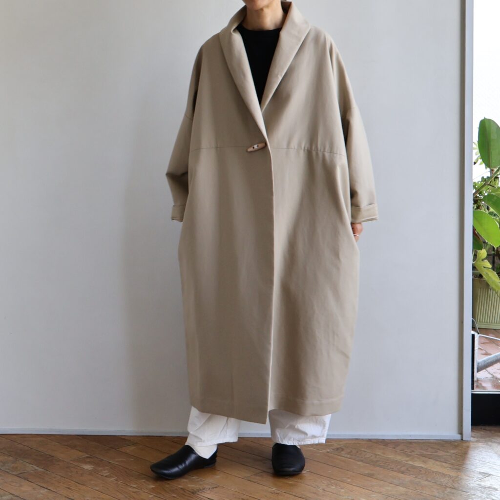 たっぷりとした身幅とロング丈が描く直線的なシルエットのローブコート。シンプルでありながら存在感があり、さらりと羽織るだけで雰囲気をつくってくれます。裏地つきで保温性も高く、秋口から冬にかけて長く活躍。フロントの留め具や衿元のミニマルな仕立ては、合わせる装いを選ばず。さらりと羽織るだけで洗練された印象を添えてくれます。
