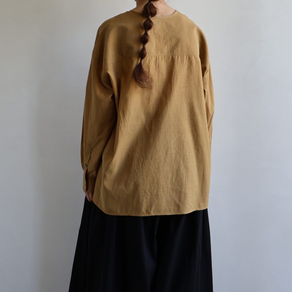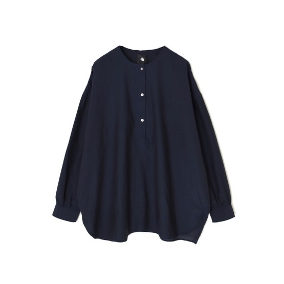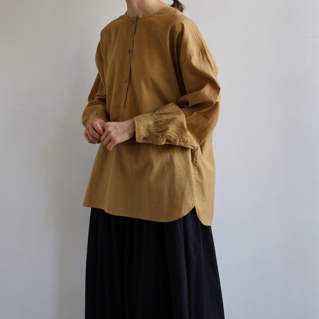 ヘンリーネックのカジュアルなデザインでデイリーに着まわしやすいプルオーバー。少しだけ肩を落としたリラックス感のあるシルエットです。糸の打ち込みが多めの織りのコットンシルク生地。縦糸は20/22DNシルク、横糸は太めの60コットンで、光沢がありつつマットな印象が特徴です。サイズやデザインなどトレンドに左右されないベーシックなフォルムは、一枚ではもちろん、ニットやカーディガンのインにもぴったり。 やわらかな肌触りと上品な見た目が魅力できれいめなお出かけシーンにも活躍します。