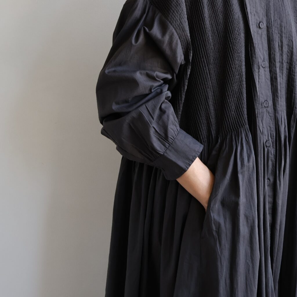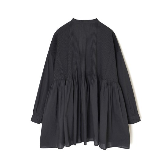 熱と圧力でツヤを出す仕上げCAMBRIC(キャンブリック)仕上げを施した”60s ORGANIC CAMBRIC PLAIN”シリーズ。コットン100%の生地は柔らかくさらっとした肌触りが特徴です。コンパクトで洗練された印象のバンドカラーシャツとワンピース。裾にかけてふんわりとしたボリュームのあるシルエットが女性らしさを引き立てます。ゆったりとした着心地ながら、前後身頃に無数の細かなピンタックを施すことで、バスト周りはすっきりした印象。中央とサイドで幅の違うピンタックを組み合わせた表情あるデザインが魅力です。