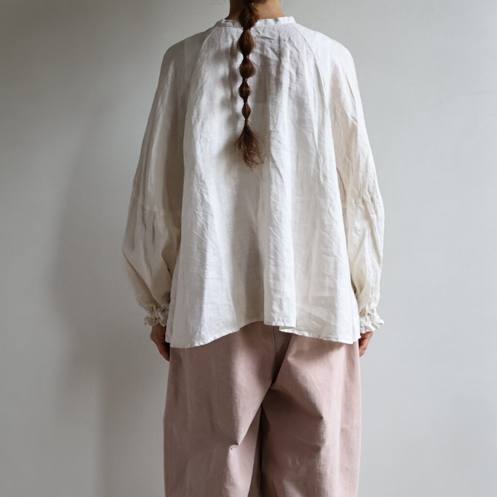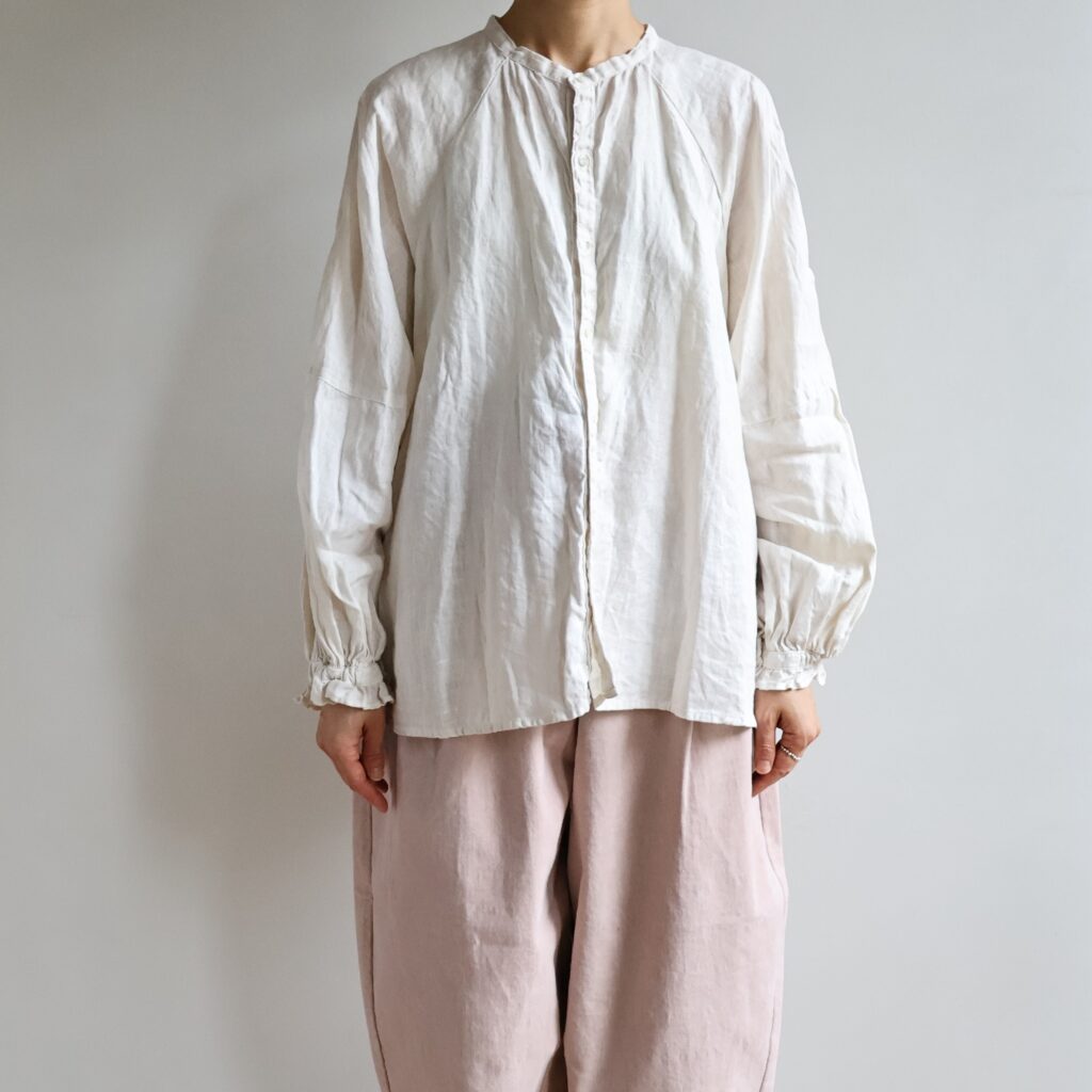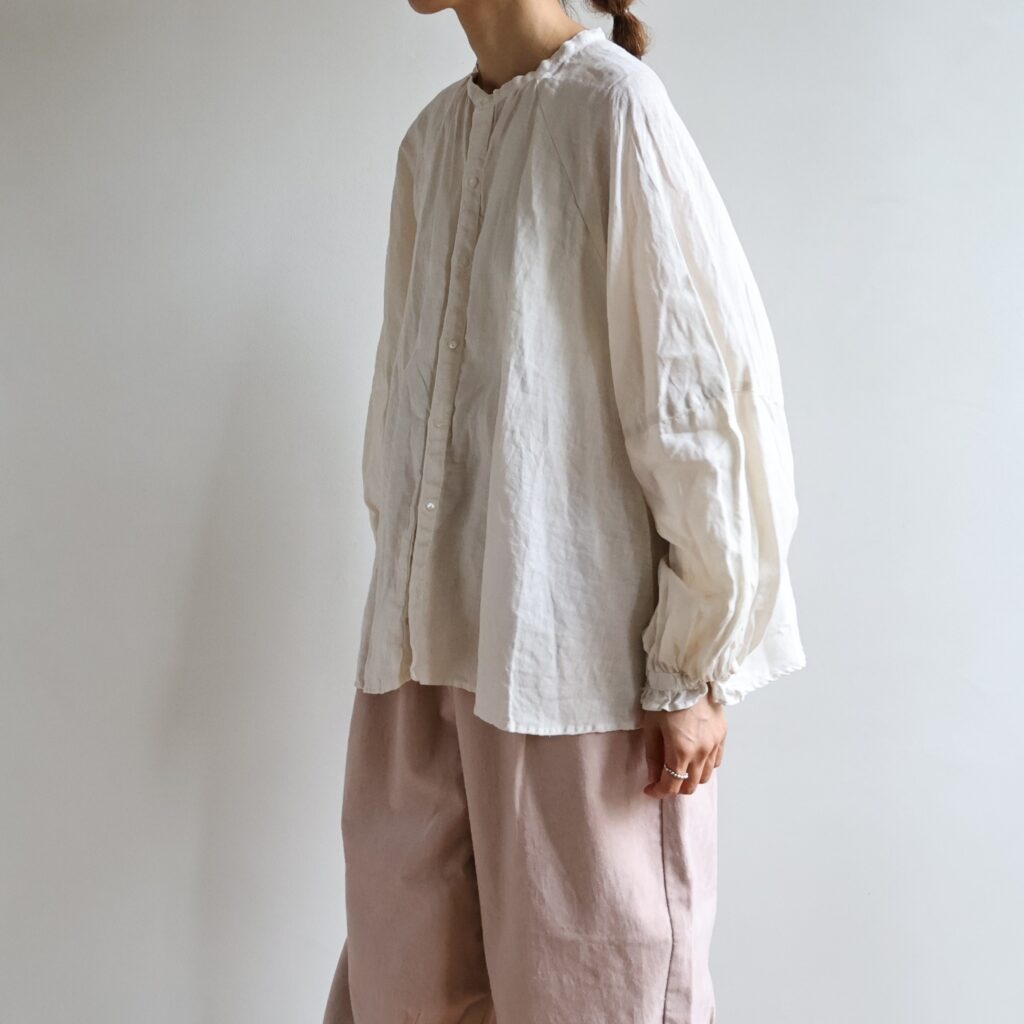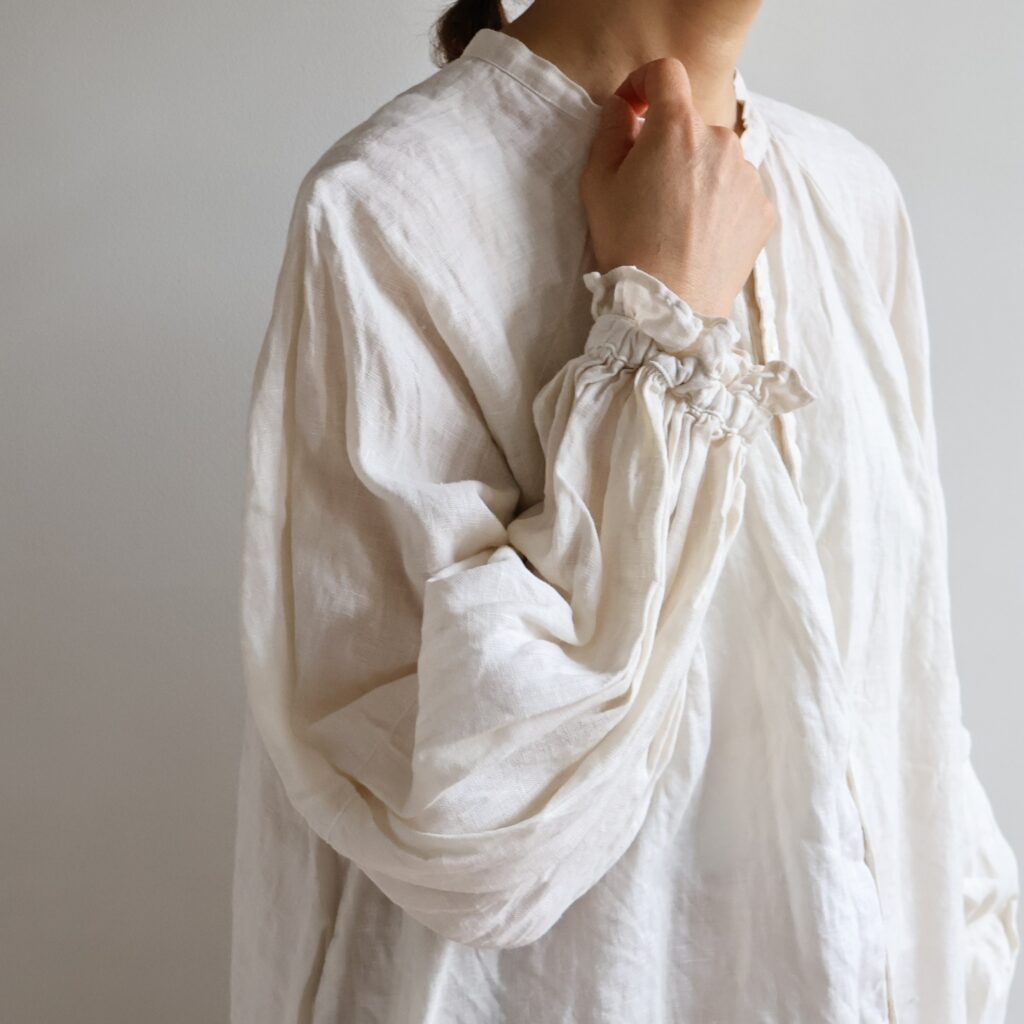 自然体な佇まいのリネンブラウスにキャンディ袖でさりげなくフェミニン要素をプラスしました。ナチュラル素材で甘さをほどよく中和させ、デイリーなパンツスタイルにも取り入れやすい仕上がりに。前後で着こなしを楽しめる2WAY仕様。前を閉じてボトムスと合わせても、ボタンをあけて羽織りとしても重宝するアイテムです。