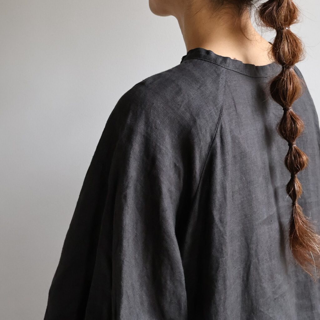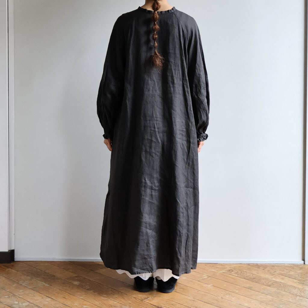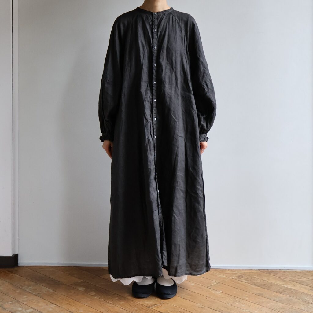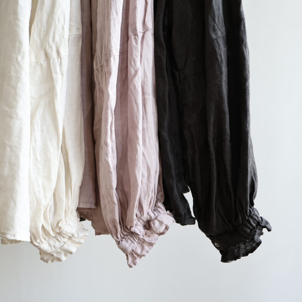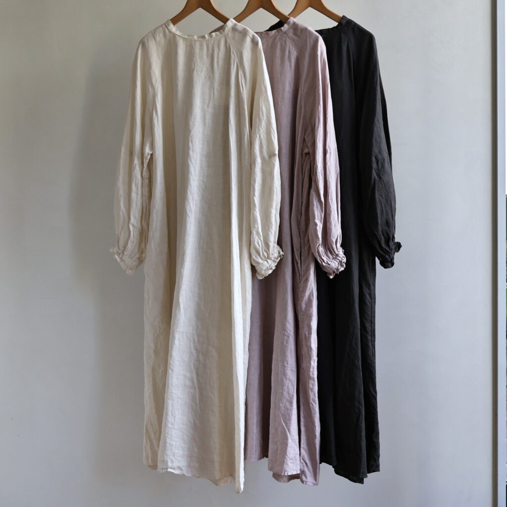 適度な厚みとハリのある上質なリネンを贅沢に使用したワンピースとブラウス。製品染めならではの深いアンティークのような風合いが魅力です。くたっとした風合いで肌触りがよく、着続けるほどにさらにやわらかく馴染んでいきます。