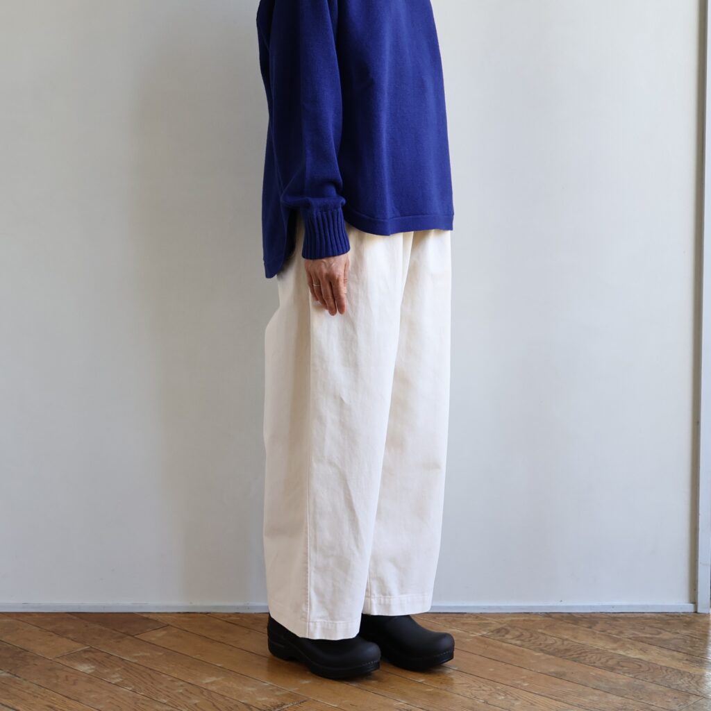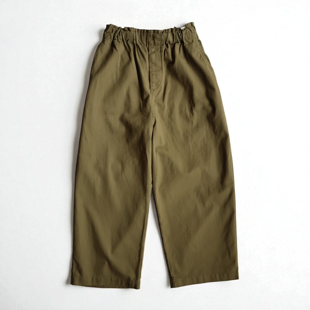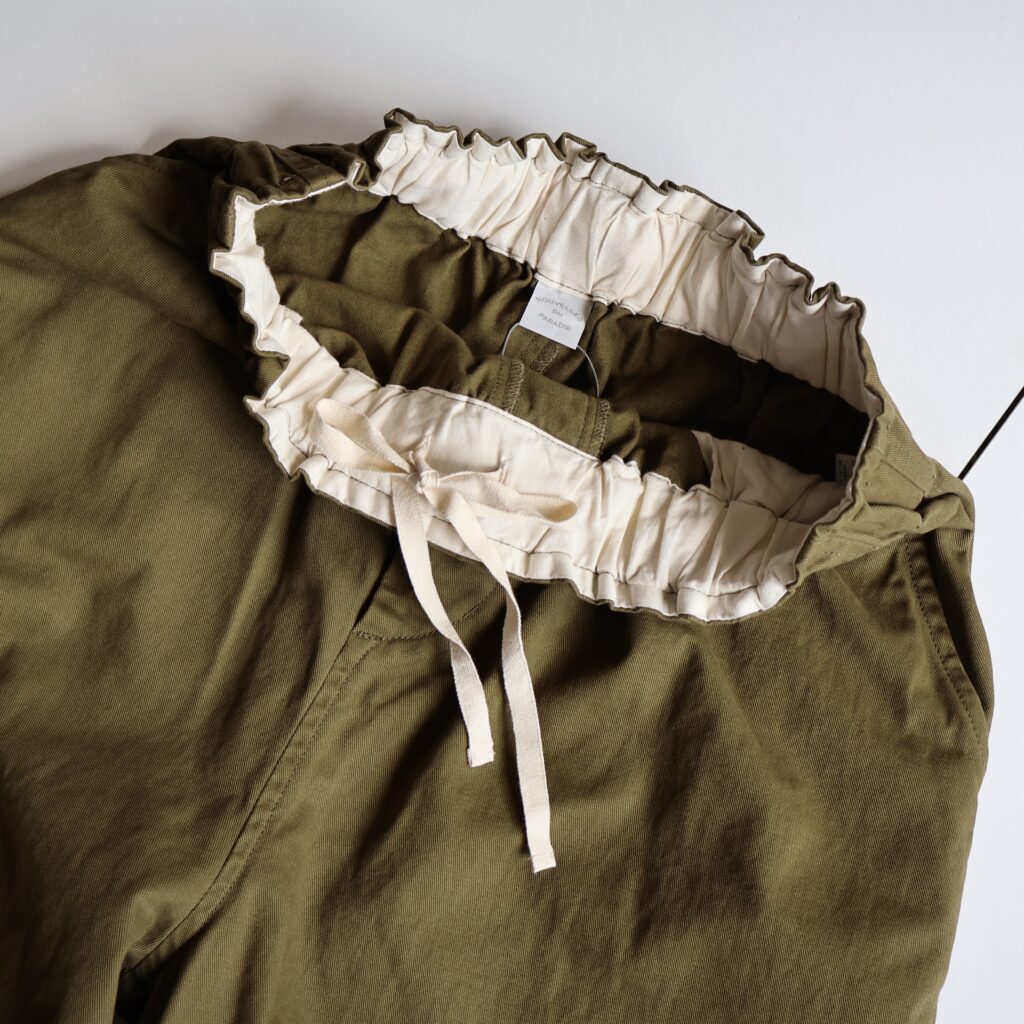 ブラント定番人気のイージーチノ。ゆったりとしつつも広がりすぎないワイドシルエットは、幅広いトップスと合わせられ、リラックススタイルに重宝します。ウエストはフィット感抜群のドロストコードつきギャザーゴム仕様。ワークウェアにも用いられる丈夫なコットンチノ素材は、使い込むほどに柔らかくなり味のある風合いに。シーズン問わず活躍してくれるパンツです。