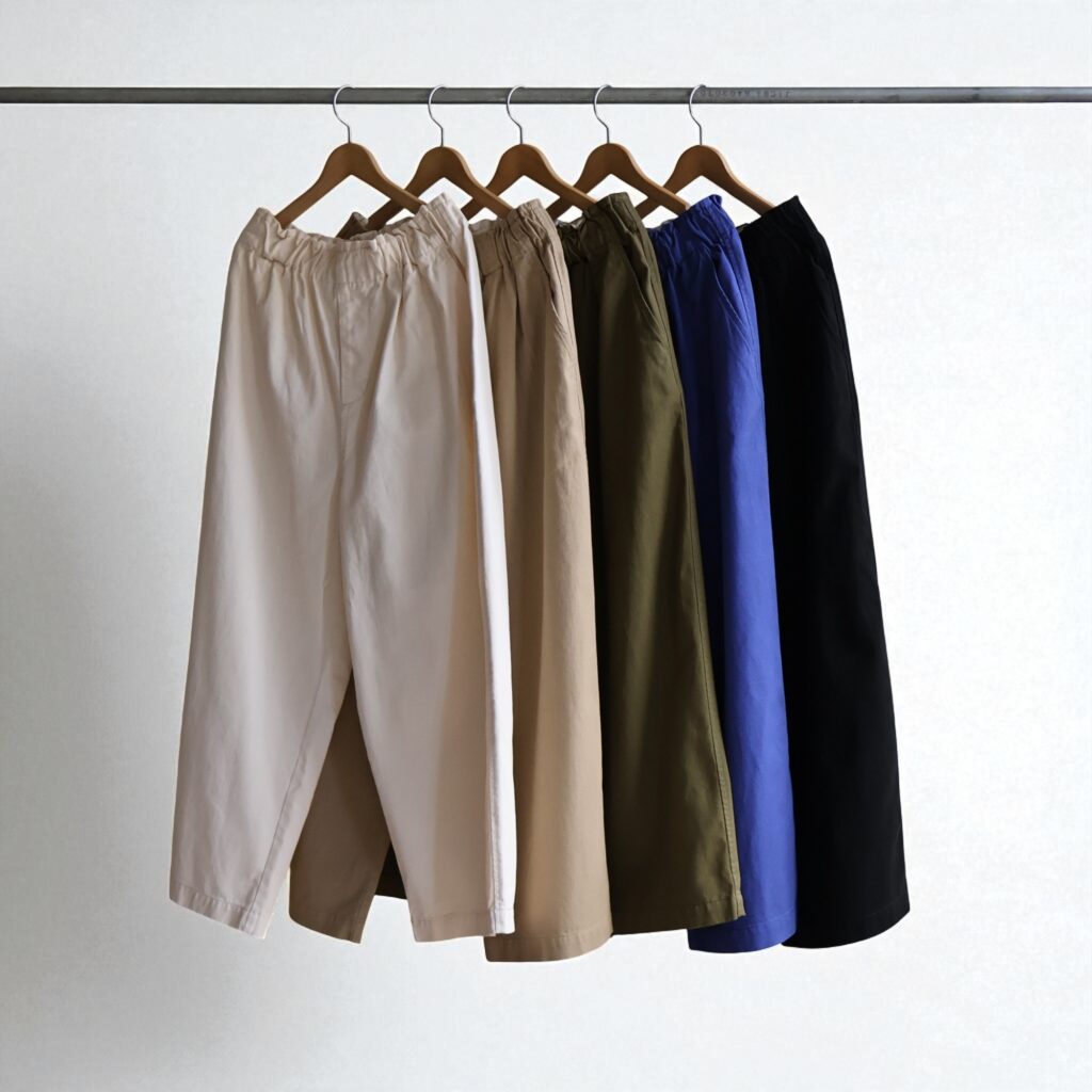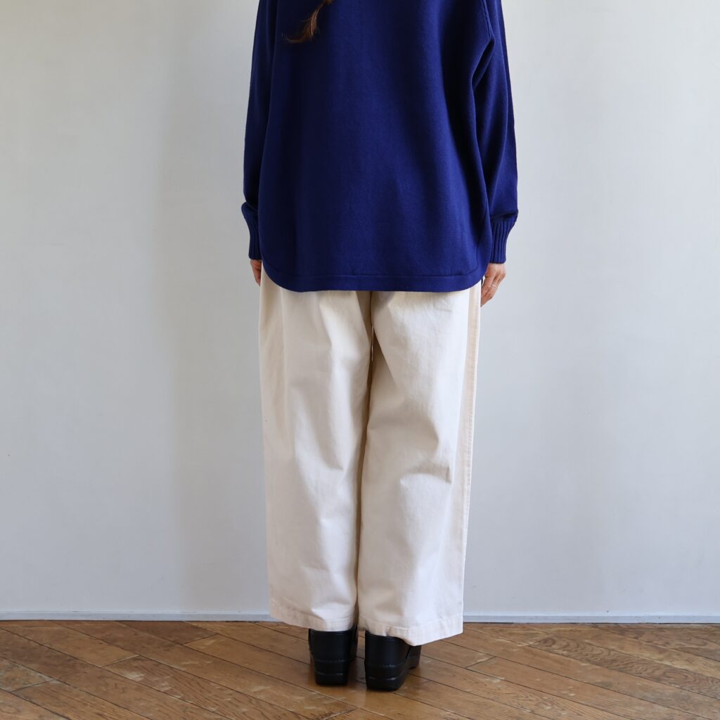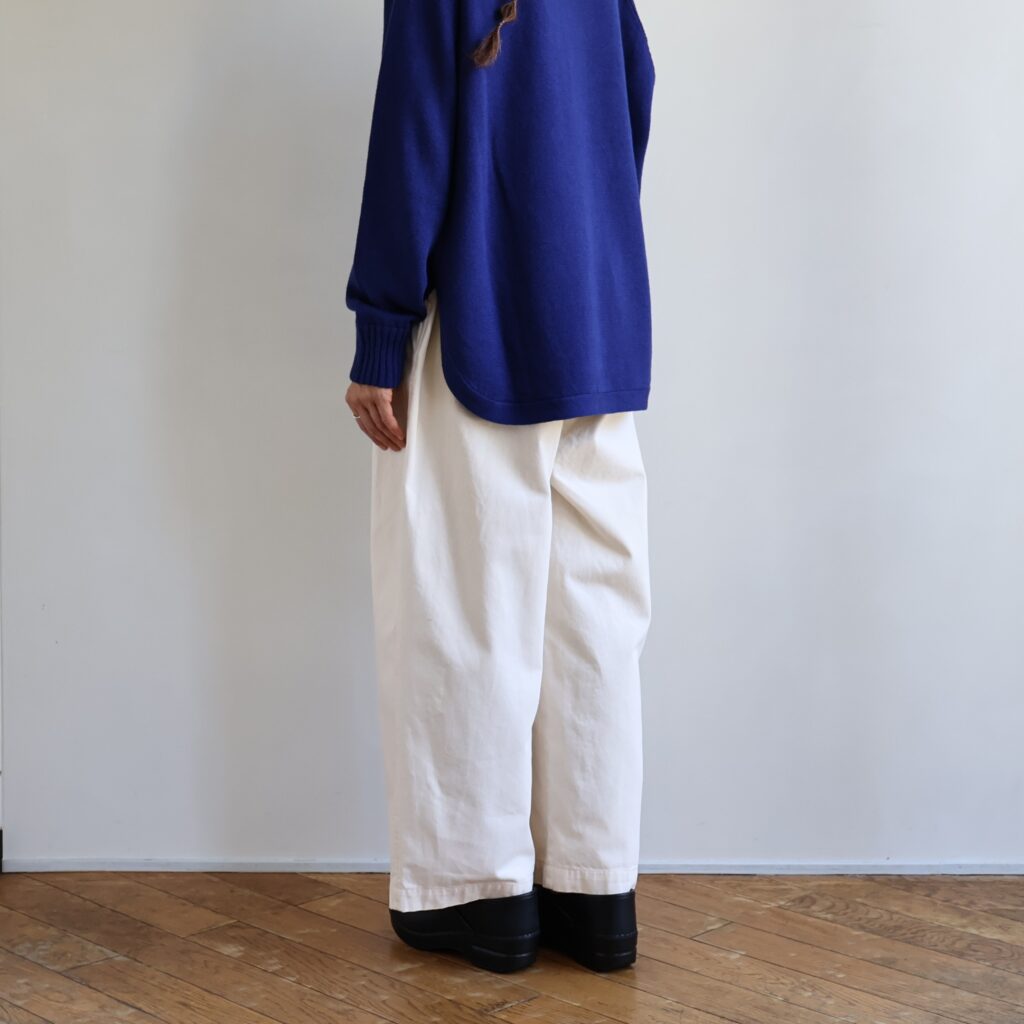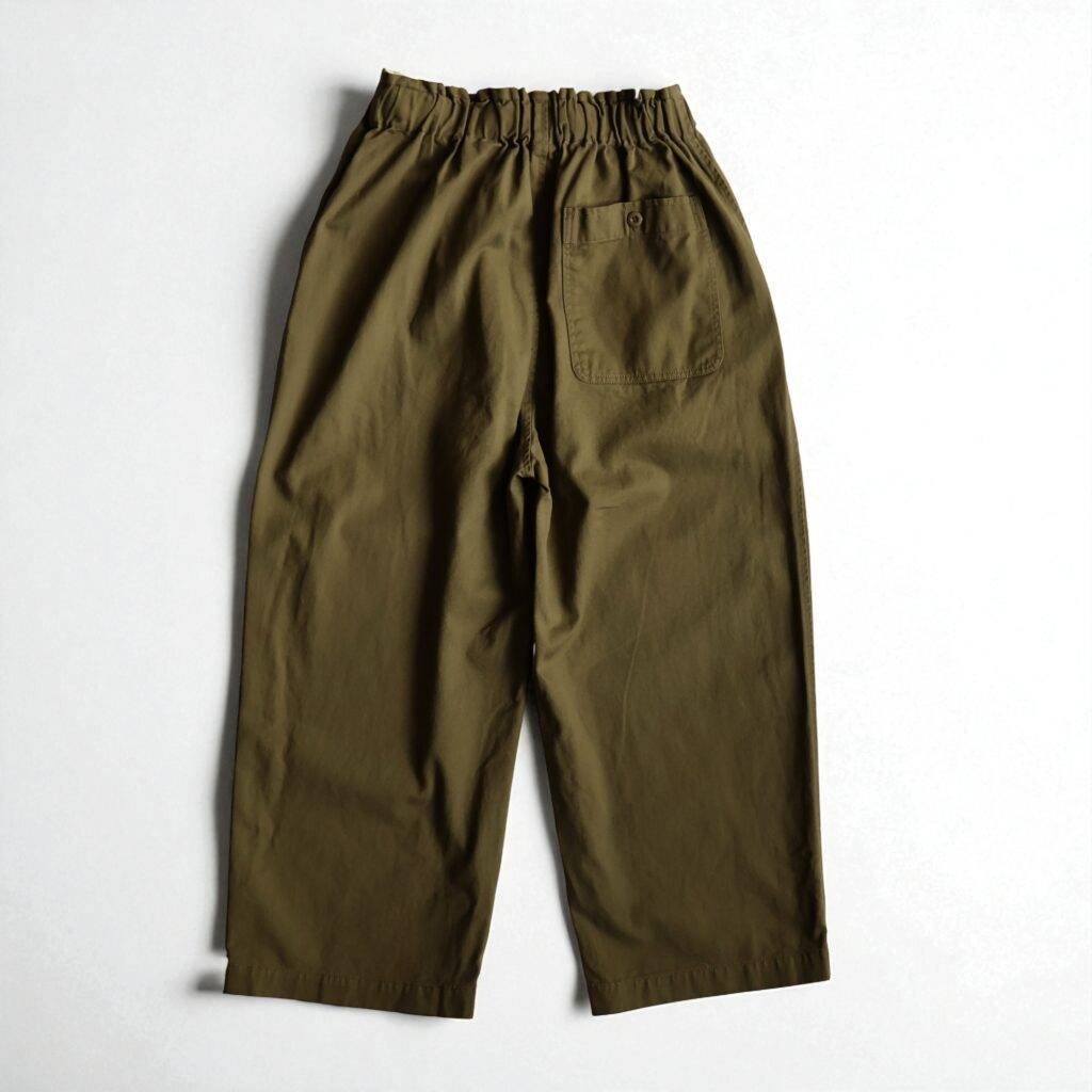 ブラント定番人気のイージーチノ。ゆったりとしつつも広がりすぎないワイドシルエットは、幅広いトップスと合わせられ、リラックススタイルに重宝します。ウエストはフィット感抜群のドロストコードつきギャザーゴム仕様。ワークウェアにも用いられる丈夫なコットンチノ素材は、使い込むほどに柔らかくなり味のある風合いに。シーズン問わず活躍してくれるパンツです。