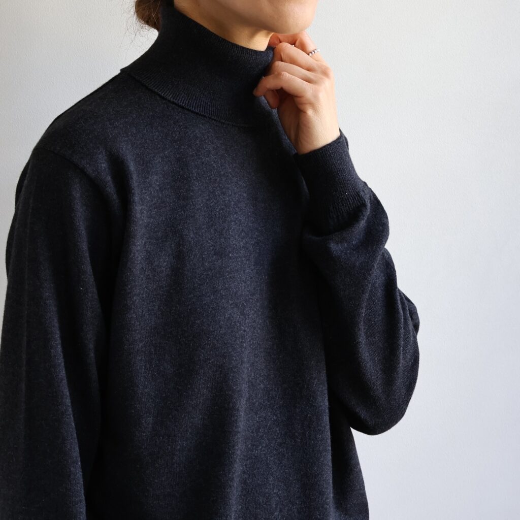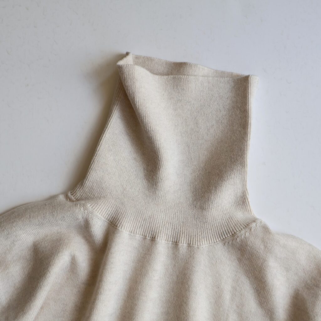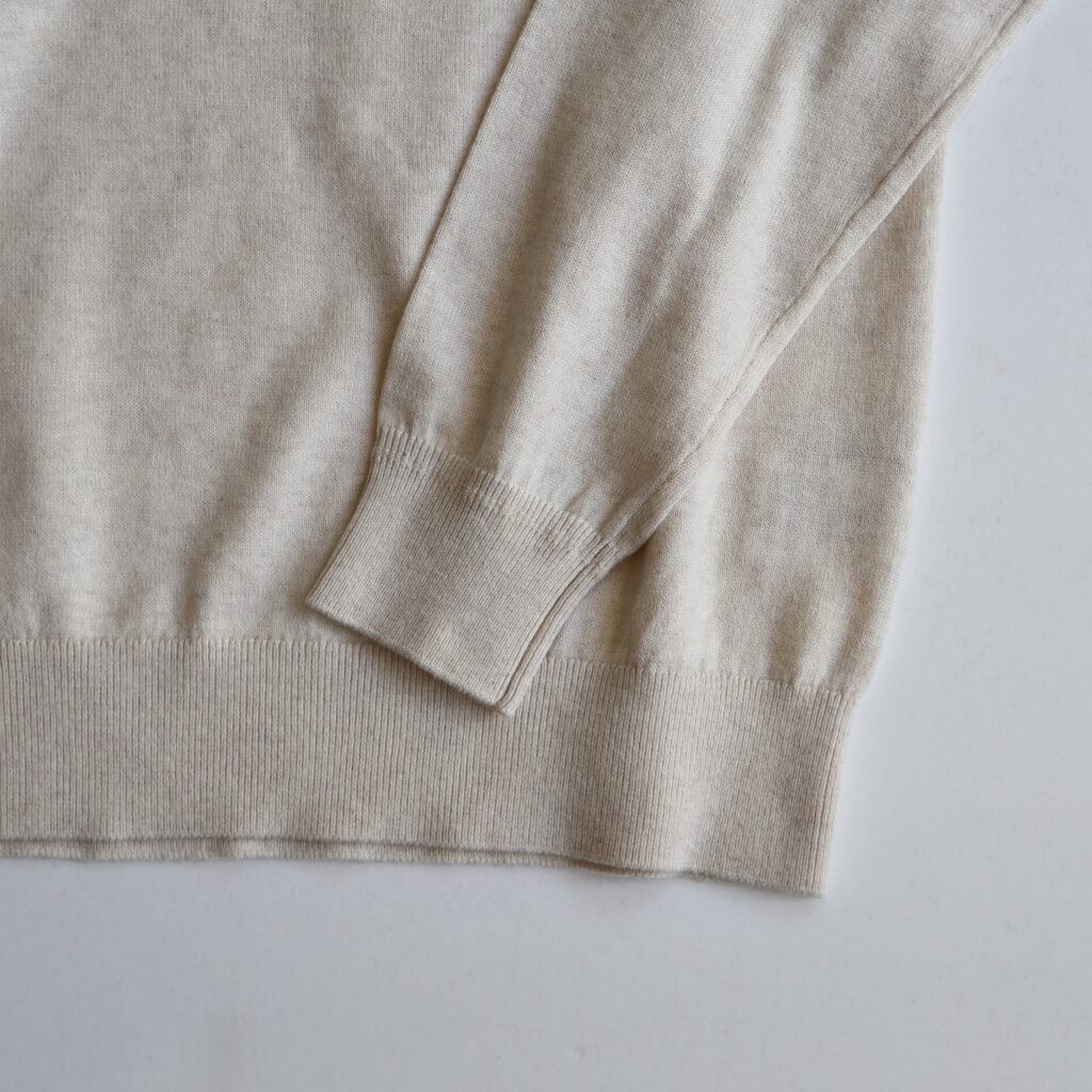 糸の状態で起毛をかけて、ふんわりと編みあげたムーコットン。カシミヤのような滑らかな肌ざわりで着心地の良さを実感できます。レイヤードから一枚着までさまざまなスタイリングを楽しめ、色違いで揃えたくなるマストアイテムです。