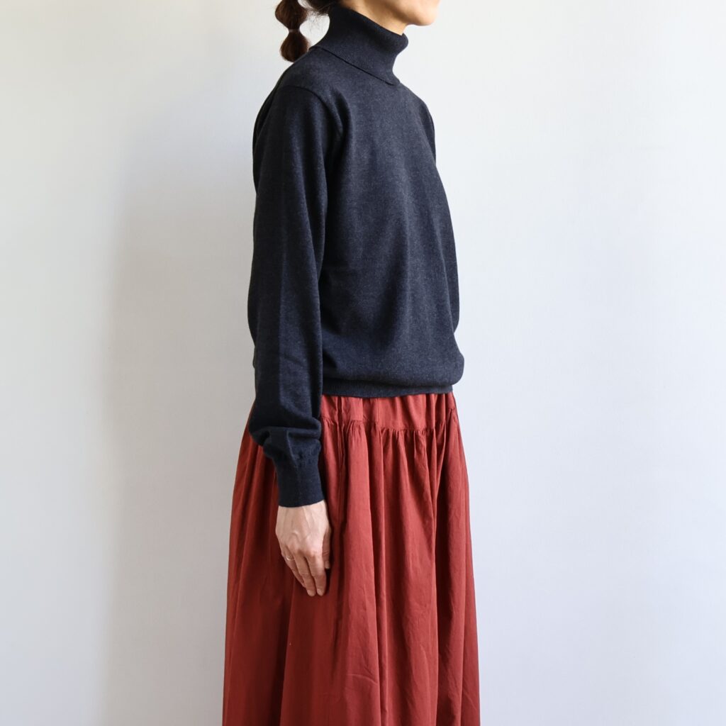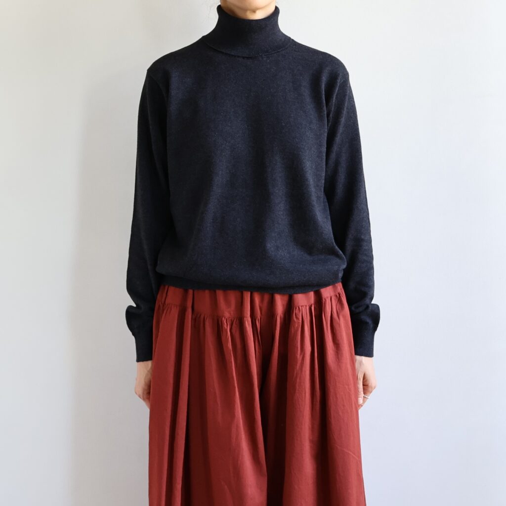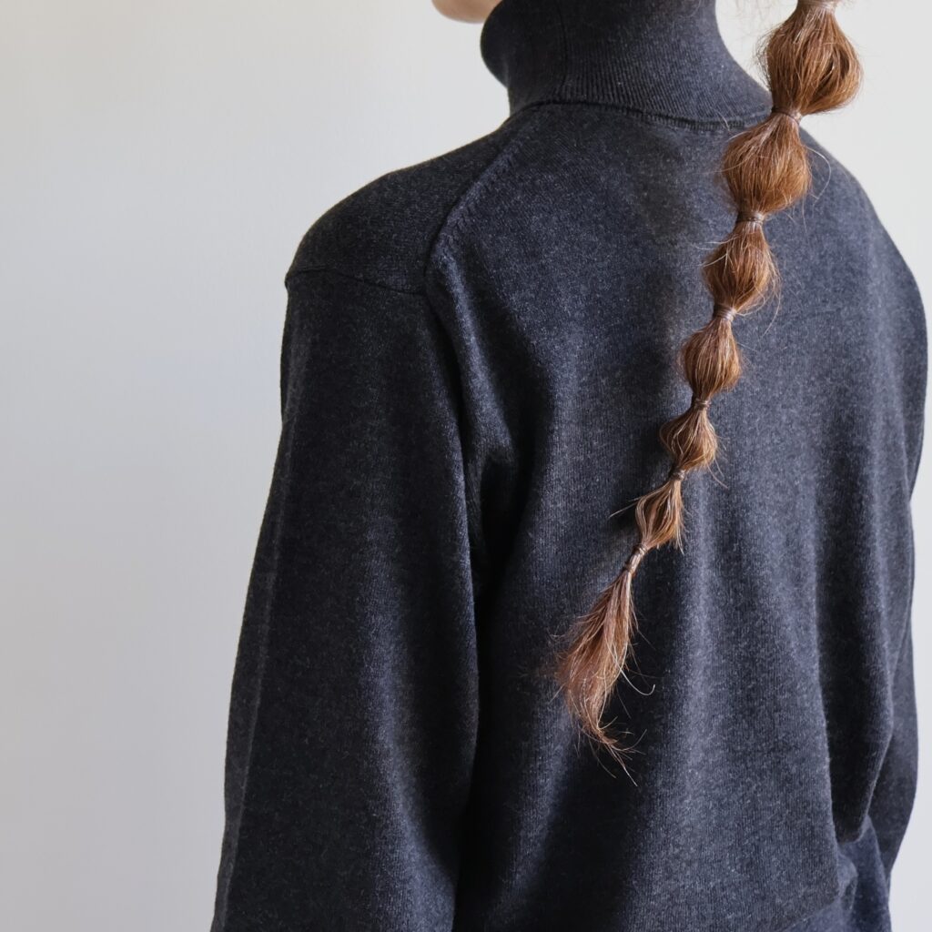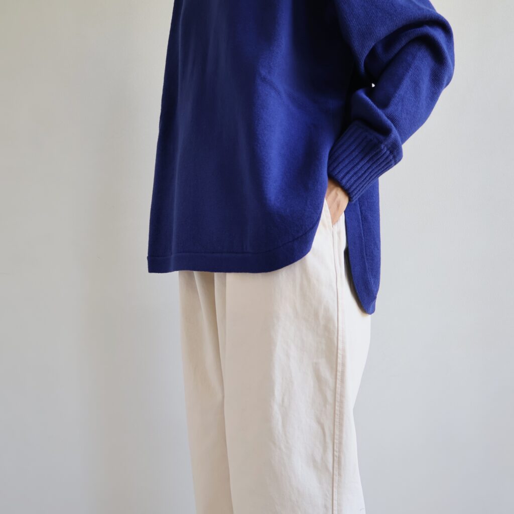 糸の状態で起毛をかけて、ふんわりと編みあげたムーコットン。カシミヤのような滑らかな肌ざわりで着心地の良さを実感できます。レイヤードから一枚着までさまざまなスタイリングを楽しめ、色違いで揃えたくなるマストアイテムです。