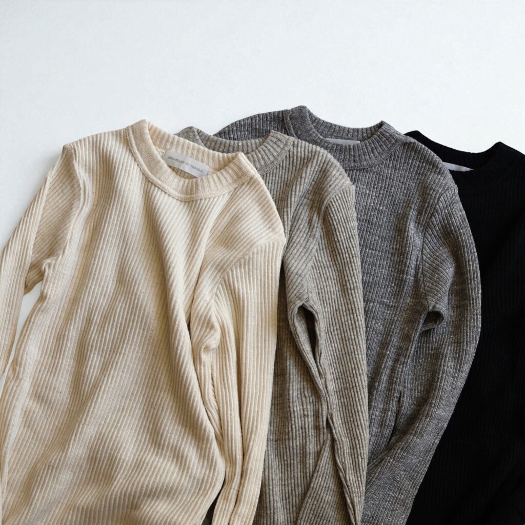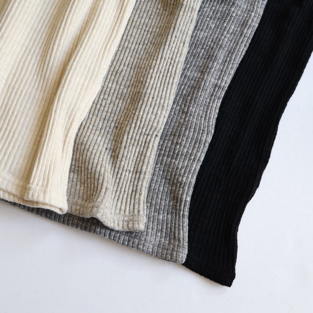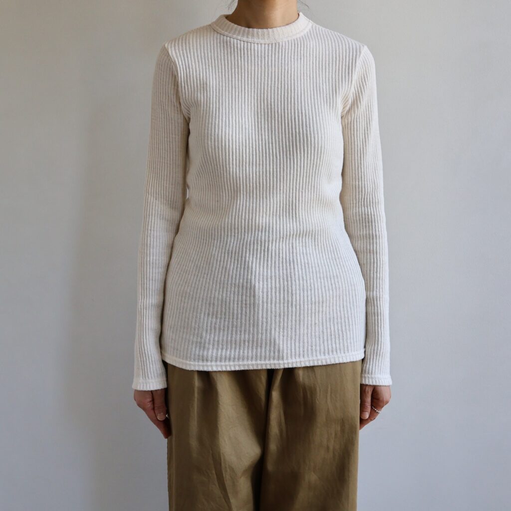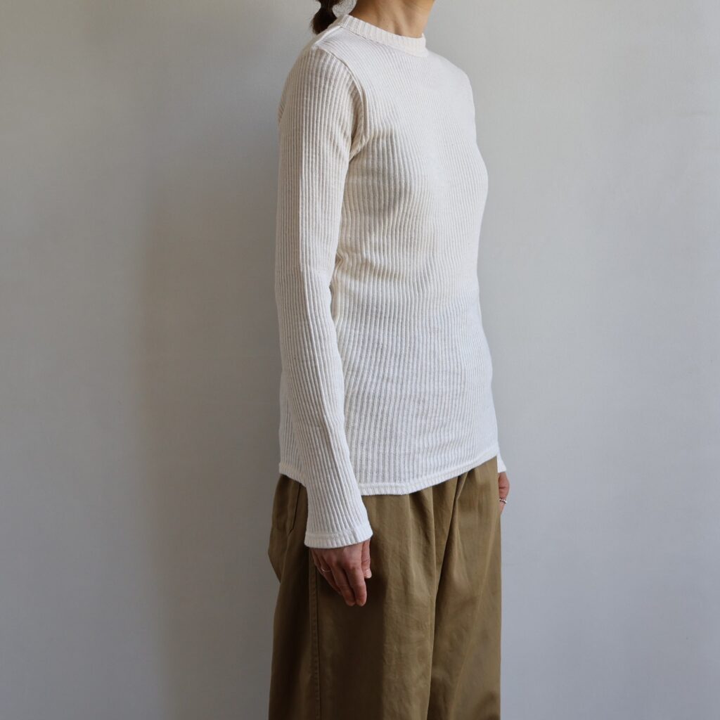 定番人気の”ガラガラテレコ”のカットソー。太い節のある糸でゆるく編まれたコットンのテレコは、体の動きに沿ってフィットする高い伸縮性で、なめらかな肌触りが特徴です。交互に現れる凹凸がストライプのような表情豊かなのもポイント。長めの袖と丈感で、一枚で着るのはもちろん、重ね着のインナーにも重宝します。