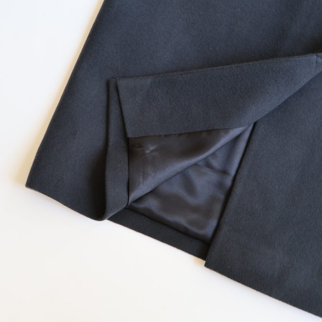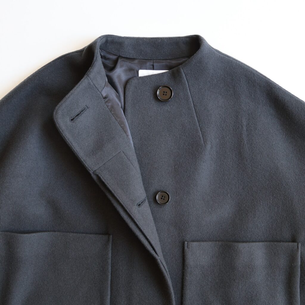 首元にわずかに立ち上がりをもたせたモックネックのようなデザインが特徴のラウンドネックコート。丸みのあるラインが首元をやさしく包み、上品な印象を引き立ててくれます。一番上のボタンはアクセントとして見せ、その下は比翼仕立ててでボタンをすっきりと隠したミニマルなデザイン。前を留めても開けても、美しいラインを保ちます。素材にはしなやかで保温性のあるウールメルトンを使用。しっかりとした厚みがありながら、軽くなめらかな表面感が冬の空気に映える一枚です。静かな存在感のあるデザインはシーンを選ばす、どんなスタイルにも自然に馴染みます。