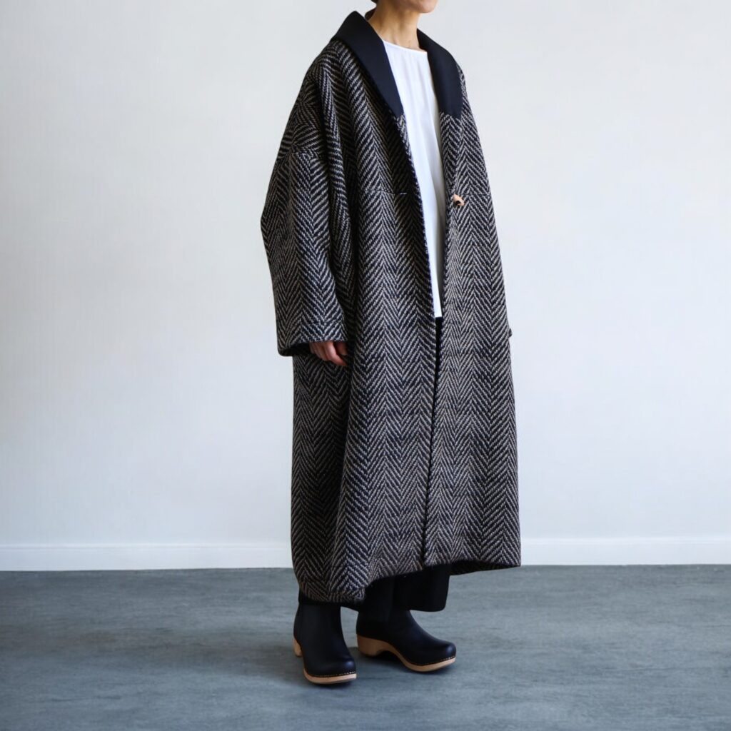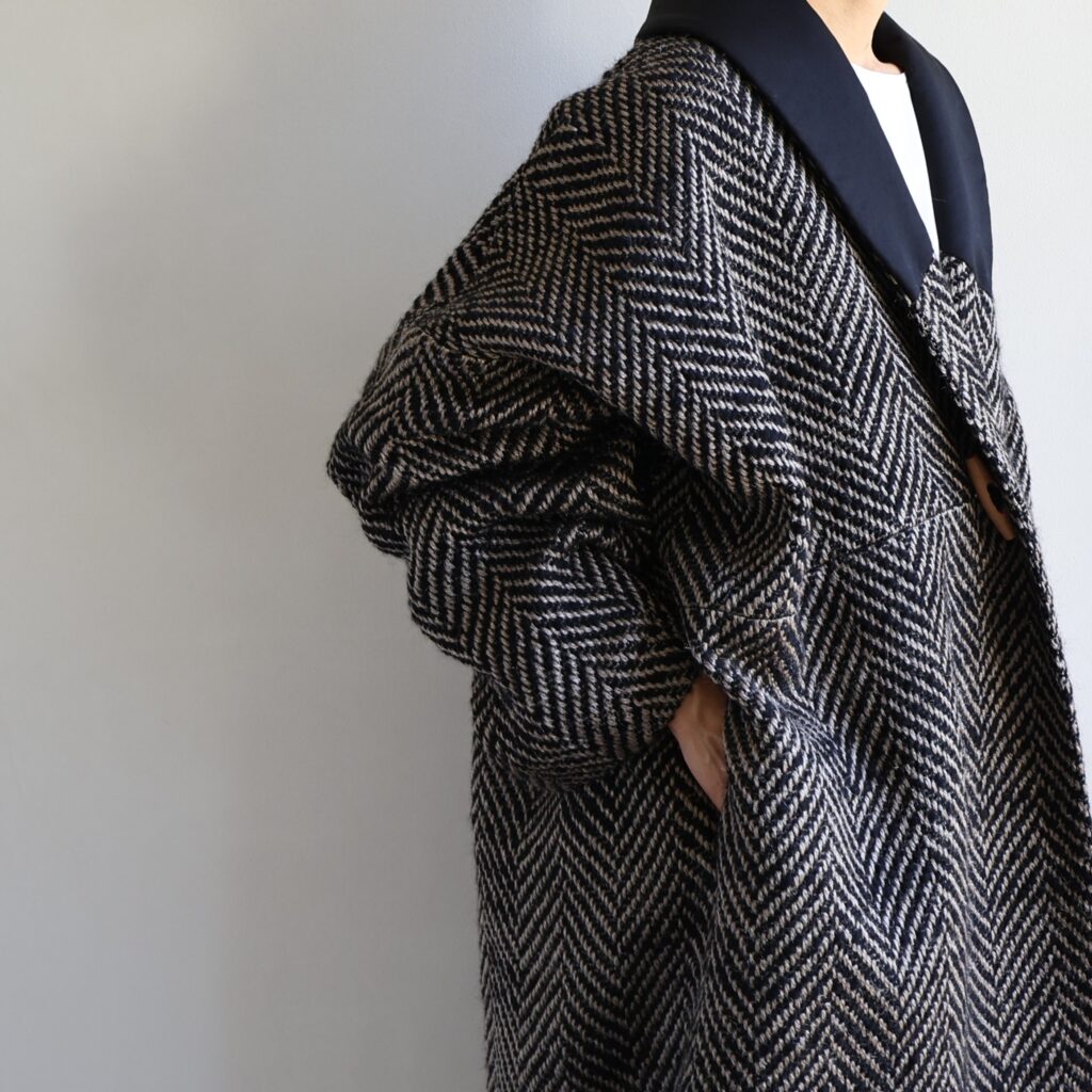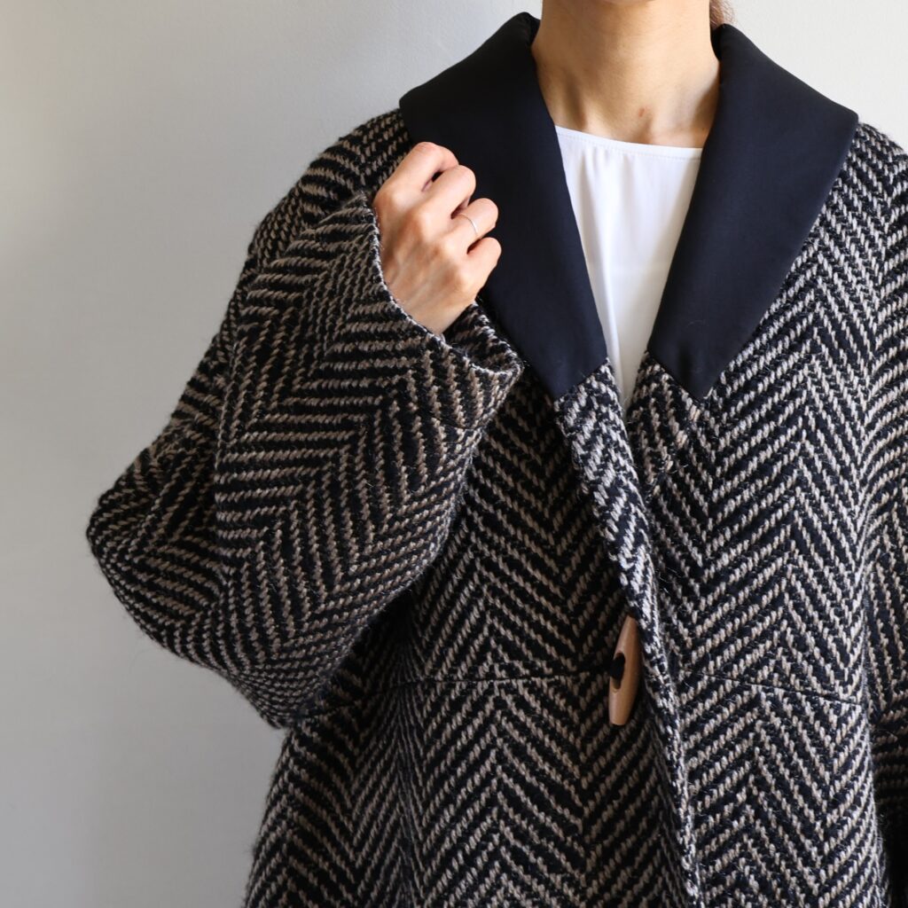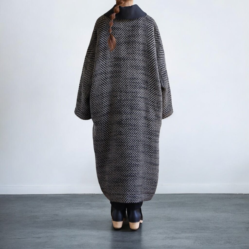 ウールの温もりがふわりと包み込むようなローブコート。ドロップショルダーとゆとりのあるシルエットが冬の装いを軽やかにみせてくれます。織り模様は上品なヘリンボーン。白と黒が織りなす陰影が美しく、さらりと羽織るだけで立体感のある表情に。前立てのトグルボタンがクラシックななかに軽やかな抜け感を添えています。厚手のニットやワンピースにも重ねやすく、動きにあわせて揺れる後ろ姿も印象的。寒さを遠ざけながら重くならない、冬の頼もしい一枚です。