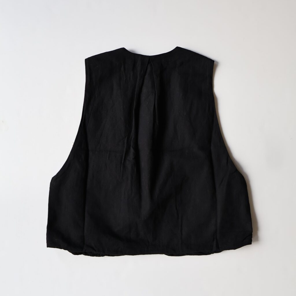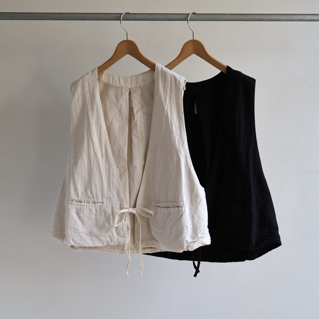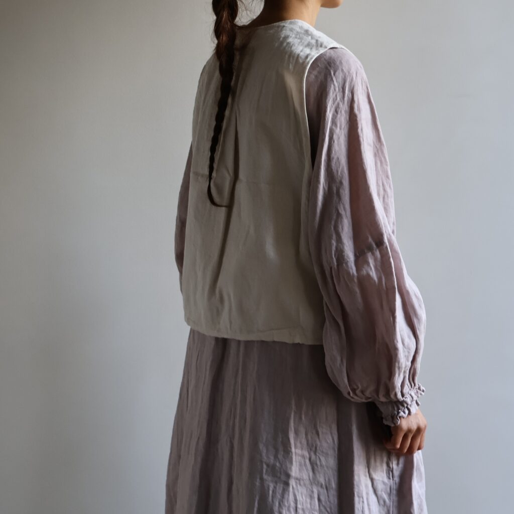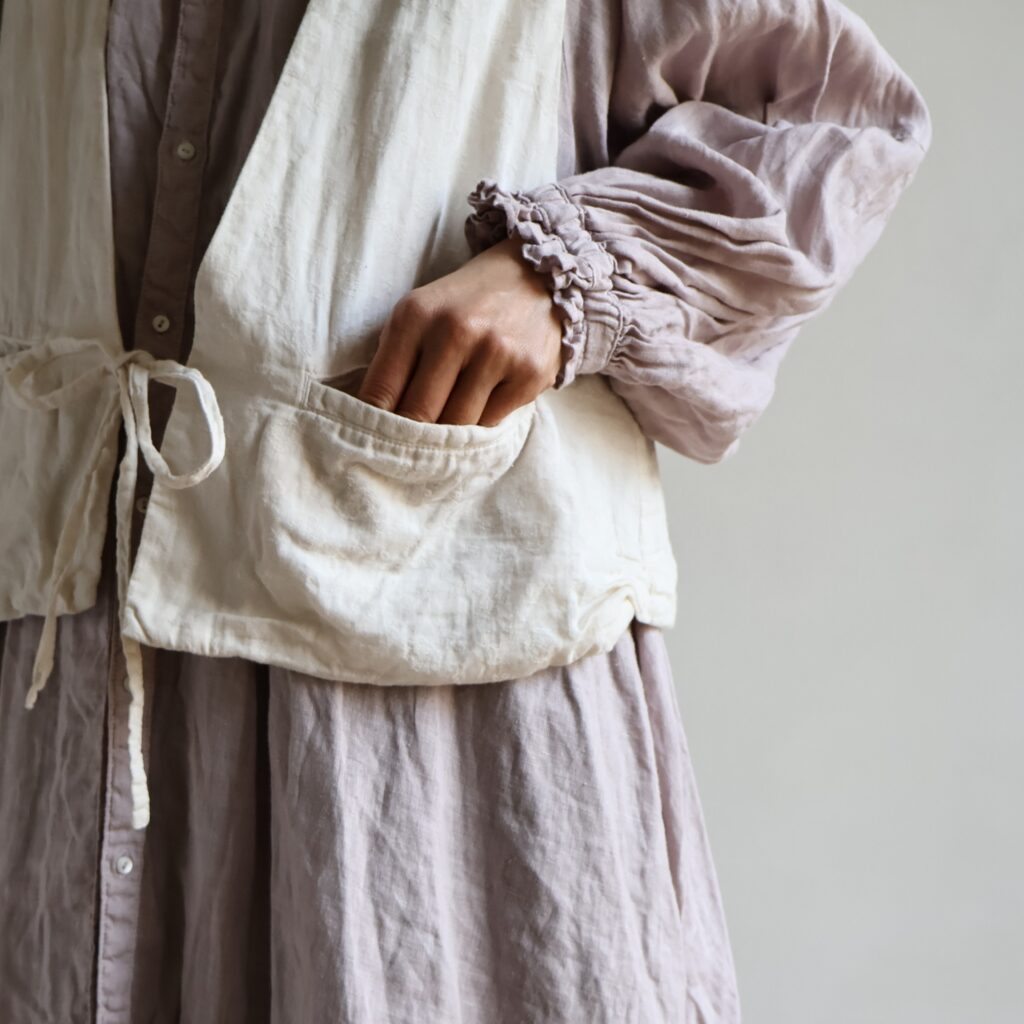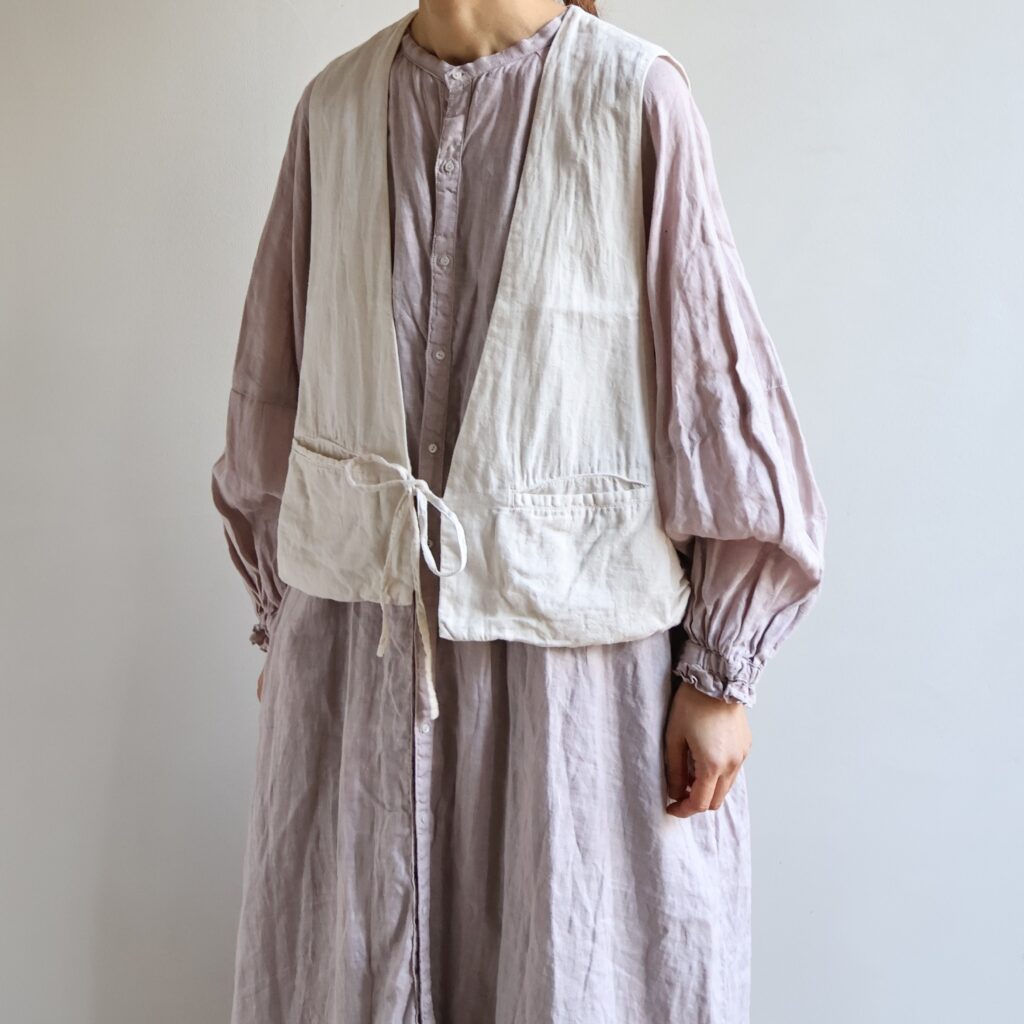 古い物語に登場する少女のワードローブをそっと覗いたような、どこか懐かしい空気をまとうジレ。ブランドがオリジナルで織り上げたアンティークローズジャカードは、コットン×リネンの柔らかな質感に、控えめな立体感と陰影が宿ります。デザインは、前で結ぶだけのシンプルなかたち。ワンピースに重ねたり、ブラウスやカットソーの上にふわりと羽織ったり、季節を問わずさまざまなスタイルに馴染みます。軽やかで、奥行きのある一枚を探している方におすすめです。