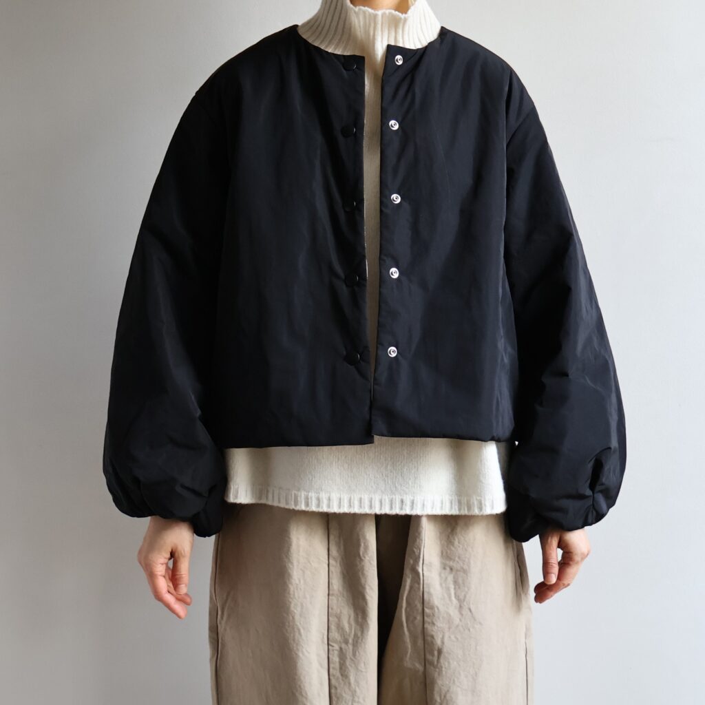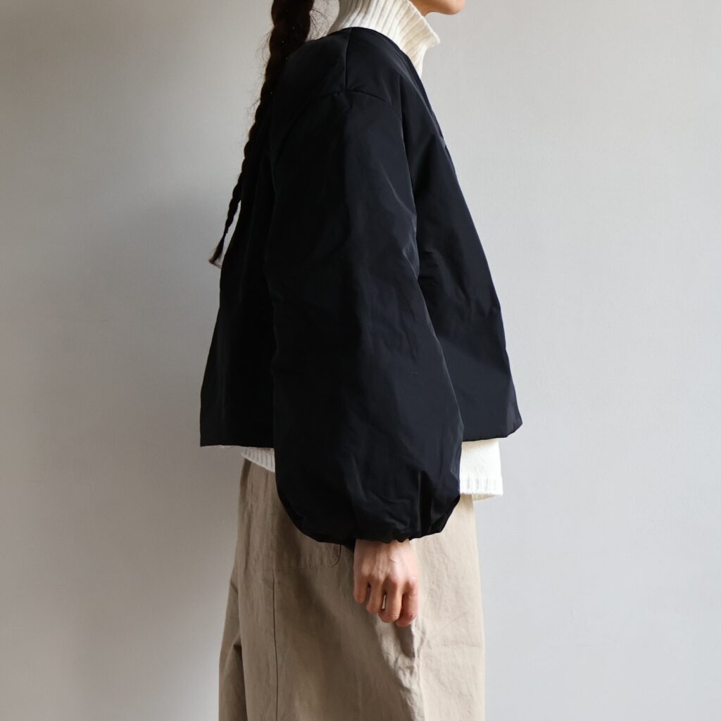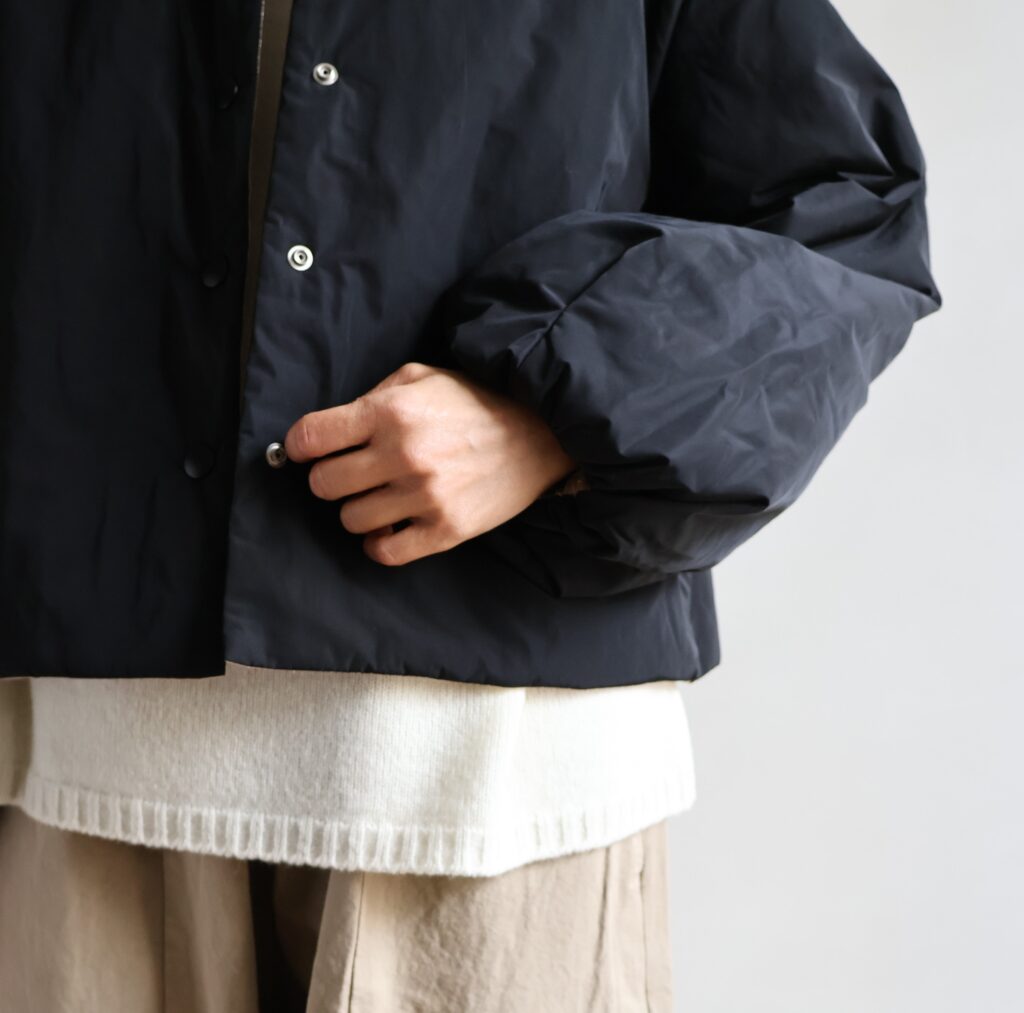 軽さと暖かさを両立した秋冬に頼れるライトアウターです。SUNSTATEと呼ばれる極細の繊維を用いたハイテク素材は、同じ厚みでもダウンの約2倍の保温力を持つのが特徴。驚くほど軽く、暖かさはしっかり。日常で気兼ねなく羽織れる頼もしさが詰まった一枚です。表地には撥水加工を施したタイプライター生地を重ね、そこに Gauze# らしいパターンを落とし込むことで、実用性とデザイン性を兼ね備えたジャケットに仕上がりました。袖はランタンのようにふくらみを持たせたシルエット。丸みがありながら軽やかで、スカートにもパンツにも馴染むバランスです。