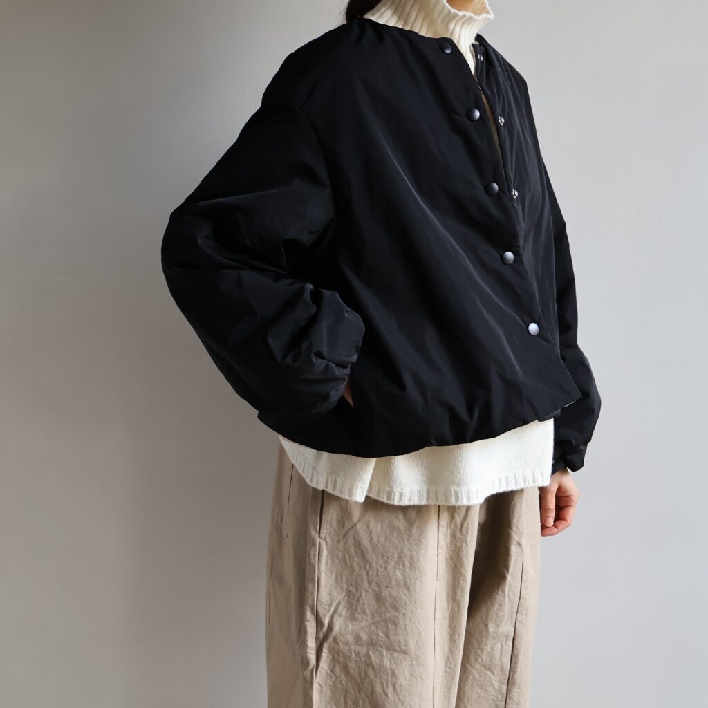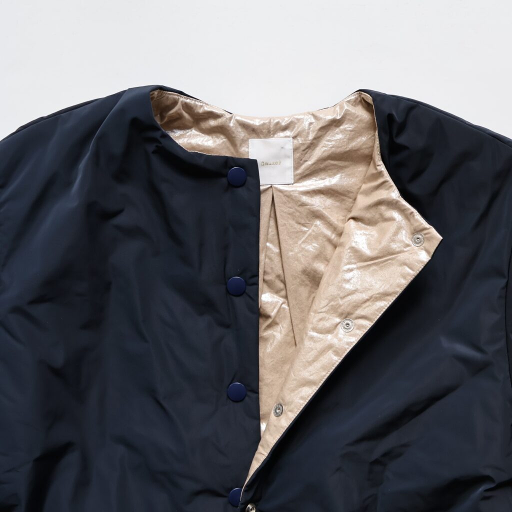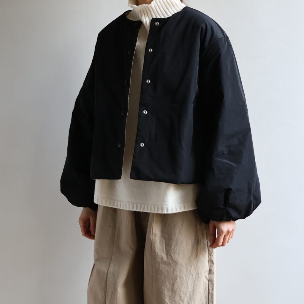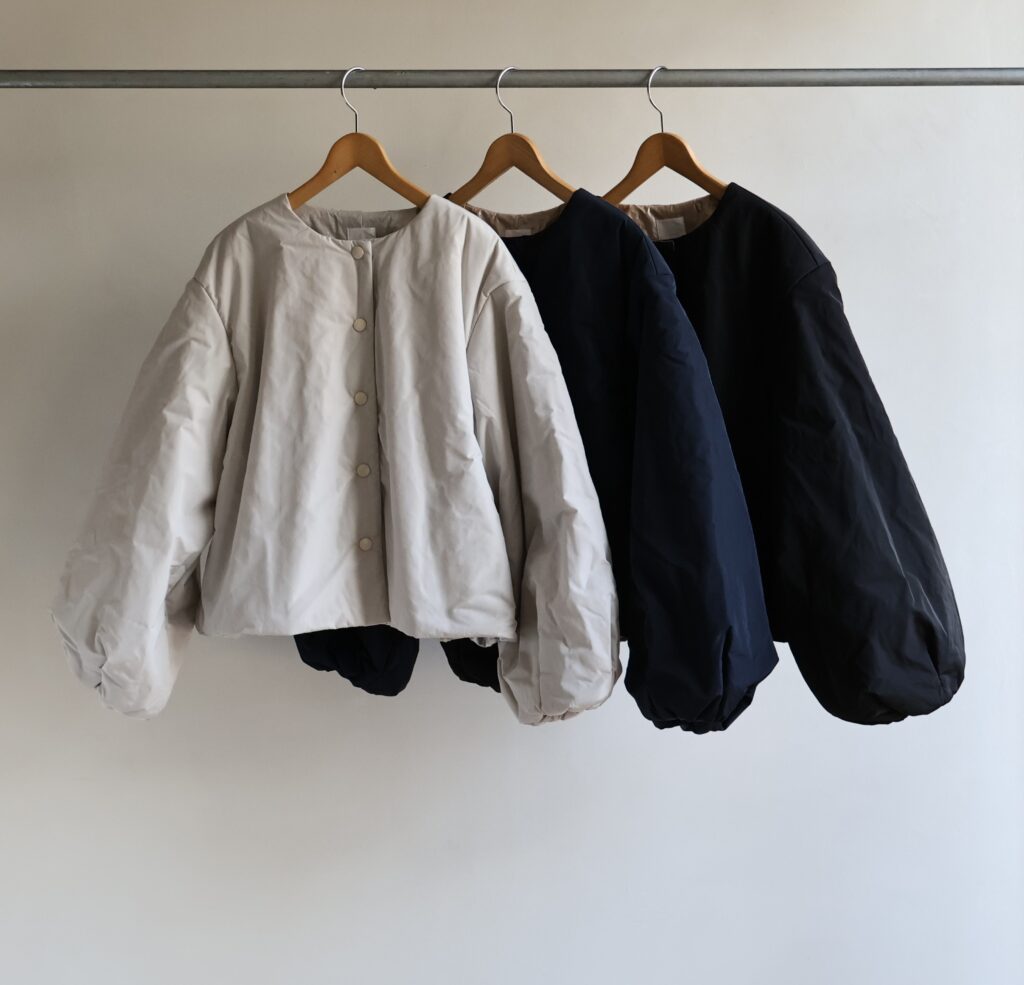 軽さと暖かさを両立した秋冬に頼れるライトアウターです。SUNSTATEと呼ばれる極細の繊維を用いたハイテク素材は、同じ厚みでもダウンの約2倍の保温力を持つのが特徴。驚くほど軽く、暖かさはしっかり。日常で気兼ねなく羽織れる頼もしさが詰まった一枚です。表地には撥水加工を施したタイプライター生地を重ね、そこに Gauze# らしいパターンを落とし込むことで、実用性とデザイン性を兼ね備えたジャケットに仕上がりました。袖はランタンのようにふくらみを持たせたシルエット。丸みがありながら軽やかで、スカートにもパンツにも馴染むバランスです。