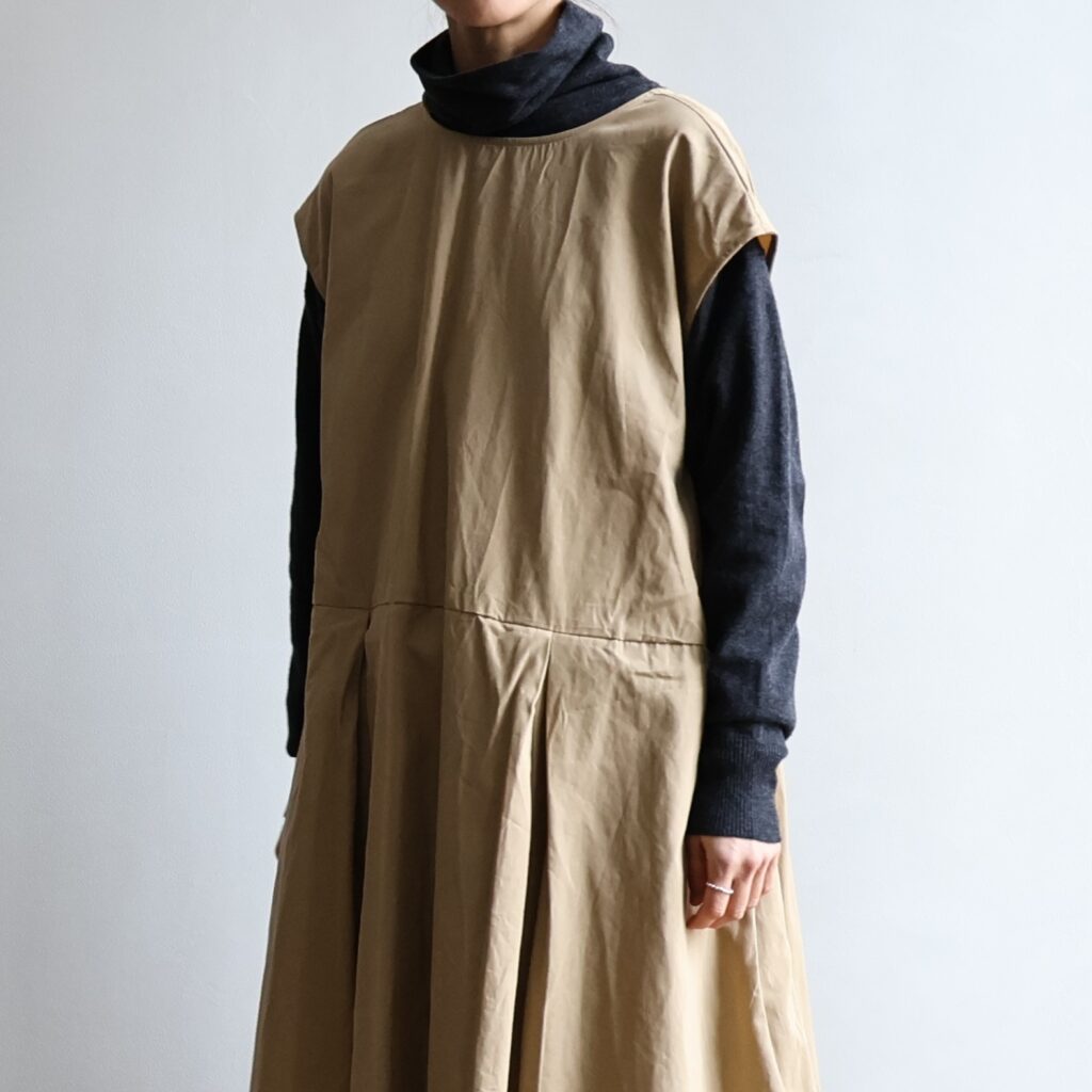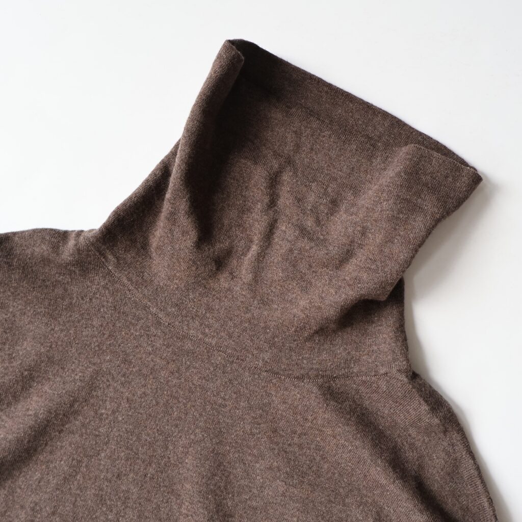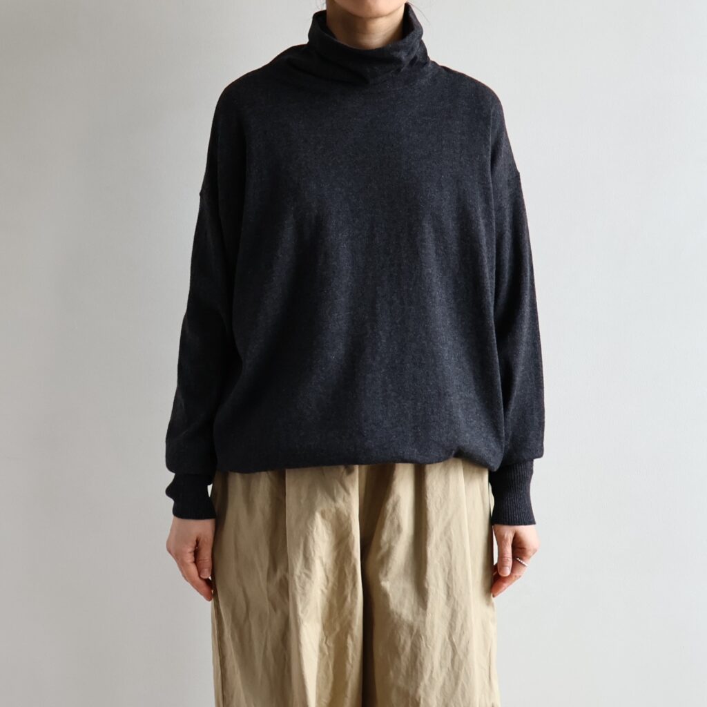 高さを出しすぎないデザインのタートルネックは、折りかえしても、くしゅっとさせても自然に収まります。ドロップショルダーで全体はリラックスしたシルエット。それでも首元に視線が集まることで、着こなし全体が引き締まって見えるのがポイントです。スカートに合わせて女性らしく、パンツに合わせて少しラフに、コートやジャケットのインナーとしても活躍する一枚です。