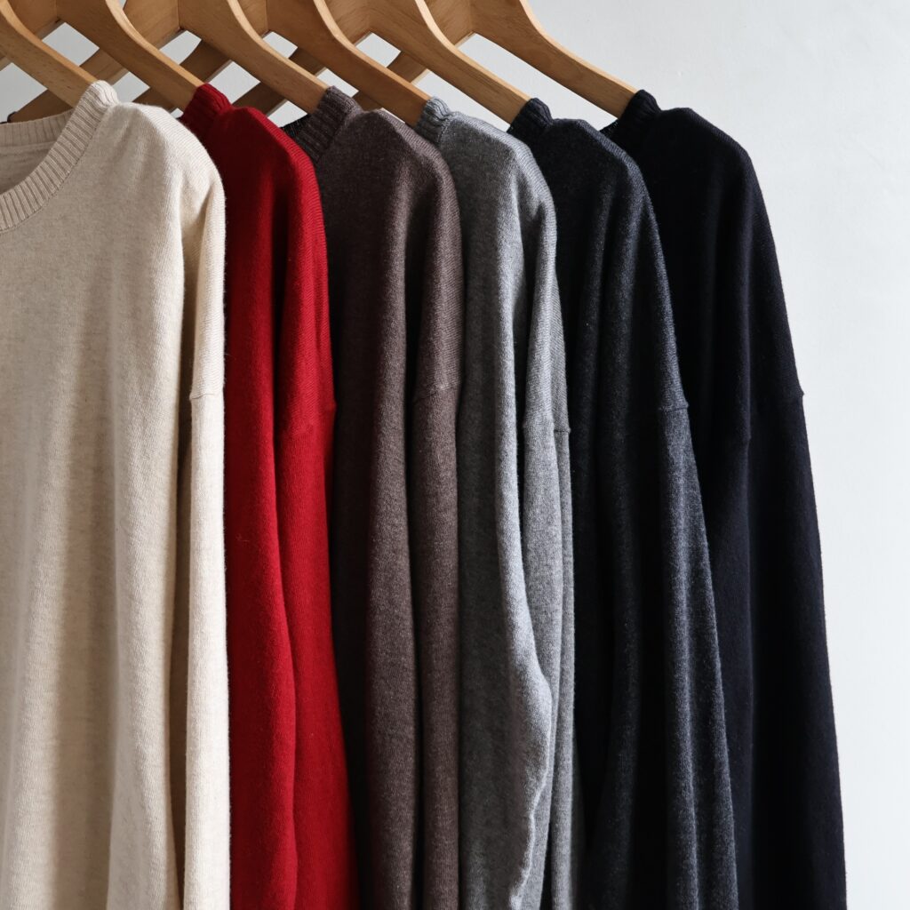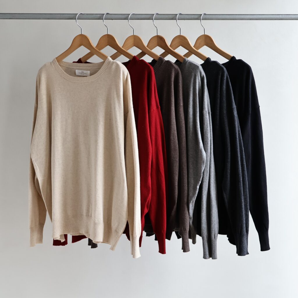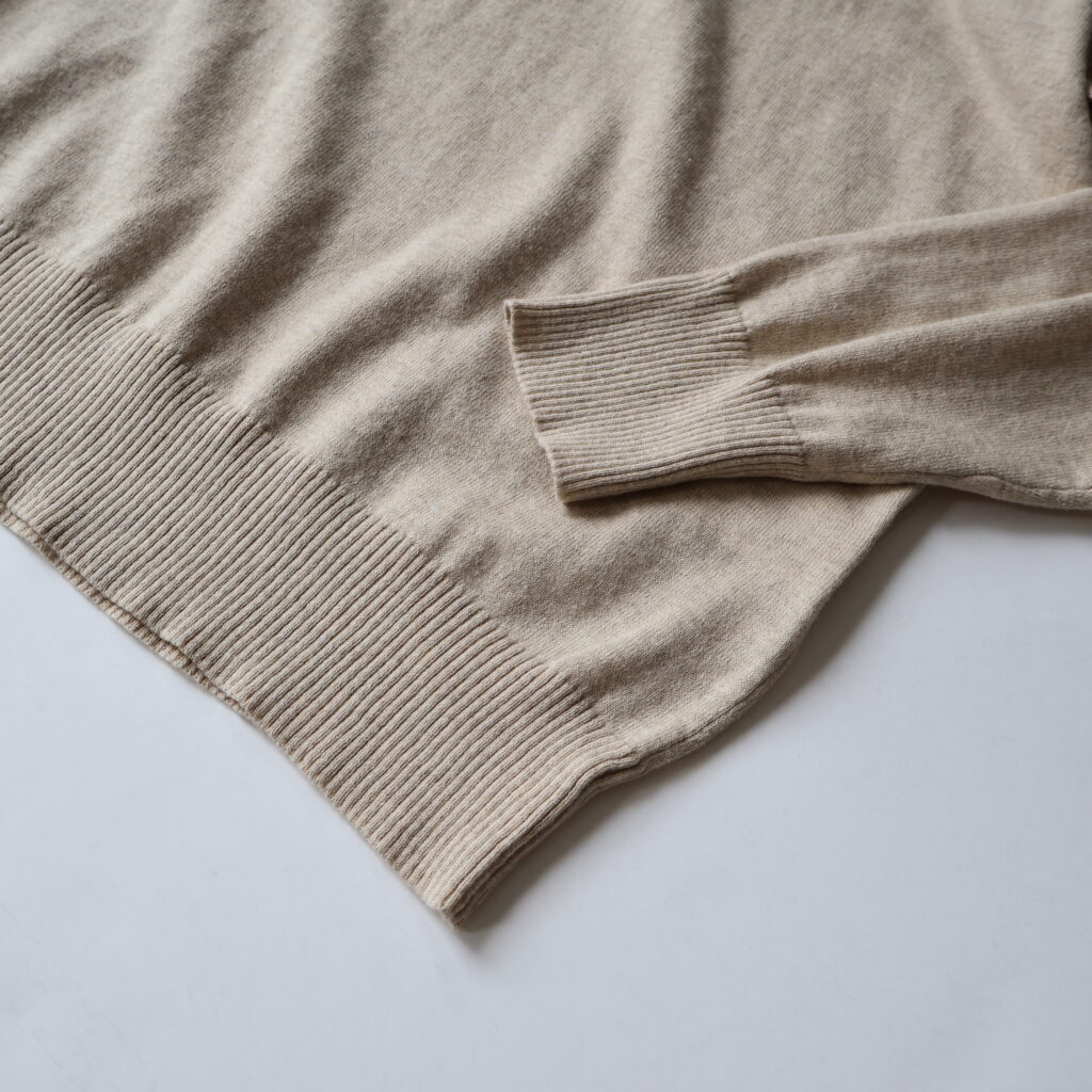 ニットを選ぶとき、あたたかさと、軽さと、着心地。そのどれかを我慢しなくていい一枚があると、冬の装いはぐっと楽になります。こちらは、コットンをベースにウールとカシミヤをブレンドした”COTTON WOOL CASHMERE”シリーズ。ハイゲージで編まれた生地は薄手でなめらか、そしてとても軽い素材。ニットにありがちなチクチク感はなく、直接肌に触れても気になりにくい、やさしい肌ざわりが特徴です。
