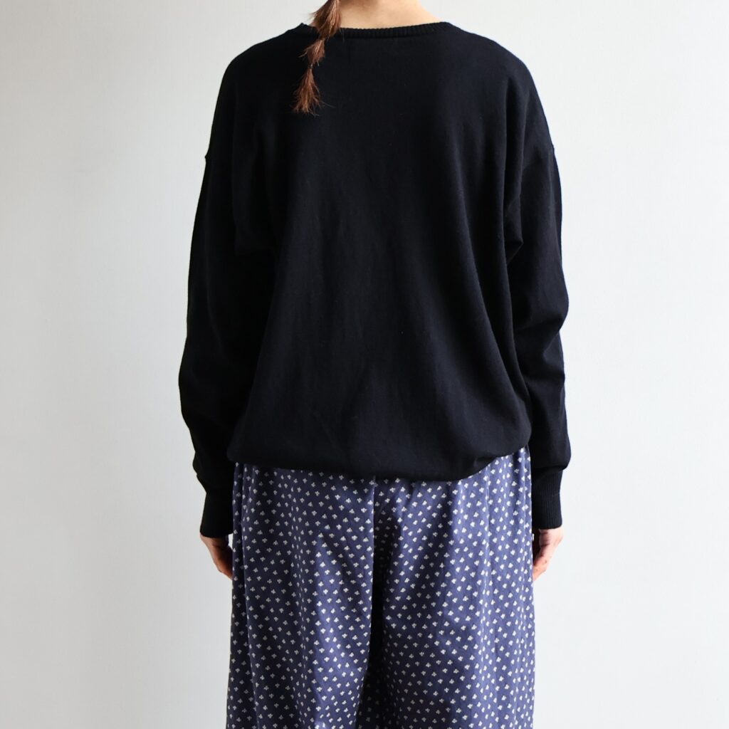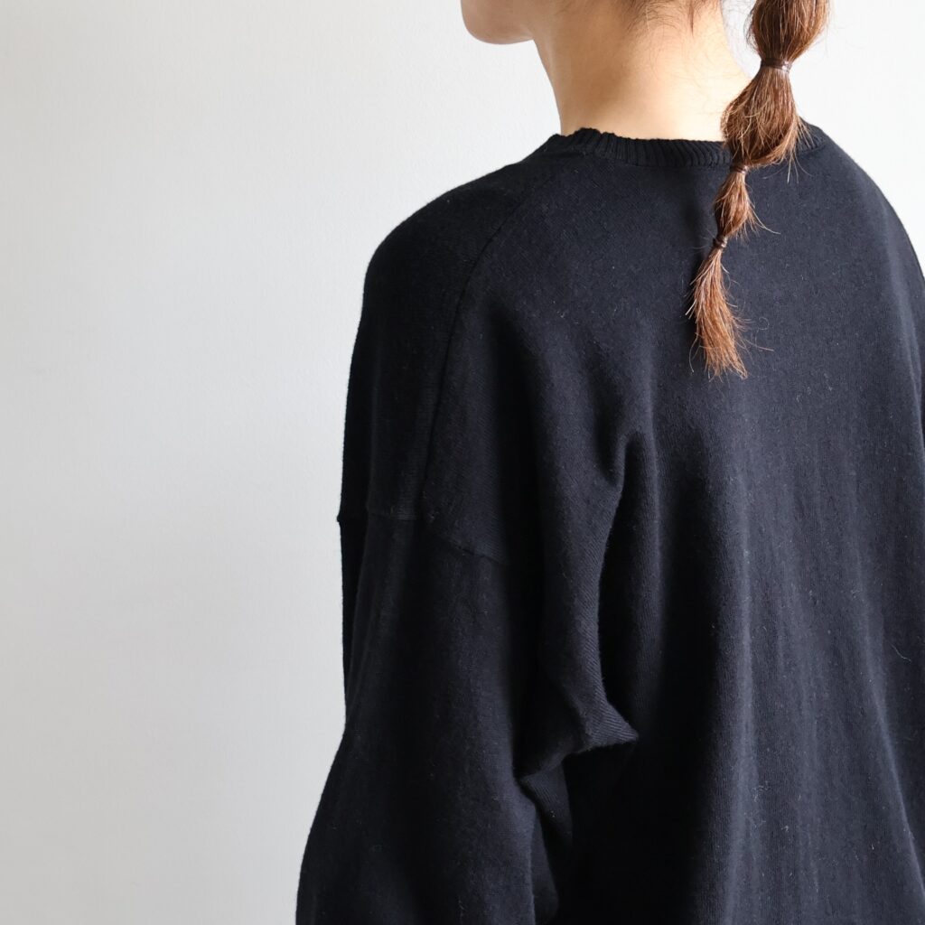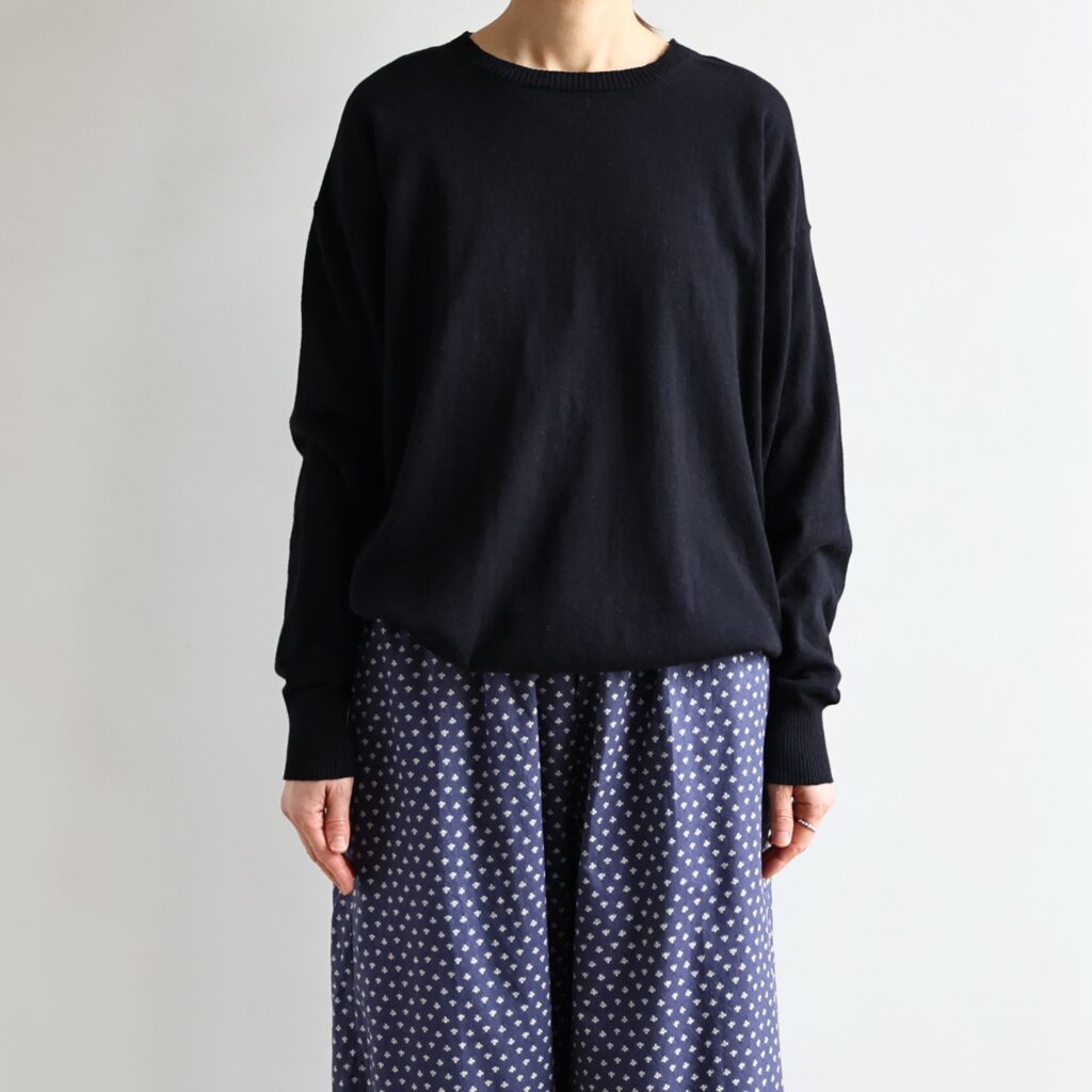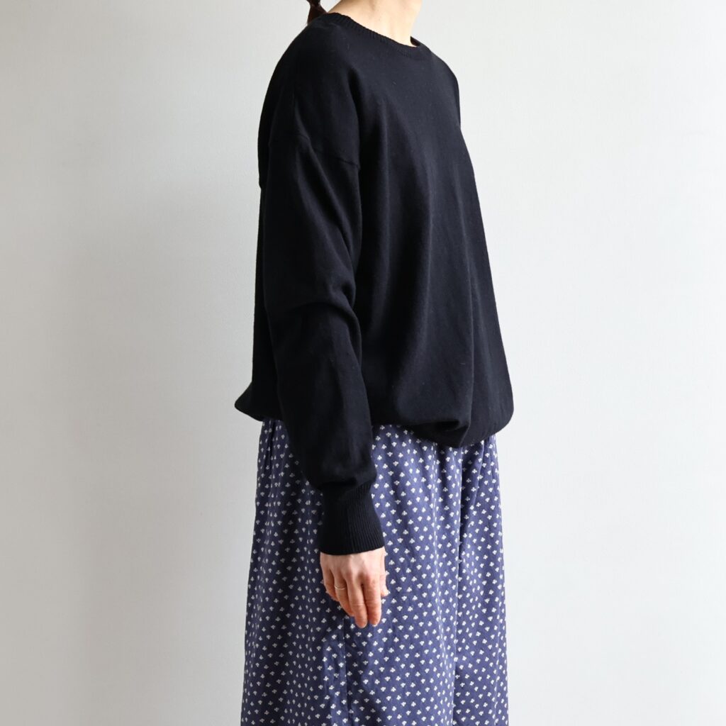 形そのもののバランスが魅力のプルオーバー。身幅にゆとりを持たせたリラックス感にリブを効かせることで、肩の力を抜いて着られるのに、きちんと形が決まる、そんな安心感のある一枚です。首元がすっきりしているので、アクセサリーやストールで表情を足すのもおすすめです。