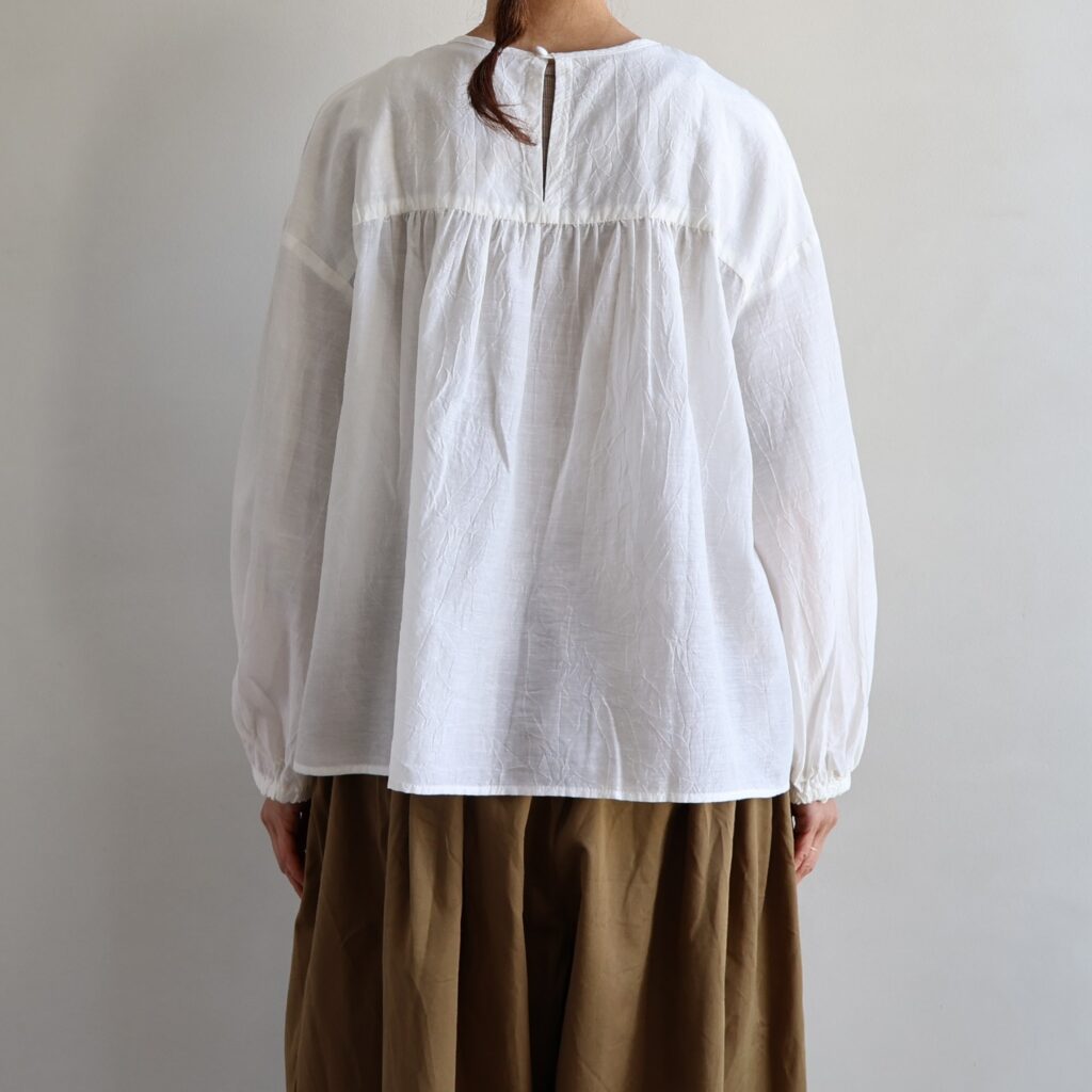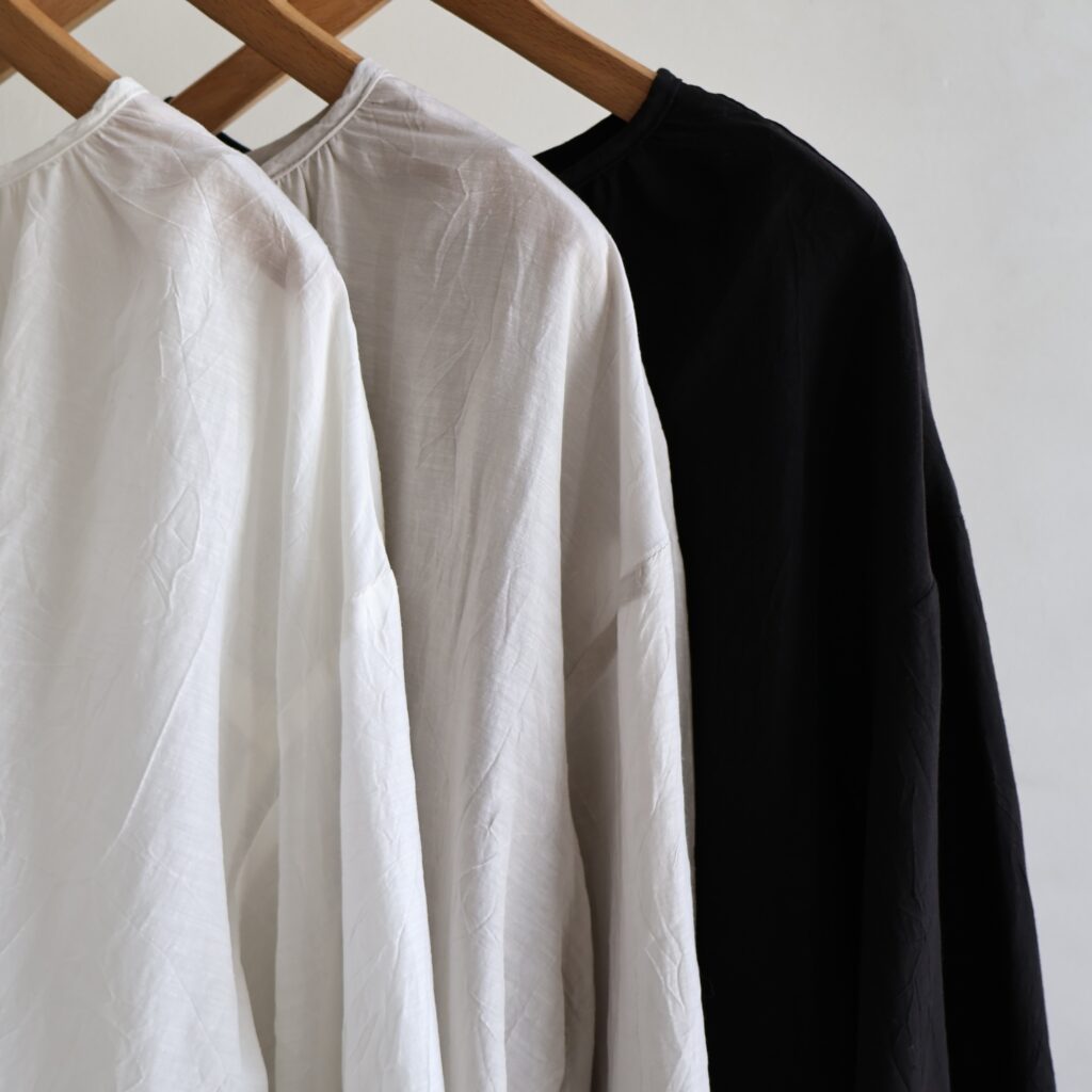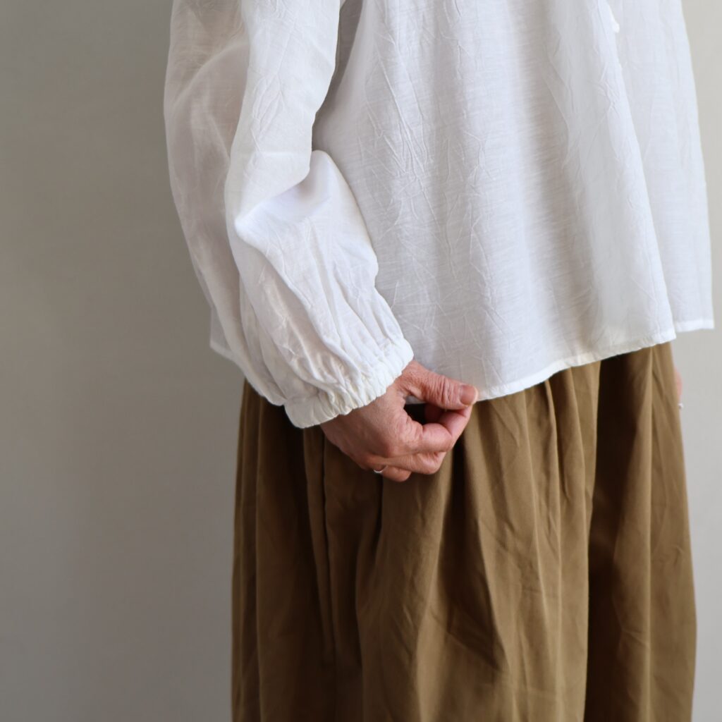 素材の表情に目がとまるブラウス。使われているのは、キュプラ、コットン、リネンを組み合わせたローン生地にシワをつけて染色しました。自然なシワ感は洗いを重ねても表情が残るのが特徴。一反ずつ、時間をかけてシワを入れているため、同じものはひとつとしてなく、それぞれに異なる表情を持っています。