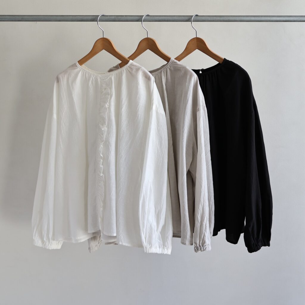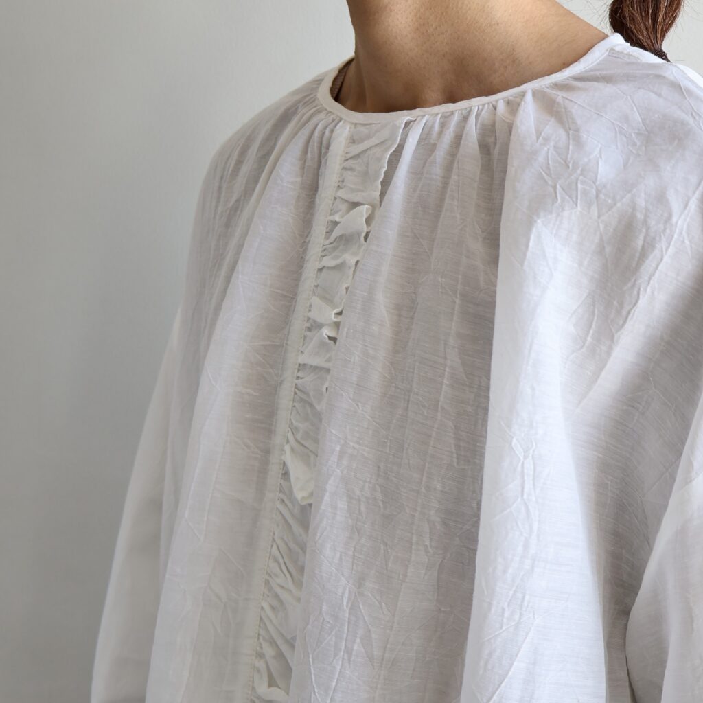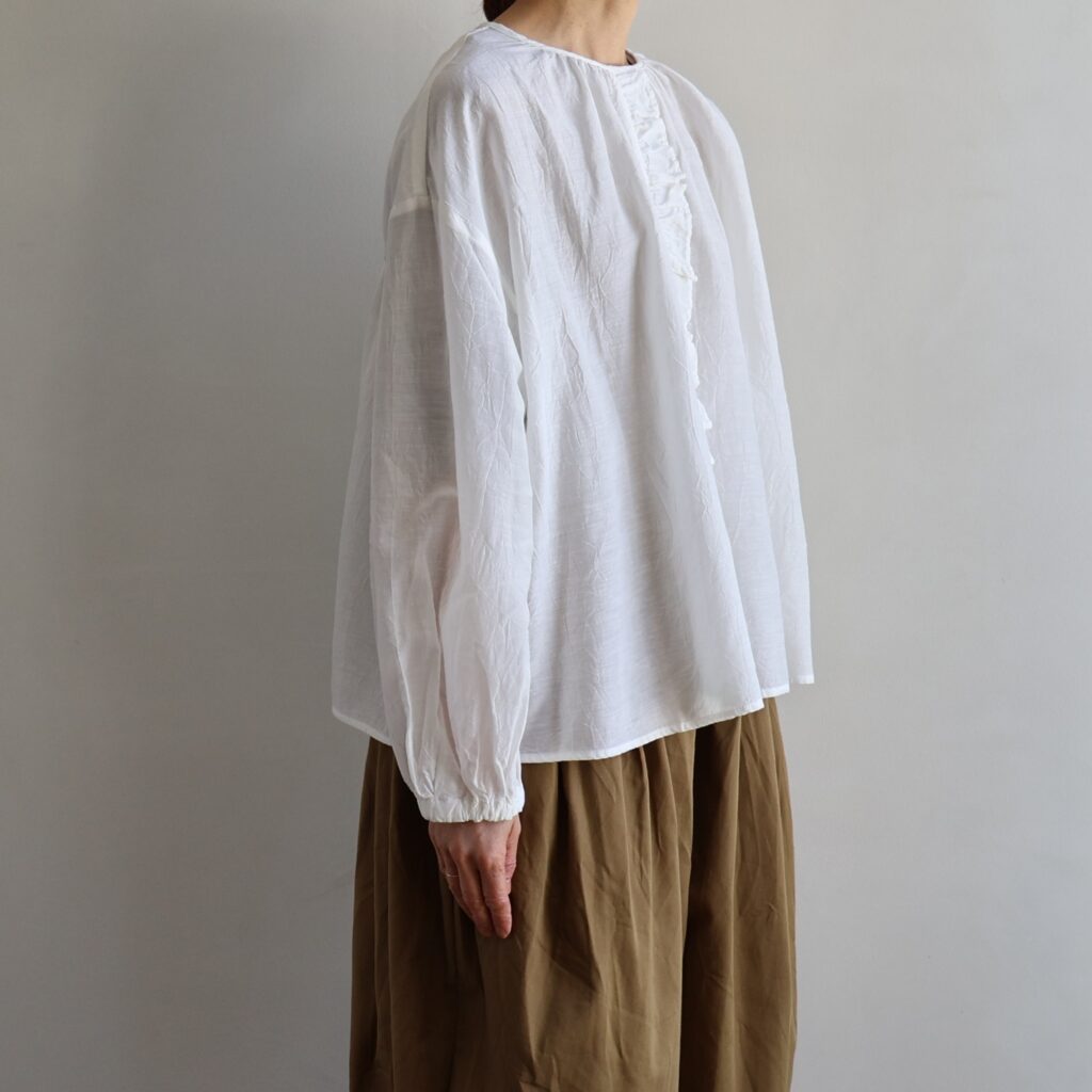 素材の表情に目がとまるブラウス。使われているのは、キュプラ、コットン、リネンを組み合わせたローン生地にシワをつけて染色しました。自然なシワ感は洗いを重ねても表情が残るのが特徴。一反ずつ、時間をかけてシワを入れているため、同じものはひとつとしてなく、それぞれに異なる表情を持っています。