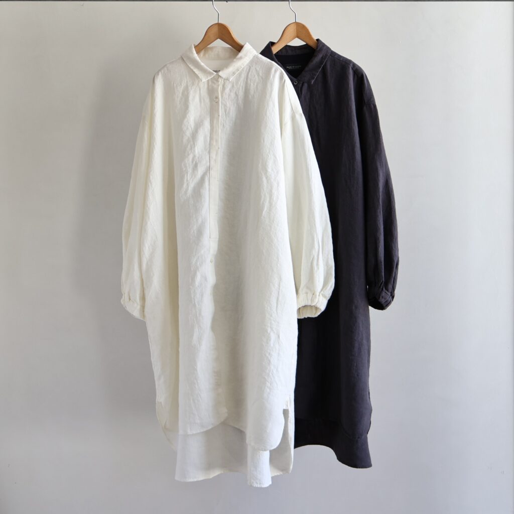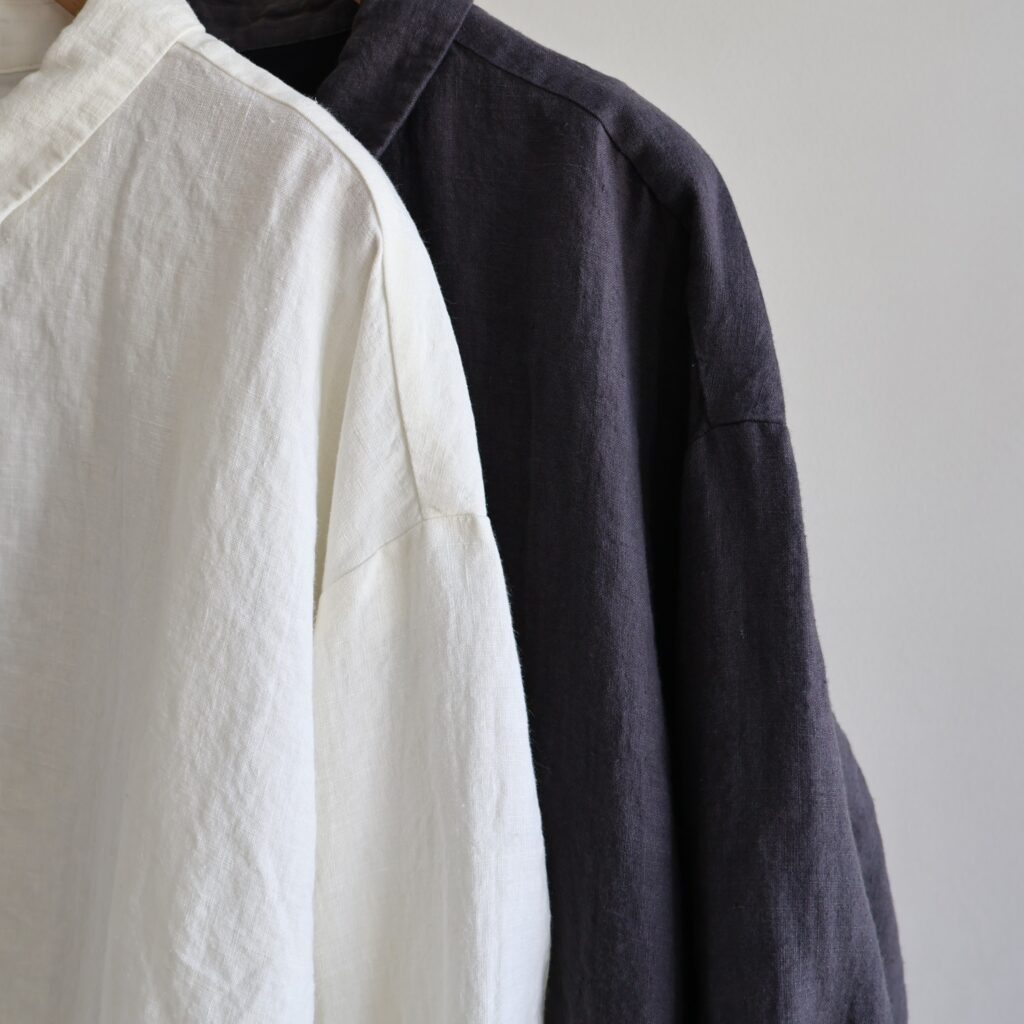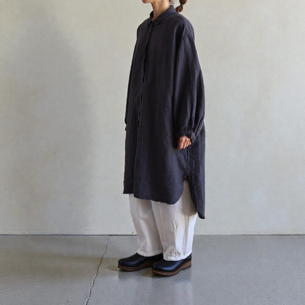 桐七炊きの加工を施したロングシャツです。織りと染めの産地として知られる群馬県桐生で、伝統的な技法を今の服づくりに落とし込んだ生地。時間をかけて揉み込み、炊き上げることで、リネン100%とは思えないほど柔らかく、ヴィンテージ感のある風合いに仕上がっています。ゆったりとしたシルエットに膨らみを持たせたパフスリーブ。体のラインを拾わず、パンツスタイルにも自然と馴染みます。シャツとしてはもちろん、季節の変わり目には、軽い羽織りものとしても活躍する一着です。