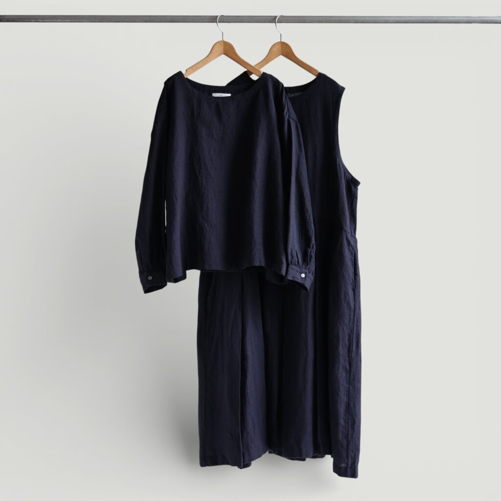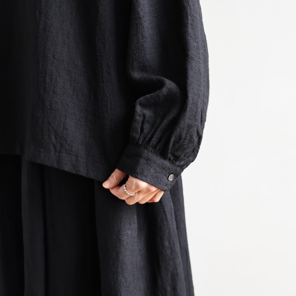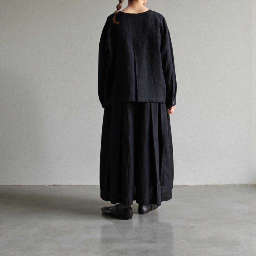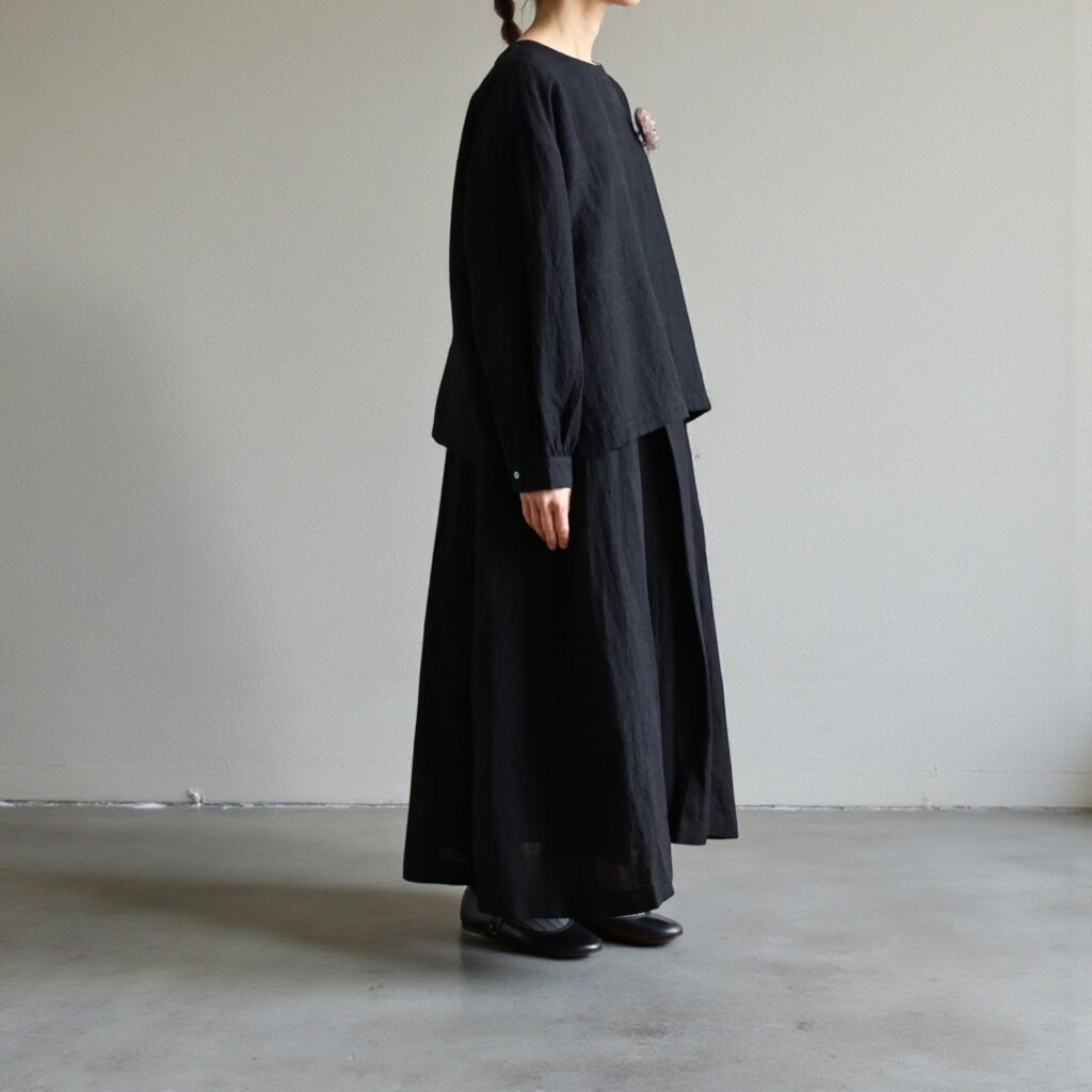 春を待つ時季に心地よい、SOILのウールリネン素材のセットアップ。上下を同じ素材で合わせることで、きちんと感がありながら自然体の雰囲気に仕上がります。プルオーバーの後ろプリーツとワンピースの縦に流れるプリーツが重なり合い、動くたびに静かな立体感と陰影が生まれます。