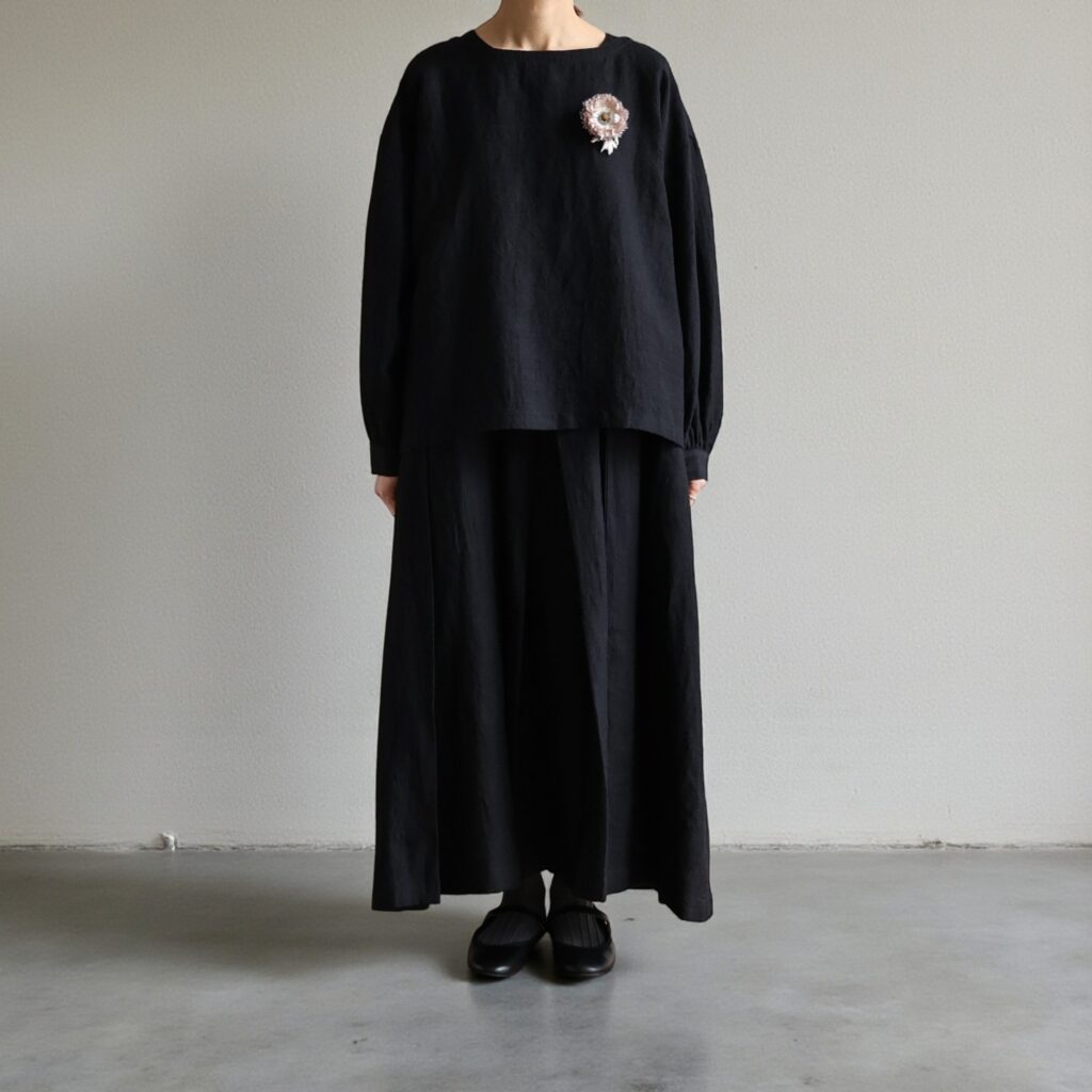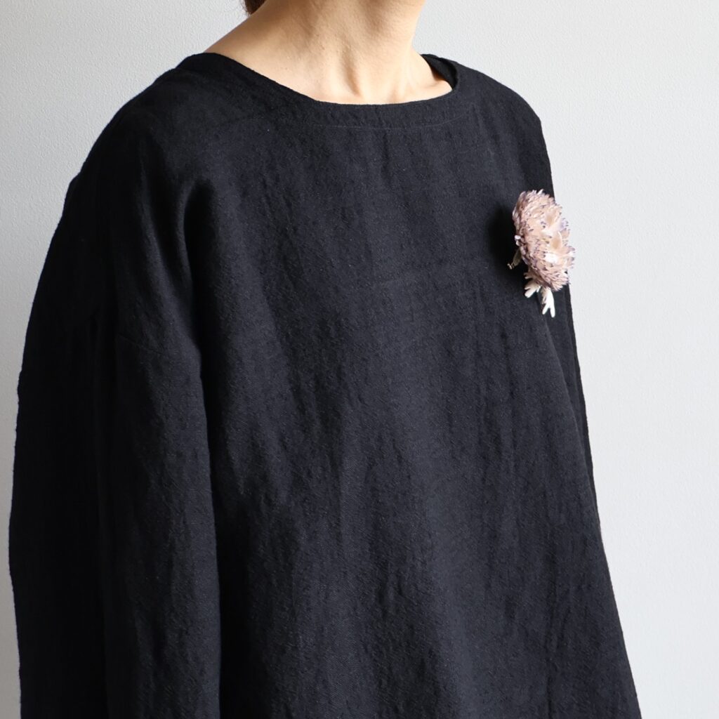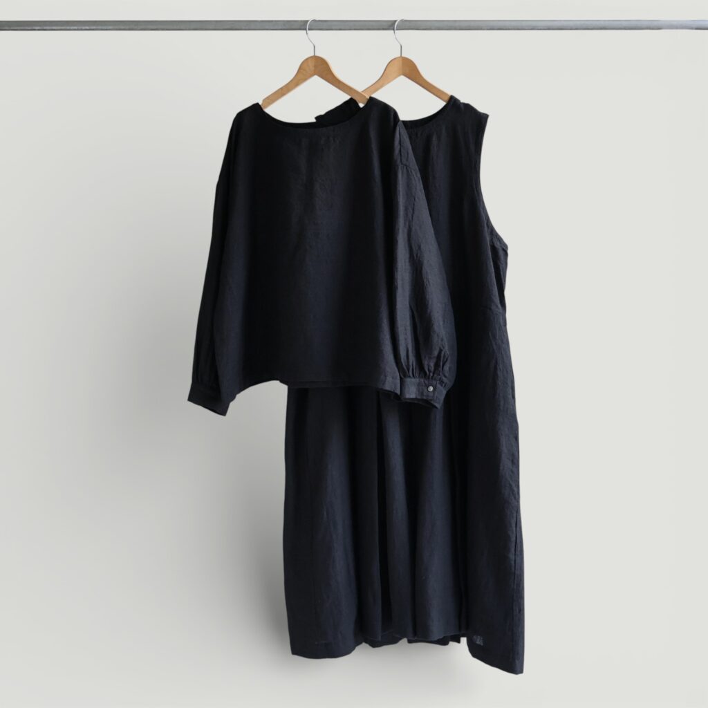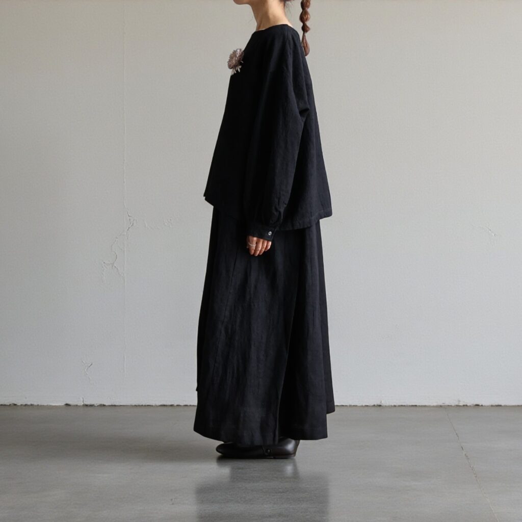 春を待つ時季に心地よい、SOILのウールリネン素材のセットアップ。上下を同じ素材で合わせることで、きちんと感がありながら自然体の雰囲気に仕上がります。プルオーバーの後ろプリーツとワンピースの縦に流れるプリーツが重なり合い、動くたびに静かな立体感と陰影が生まれます。