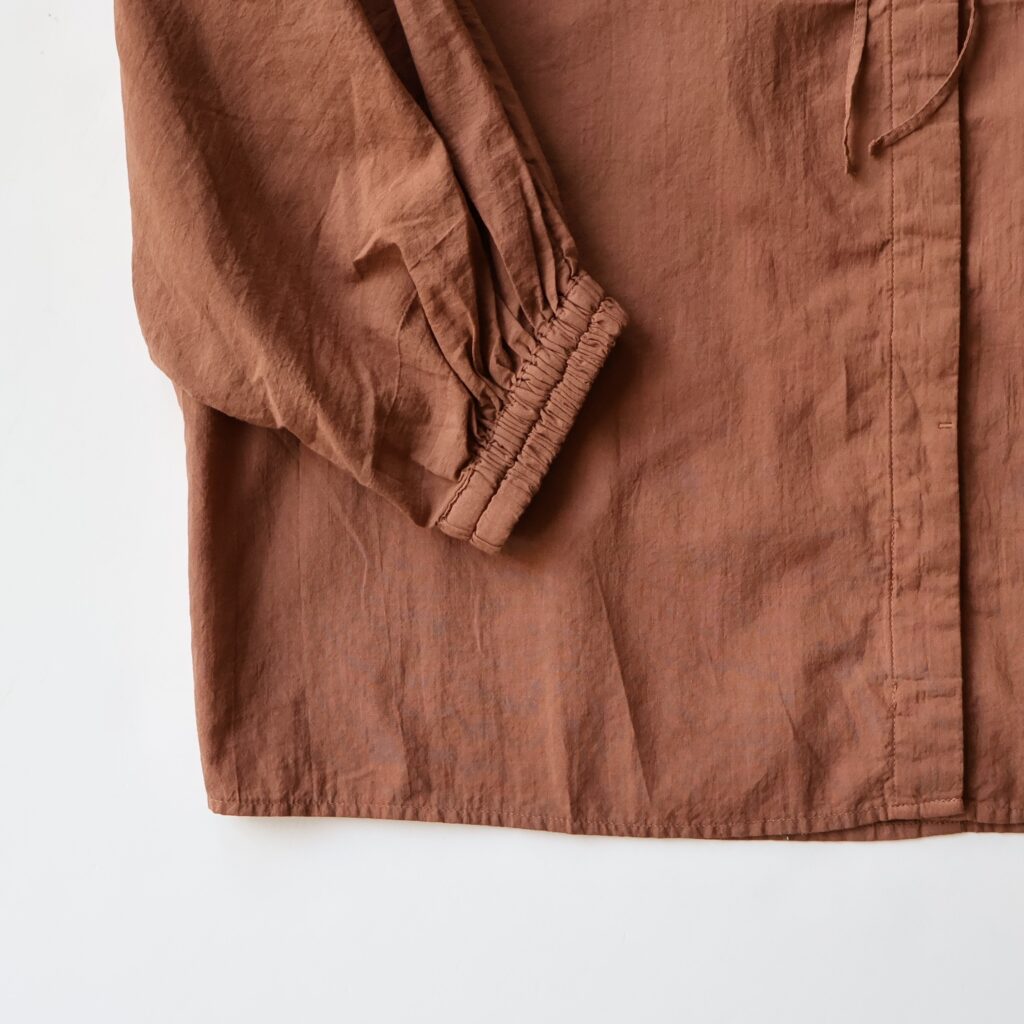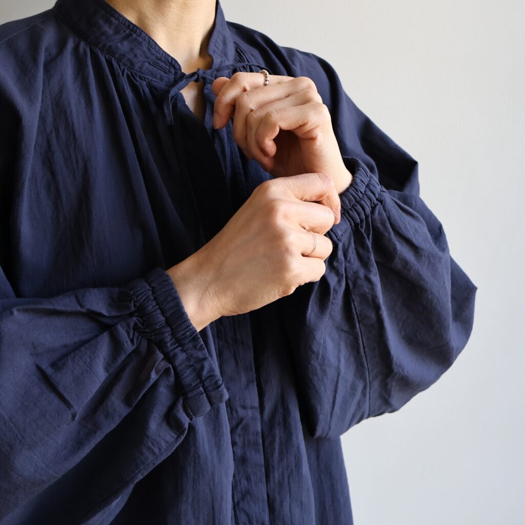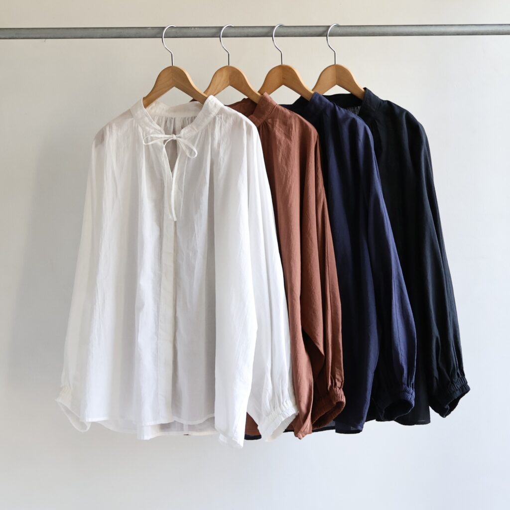 ゆったりした身幅と落ち感のあるドルマンスリーブ。体のラインを拾わず、すっきりと整うシルエットです。コットンリネンのラミーローン素材は、近江晒ならではのやわらかな風合い。ほんのりとしたハリを持ちながら、肌あたりはやさしく、気を含むような軽やかさが魅力です。袖口のギャザーと首元のリボンがさりげないアクセントに。春先から心地よく着ていただけます。