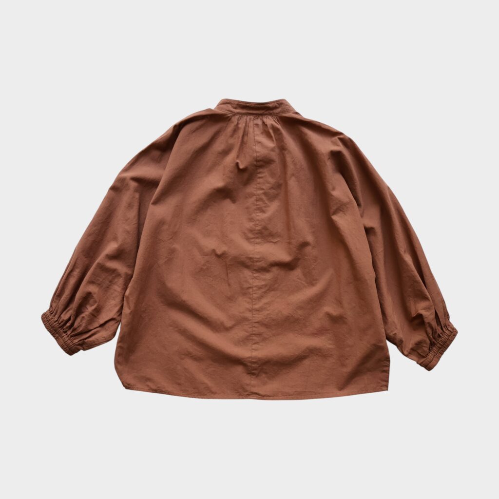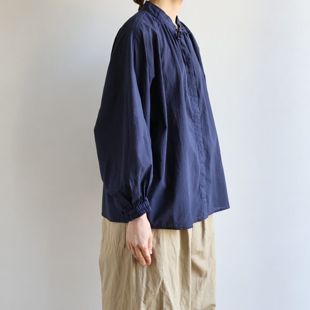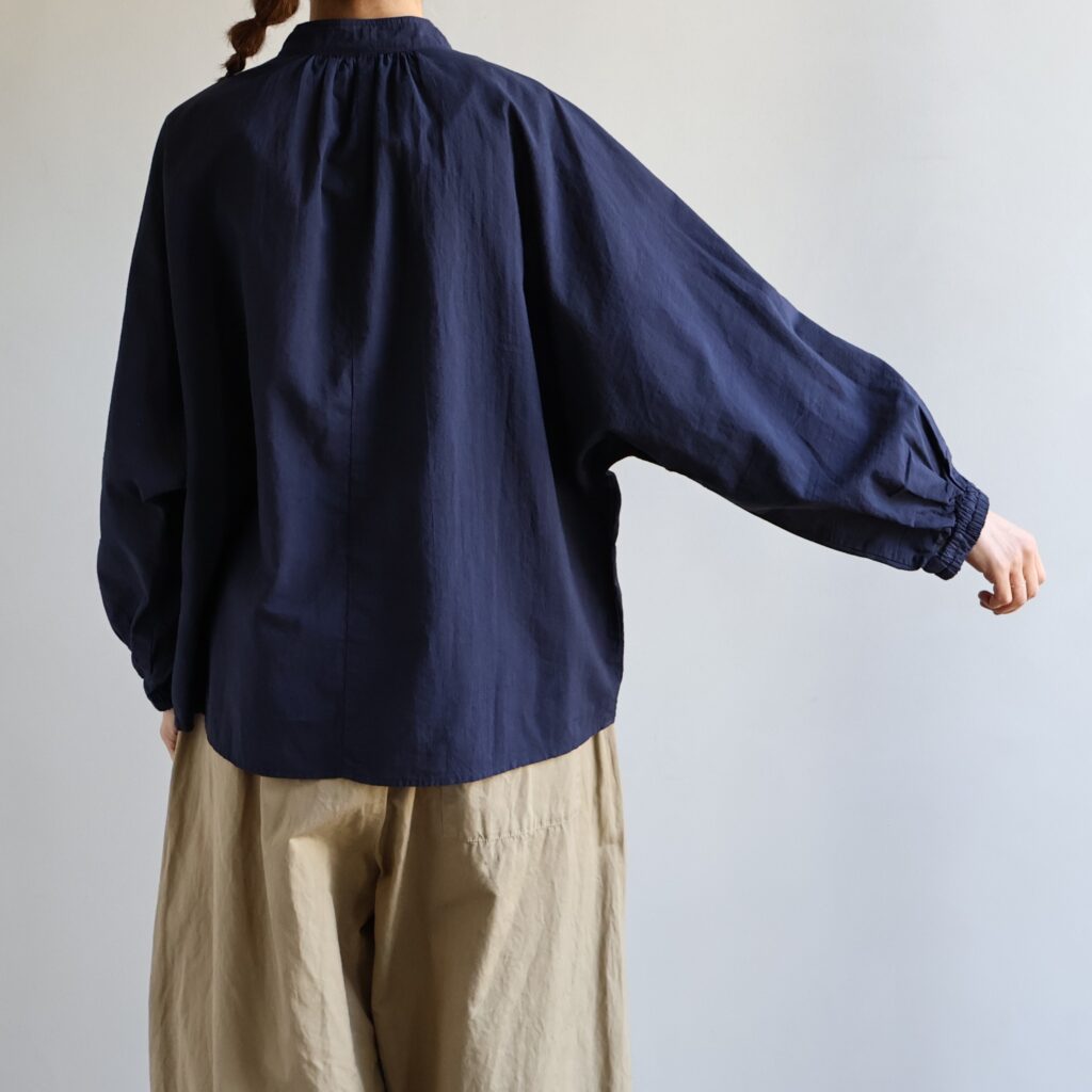 ゆったりした身幅と落ち感のあるドルマンスリーブ。体のラインを拾わず、すっきりと整うシルエットです。コットンリネンのラミーローン素材は、近江晒ならではのやわらかな風合い。ほんのりとしたハリを持ちながら、肌あたりはやさしく、気を含むような軽やかさが魅力です。袖口のギャザーと首元のリボンがさりげないアクセントに。春先から心地よく着ていただけます。
