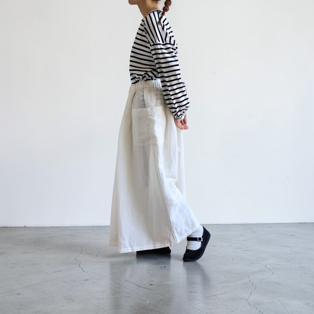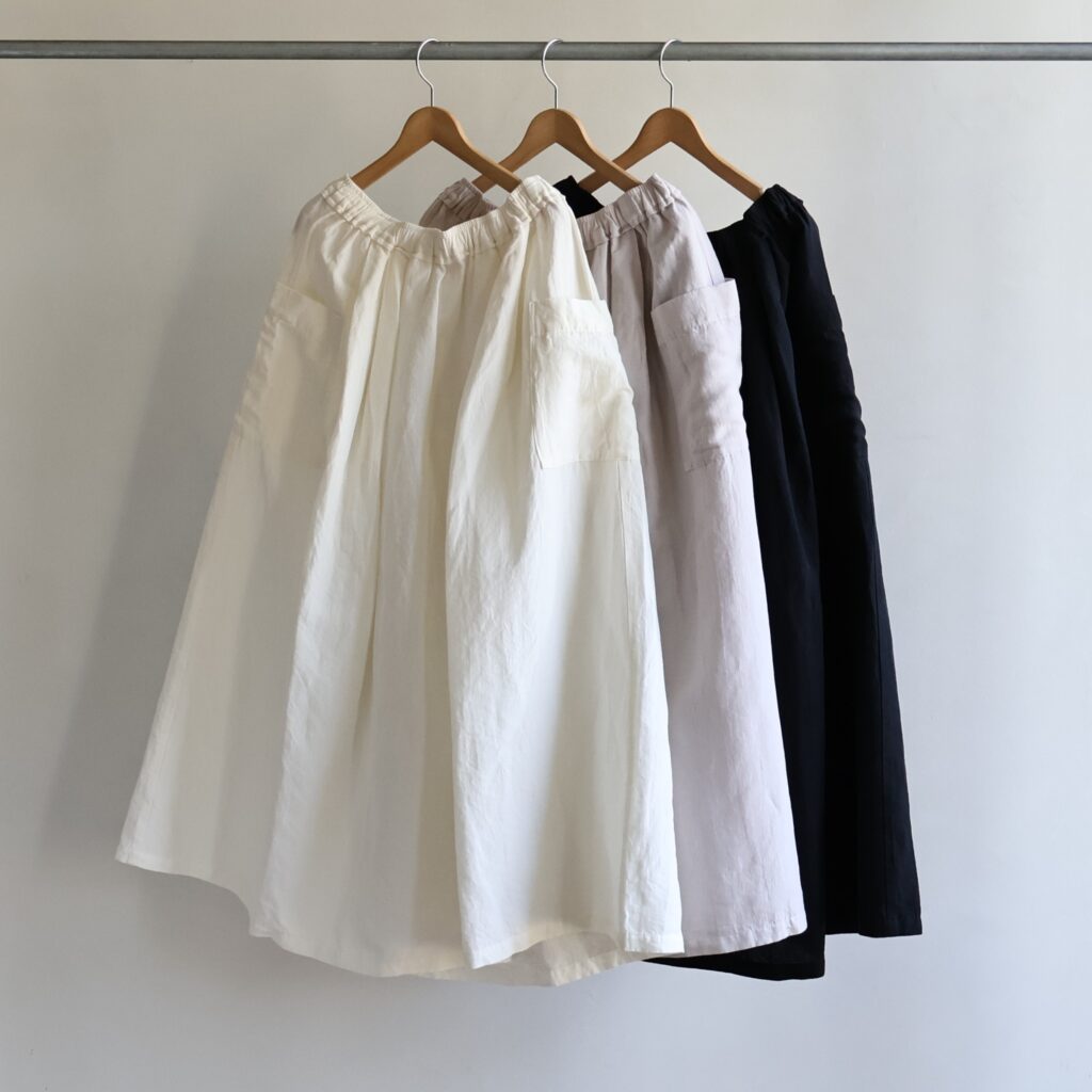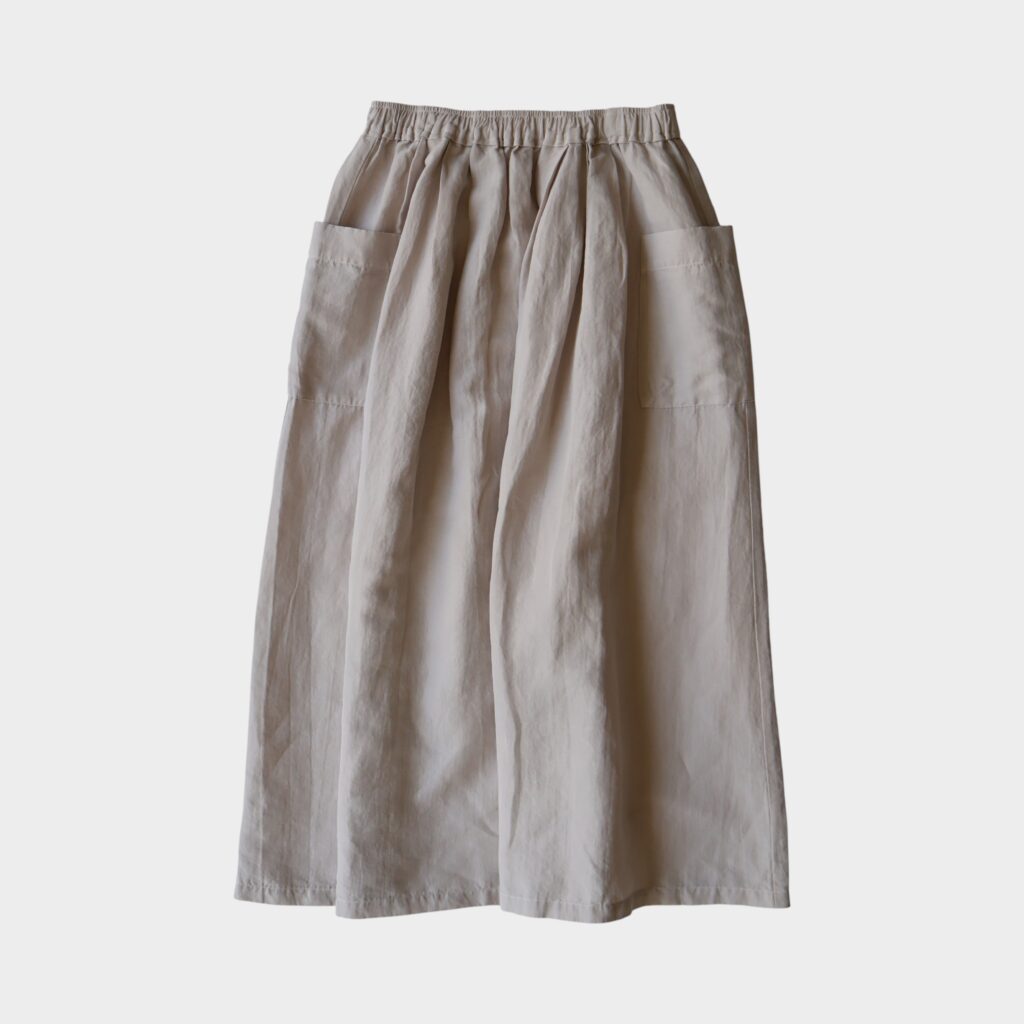サイドに配された大きめのポケットが印象的なギャザースカート。広がりすぎないシルエットでトップスを選ばず着ていただけます。麻のさらりとした表情に綿のやわらかさをあわせ持つ、軽やかで肌なじみのよいビエラ素材を使用。洗いをかけることで生地に自然な膨らみと奥行きが生まれています。軽やかで日常にちょうどいい存在感。季節の装いをやさしく整えてくれる一枚です。