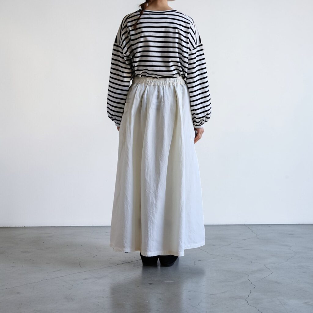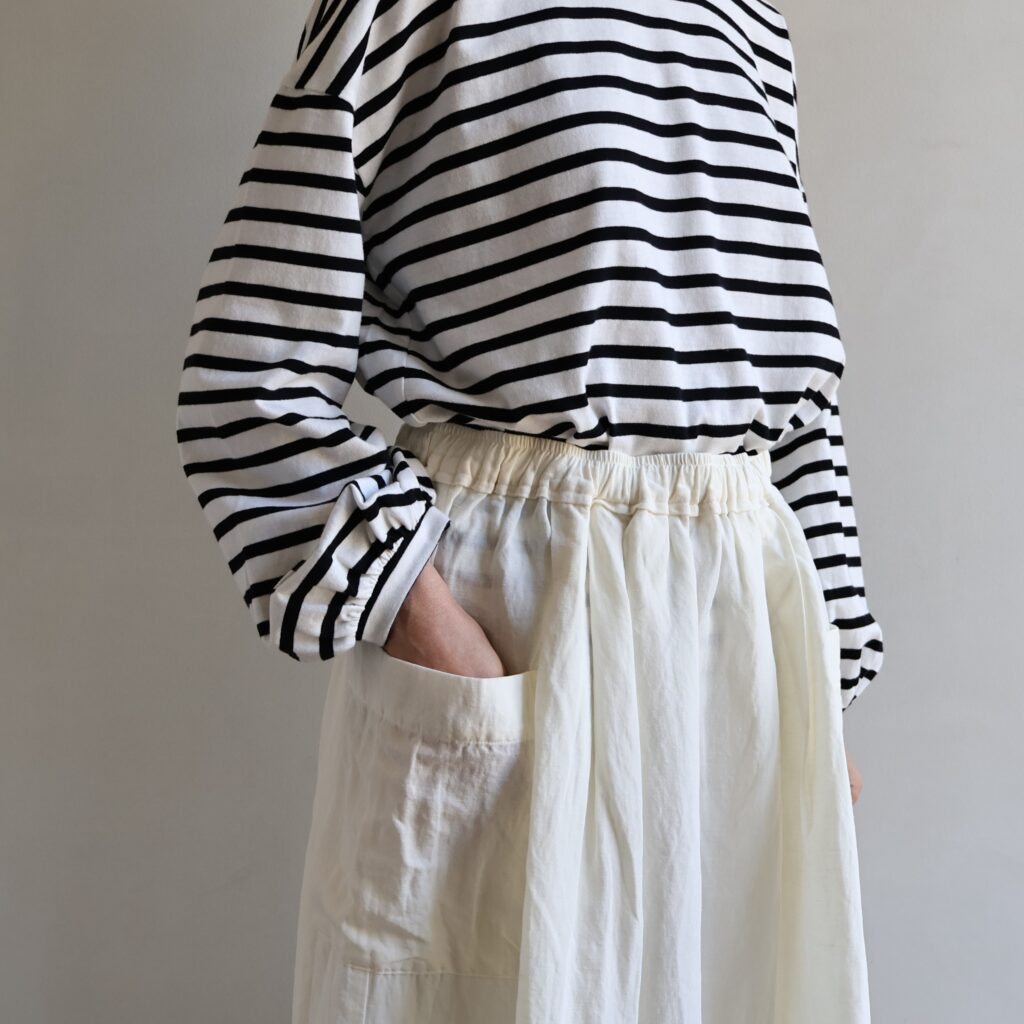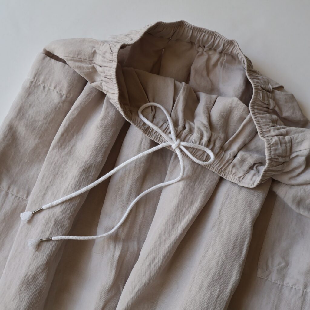 サイドに配された大きめのポケットが印象的なギャザースカート。広がりすぎないシルエットでトップスを選ばず着ていただけます。麻のさらりとした表情に綿のやわらかさをあわせ持つ、軽やかで肌なじみのよいビエラ素材を使用。洗いをかけることで生地に自然な膨らみと奥行きが生まれています。軽やかで日常にちょうどいい存在感。季節の装いをやさしく整えてくれる一枚です。