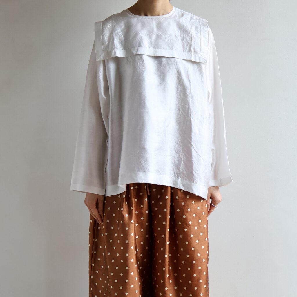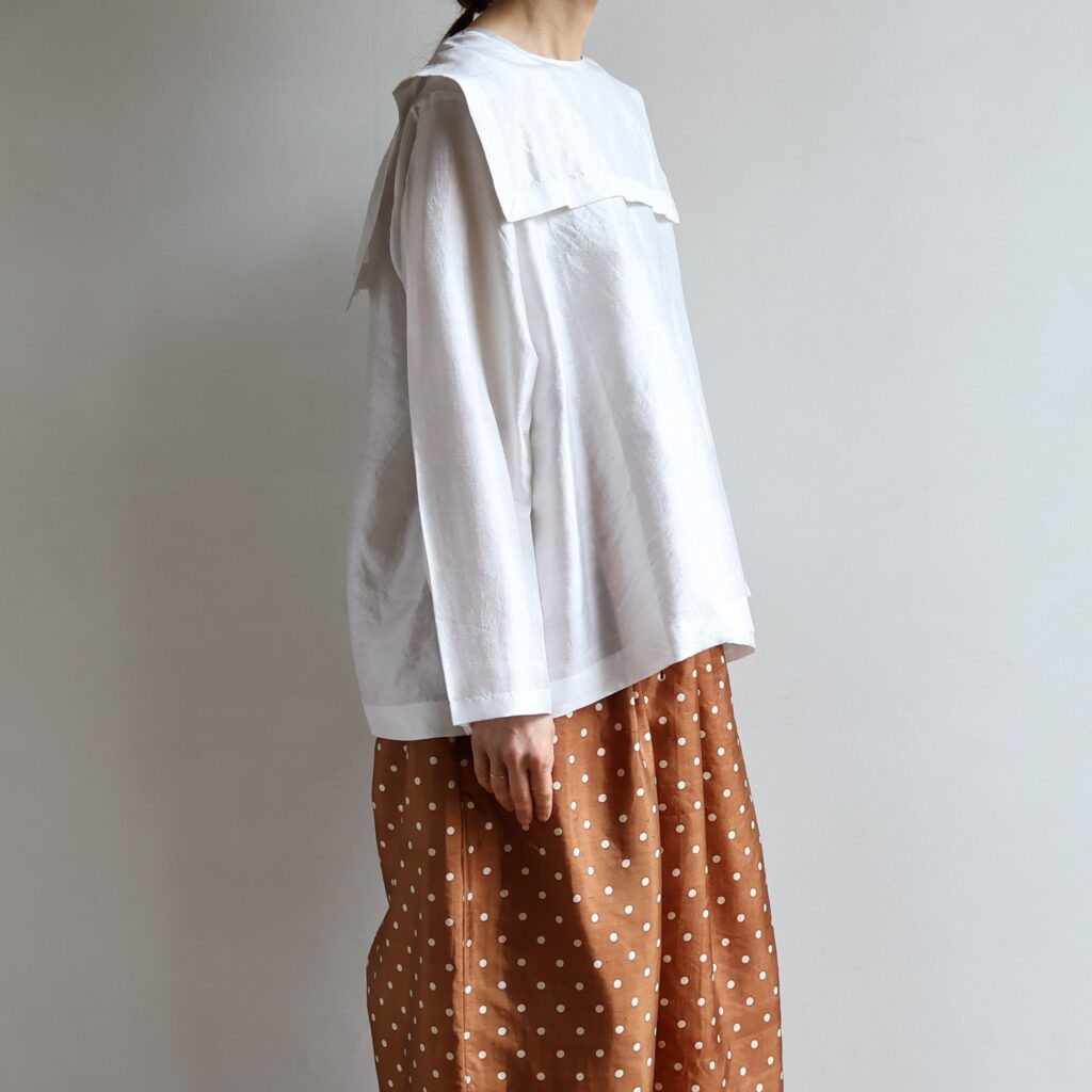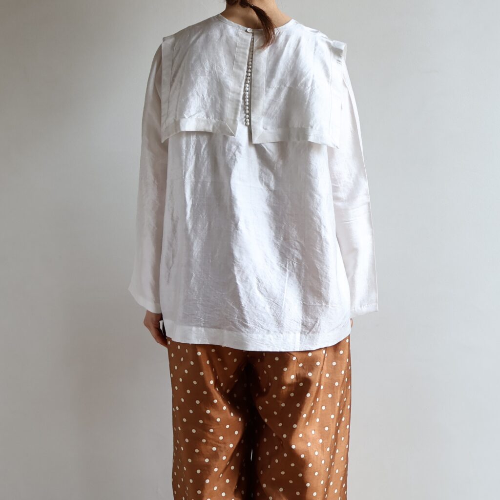 セーラーカラーが目を惹くプルオーバーブラウス。クラシックなデザインを、シルクの艶やかな質感とすっきりしたシルエットで仕立てています。可愛くなりすぎない、自然と大人の落ち着きにまとまる一枚です。背中に並ぶ小さなくるみボタンはさりげなく印象的。後ろ姿まできちんと美しく見せてくれます。ほどよいゆとりがあり、軽やかで心地よい着心地。パンツにもスカートにも合わせやすく、一枚でさらりと着るのはもちろん、カーディガンやベストから襟をのぞかせても楽しめます。