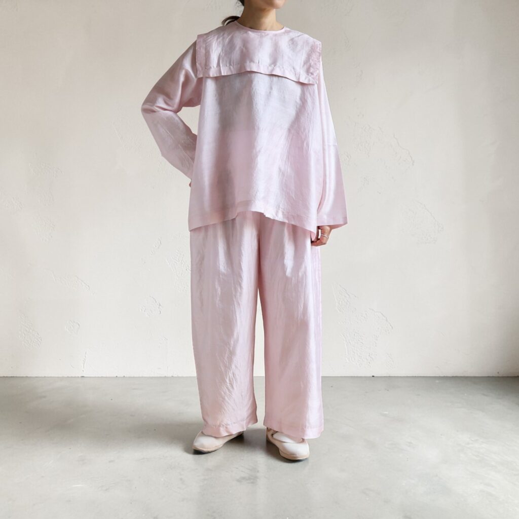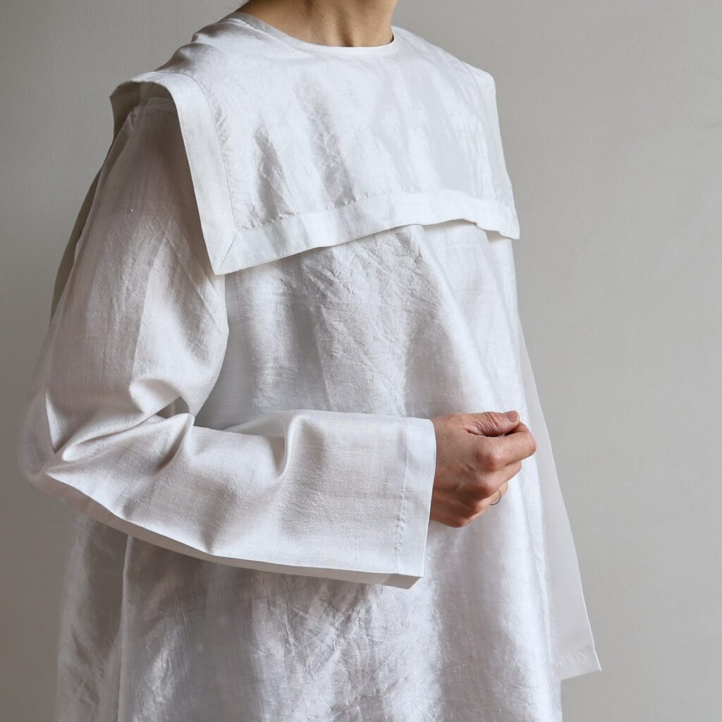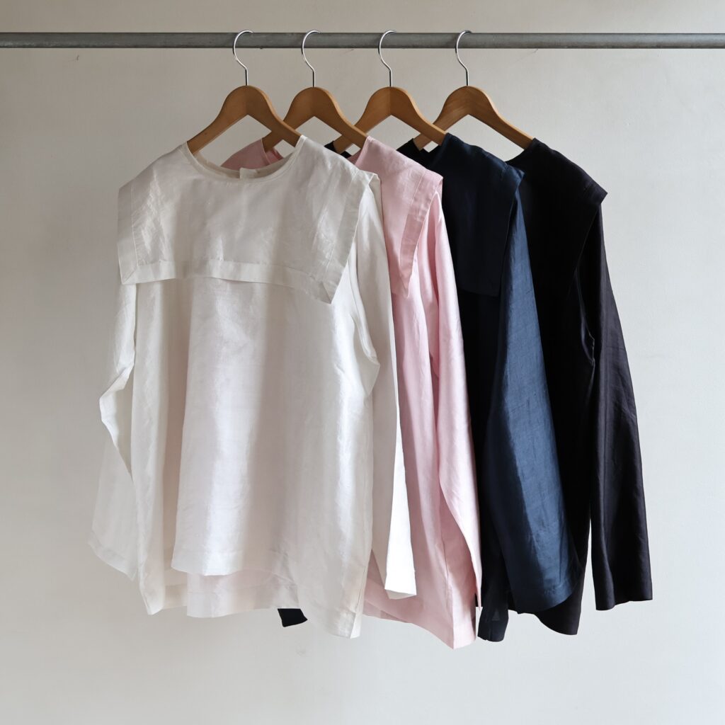 セーラーカラーが目を惹くプルオーバーブラウス。クラシックなデザインを、シルクの艶やかな質感とすっきりしたシルエットで仕立てています。可愛くなりすぎない、自然と大人の落ち着きにまとまる一枚です。背中に並ぶ小さなくるみボタンはさりげなく印象的。後ろ姿まできちんと美しく見せてくれます。ほどよいゆとりがあり、軽やかで心地よい着心地。パンツにもスカートにも合わせやすく、一枚でさらりと着るのはもちろん、カーディガンやベストから襟をのぞかせても楽しめます。