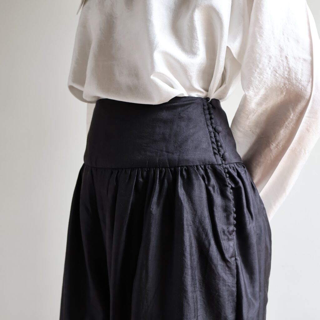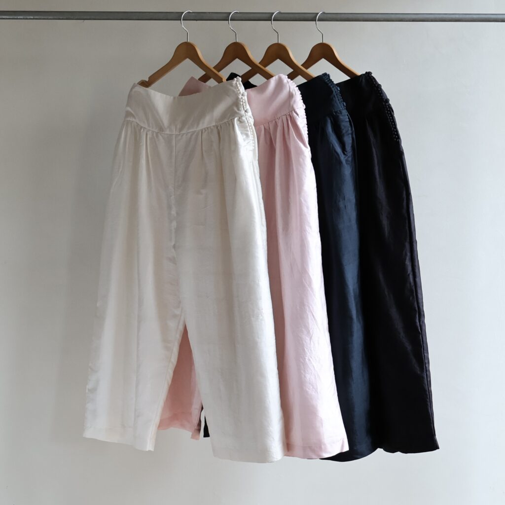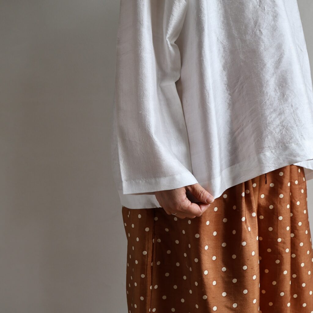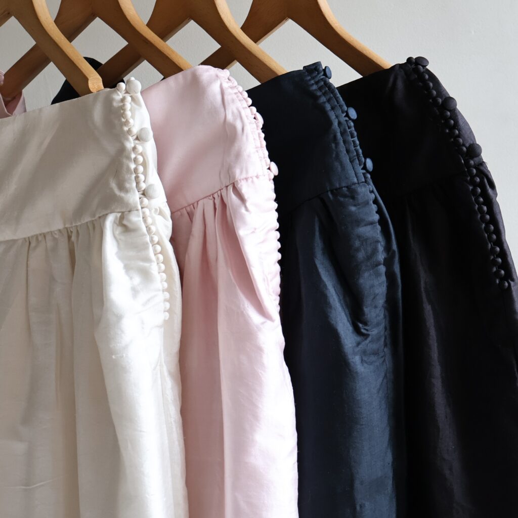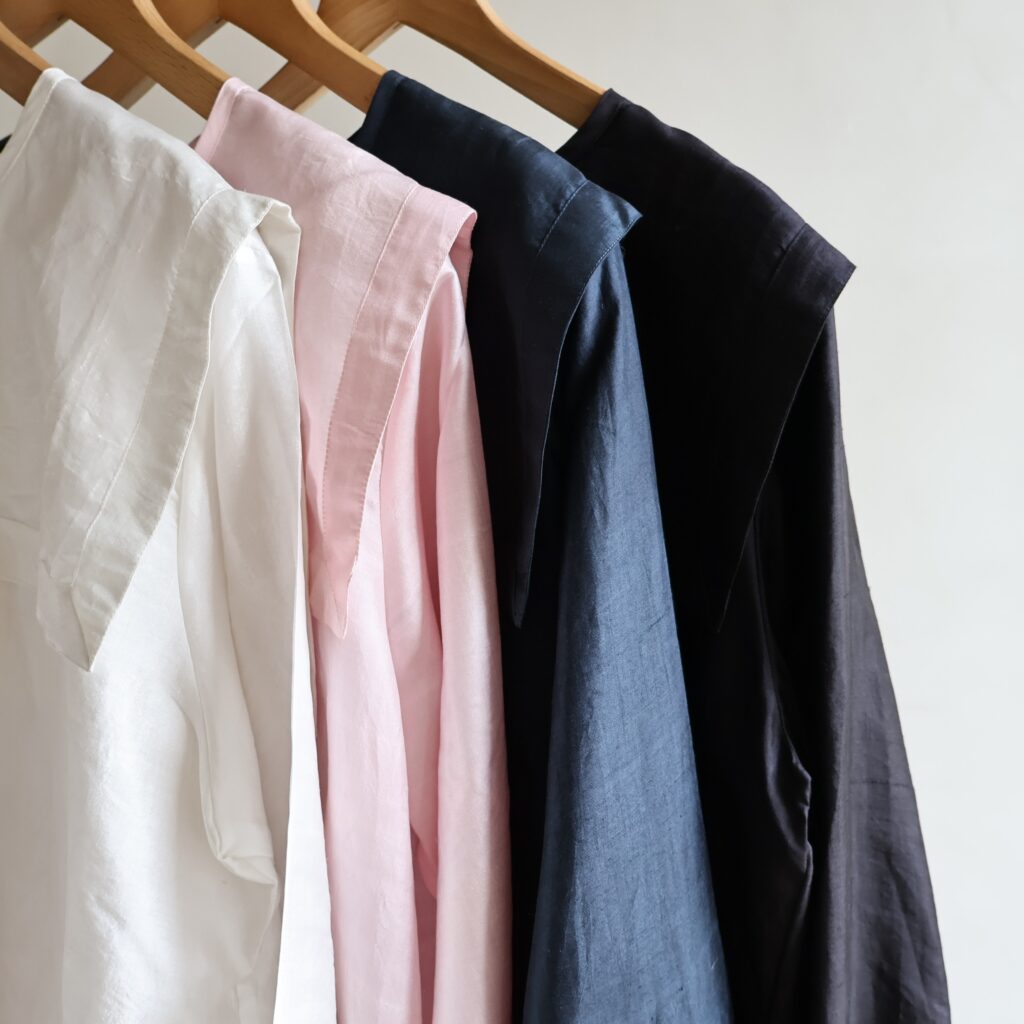 手紡ぎ・手織りで仕立てられたシルクは、軽く、やわらかく、空気を含むような落ち感。春から真夏まで心地よく着られる素材です。今季のシーズンカラーはローズウォーターとチャコール。ローズウォーターは水を含んだようなやわらかなピンク。チャコールは装いを引き締めてくれる落ち着いた色味です。