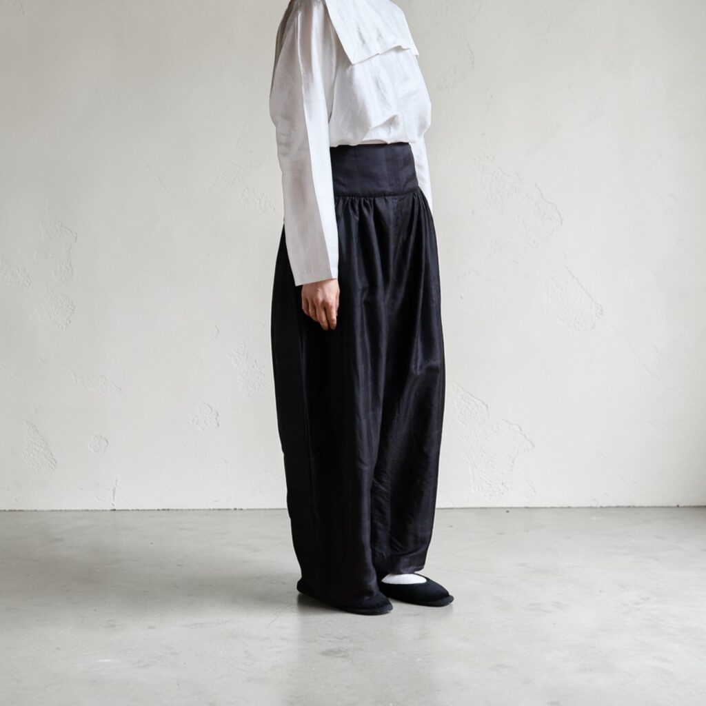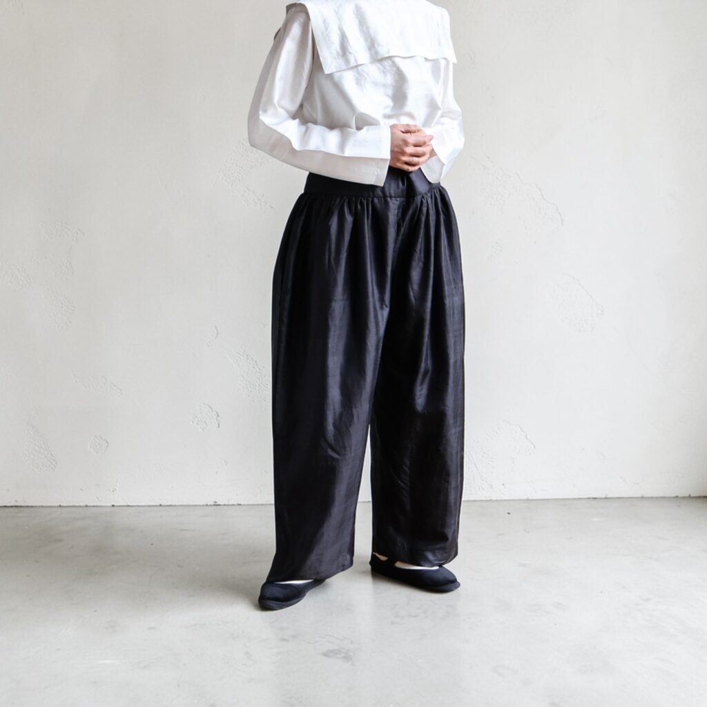 フロントの切り替えがベルトのように見える、ワイドシルエットのパンツ。腰まわりはすっきりと仕立てながら、後ろはゴムギャザー入りのイージー仕様で、リラックスした穿き心地です。ギャザーが生み出すやわらかな立体感が、シルエットにほどよい動きを添えます。ワイドシルエットですが、生地の落ち感があるため広がりすぎず、すとんと縦のラインがでるのも魅力です。裏地付きで透けを気にせず安心して穿けるのも嬉しいポイント。トップスをインすればウエストまわりのデザインが引き立ち、コーディネートもぐっと新鮮に。シンプルな装いに、ほどよい存在感をつけてくれる一本です。