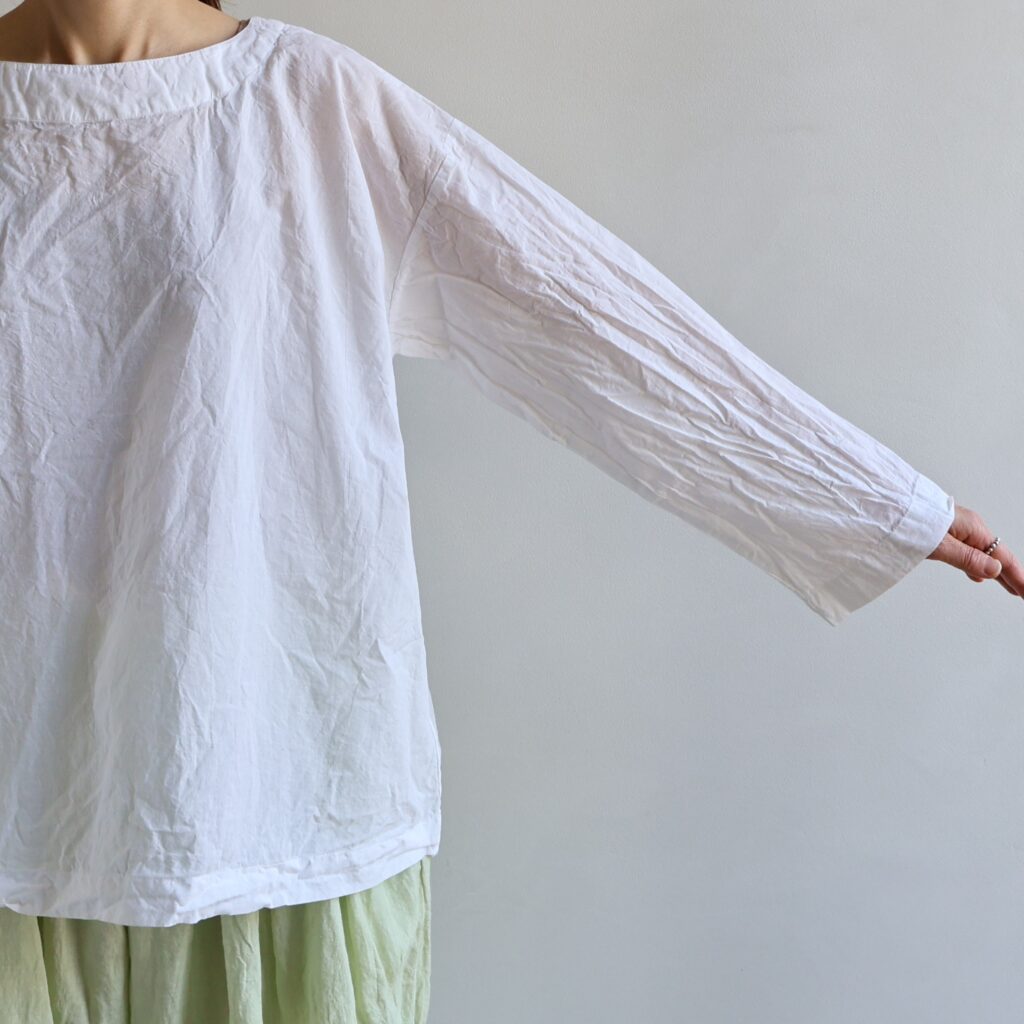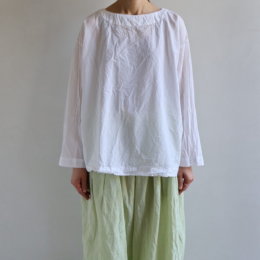 すっきり開いた襟周りが爽やかな印象のボートネックシャツ。ドロップショルダーと広い身幅、袖口がリラクシーな着心地です。細い糸を密度高く織り上げてたコットンローン生地は、ハンカチのように薄く驚くほど軽やか。肌に張り付かずさらりとした質感で、通気性にも優れているため、日差しが強くなる時期や、湿気が気になる日でも快適に過ごせます。パッとかぶるだけで動きやすいスモックは、普段使いにもぴったりなアイテムです。