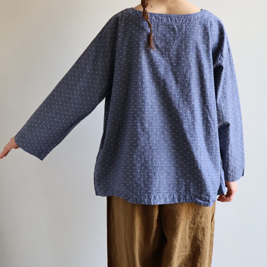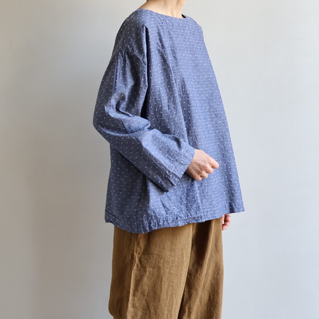 ワークウェアの定番ともいえるシンプルなスモック。顔まわりをすっきりと見せるボートネックとリラクシーなボックスシルエットが特徴です。適度なハリ感を持つコットンシャンブレーに、ドビー織りでドット柄を表現した表情豊かな生地。霜降りのような奥行きのあるシャンブレーの風合いに、立体的なドットを散りばめることで、無骨さを和らげた柔らかな印象に仕上げています。全体的にゆとりを持たせた設計ながら、生地の落ち感があるのでアウターを重ねてももたつかず、スッキリとした着こなしに。今の時期から季節を跨いで、ちょうど良いバランスでご愛用いただけます。