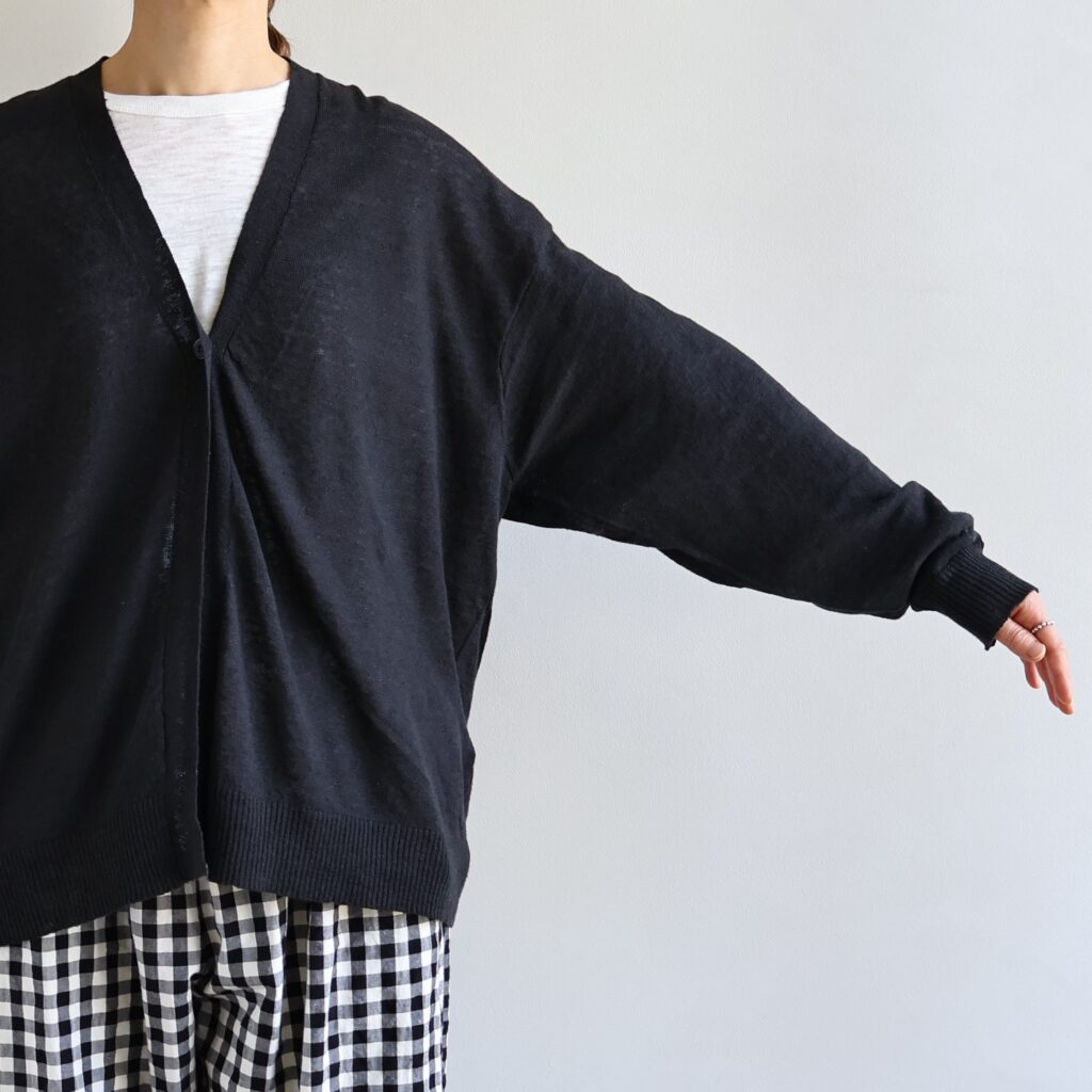 開放感のある深いVネックラインが、デコルテをスッキリと美しく見せてくれるカーディガン。細やかに編み立てた生地は、目がしっかりと詰まり、薄すぎず上品な肉感が特徴です。リネンの清涼感・ハリ感と、コットンの柔らかさ・吸水性がバランスよくミックス。生地に程よい弾力とハリが生まれ、ニット特有の型崩れやシワを抑えてくれます。コンパクトに畳んで持ち歩いてもシワが気になりにくく、冷房対策の羽織りとしてはもちろん、フロントを閉じてプルオーバーのように着こなすのもおすすめです。